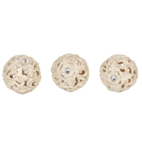 Scrolling acanthus leaf and floral designs swirl with elegance on the Openwork Orb Set. Made of resin, the orbs have a handpainted ivory finish with brushed gold accents and clear acrylic gems. Orbs are 4"dia.x4"H each; sold as a three-piece set.