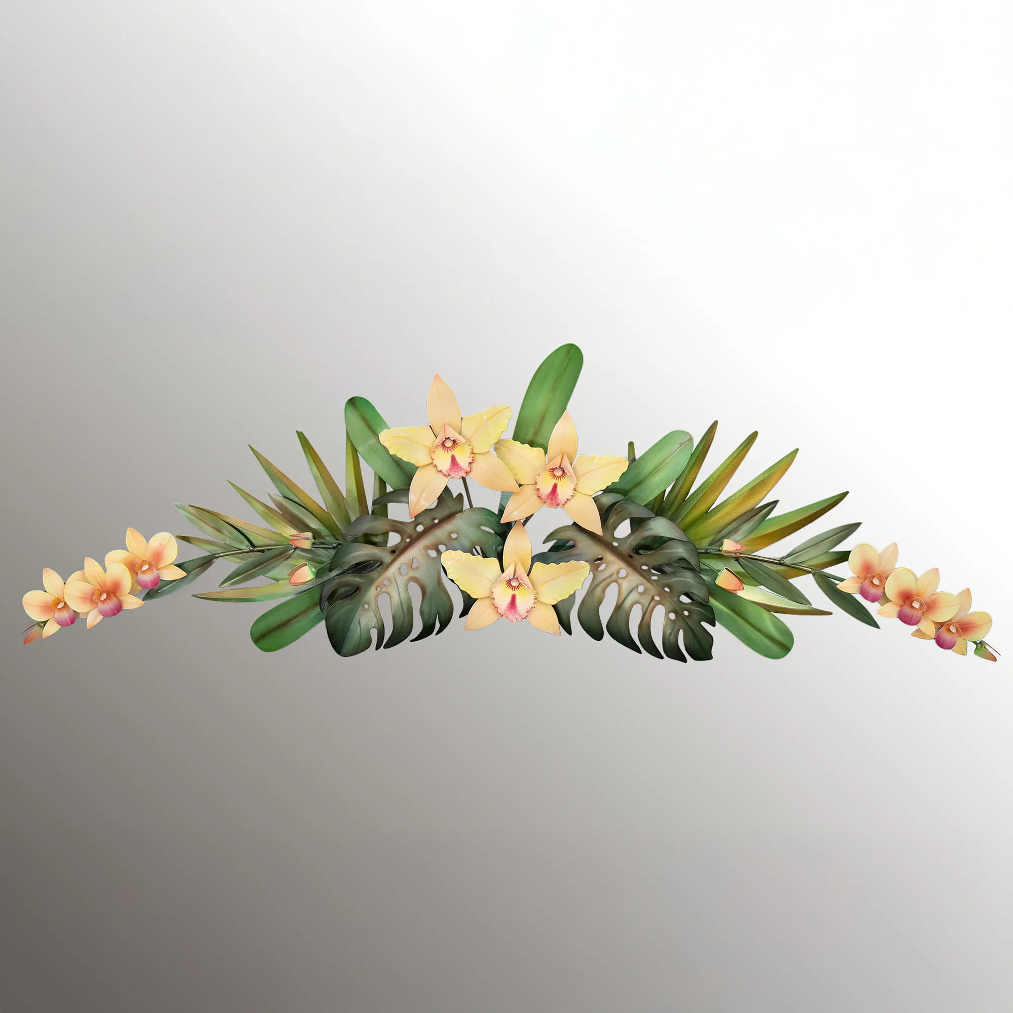 The Orchid Swag Wall Art crowns a doorway, canvas artwork, or framed photograph with exotic flair. Designed by artist Joanne Ferrara, the handcrafted stainless steel and metal wall art topper features hand-finished green and brown monstera and tropical palm leaves sprouting beautiful orchid flowers. Orange orchids have red accenting. White orchids have yellow accenting. Perfect for your indoor space, covered porch, or enclosed patio, the tropical flora artwork measures 40"Wx3"Dx14"H.