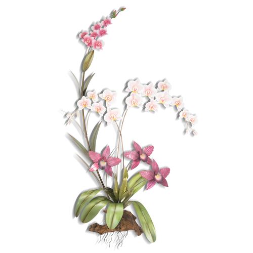The Pink Orchid Arrangement Floral Wall Sculpture blooms with exotic beauty. Designed by artist M. Malizia, the handcrafted wall art resembles a dimensional metal plant flourishing from a wood base. Blossoming in pink tones, the hand-finished orchids resemble Cattleya, Dendrobium, and Phalaenopsis varieties. Orchid wall art measures 28"Wx8"Dx47"H.