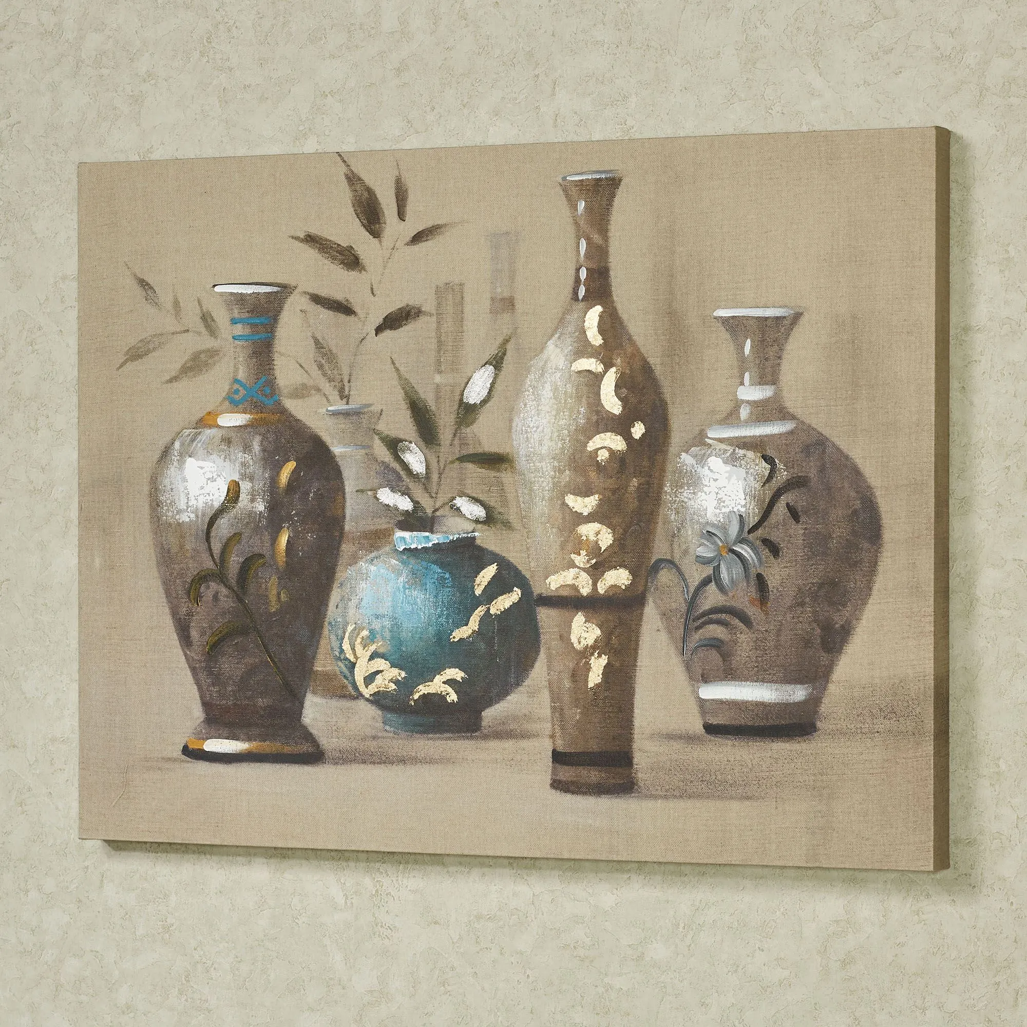 Decorative vases and bamboo are a visual portrayal of Oriental Impressions. This giclee on canvas wall art features different sizes of pottery with florals and leaves on a linen-colored background. Colors include turquoise, gray, white, ecru, gold, and silver. Wall art canvas has handpainted embellishments and is gallery-wrapped over a wood frame. Wall art measures 40"Wx2"Dx30"H.