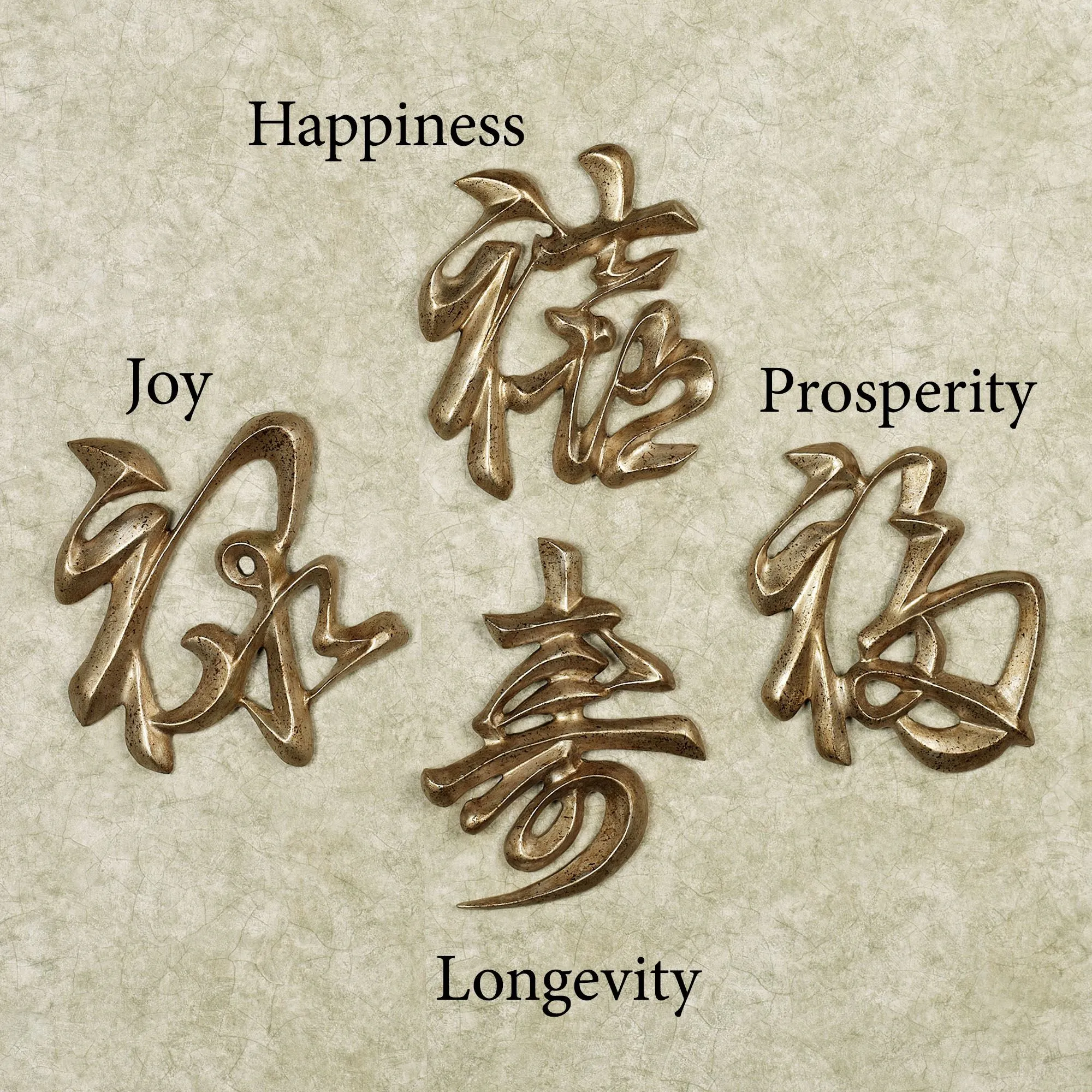 The Oriental Symbol Wall Plaque Set depicts ancient Chinese characters for Happiness, Prosperity, Longevity, and Joy. Resin wall art adds Asian flair to any room and brings luck to your home. Finished in antique gold, each plaque measures approx. 7"x9".