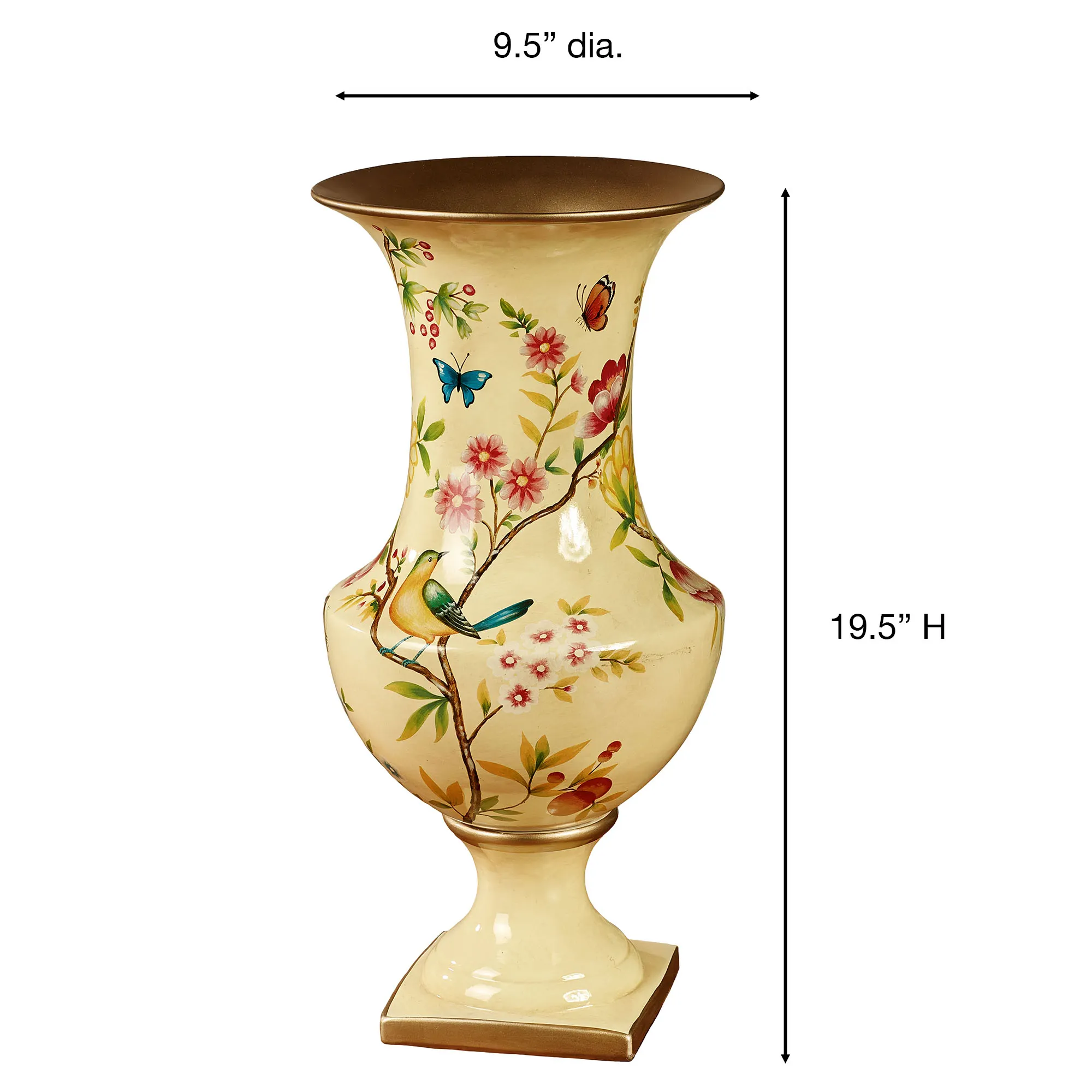 Flourishes of spring, including birds, flowers, and butterflies, beautifully enrich the sweetness of the Oriole Vase. Ceramic accent has a square base, gold trim, and handpainted shades of pink, blue, and green on a light gold background. For decorative use only. Measures 9.5"dia.x19.5"H.