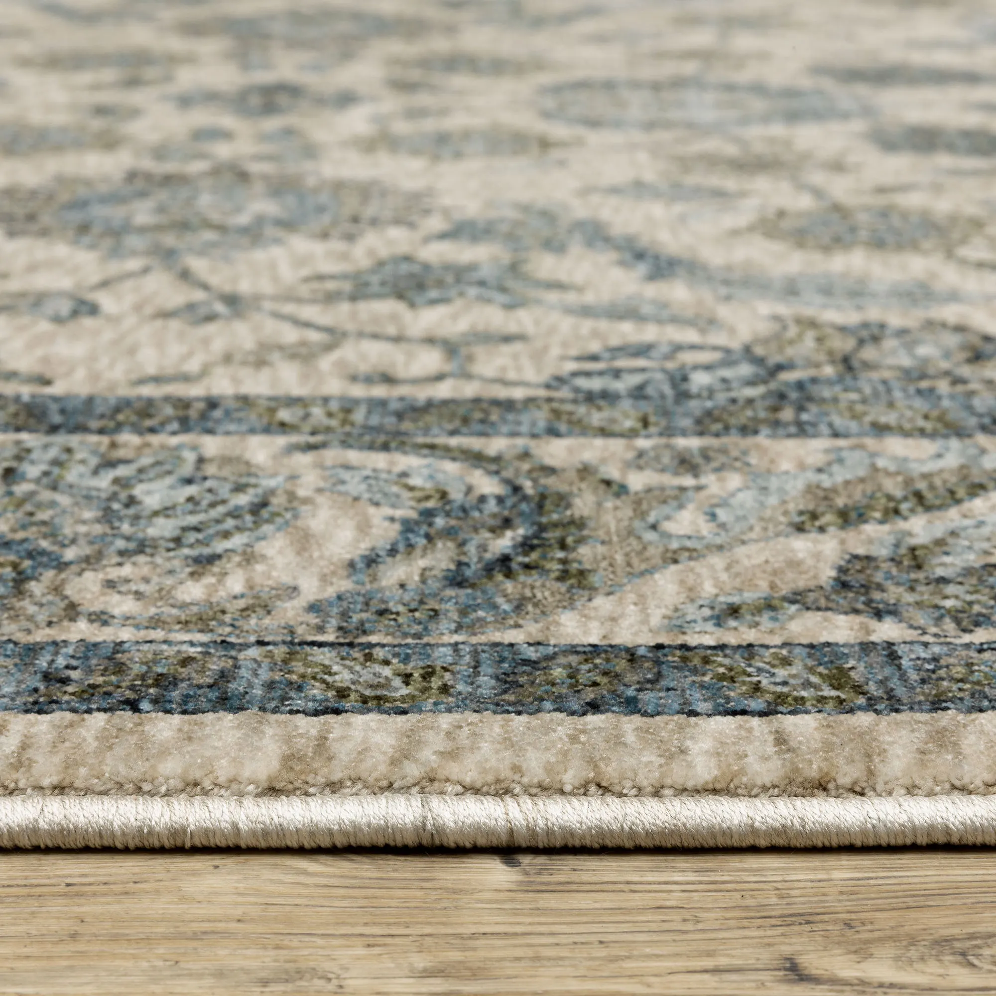 Traditional style blooms upon the Orsman Beige Area Rug. Power-loomed from polyester, the .24" thick rug features classic vining Jacobean florals, flourishing acanthus leaves, detailed borders, and .5"L ivory fringed ends. The beige coloration has an ivory and beige ground with light blue, dark blue, gray, black, and green hues. Backing is woven polyester. We recommend professional cleaning by a rug cleaner. Imported.