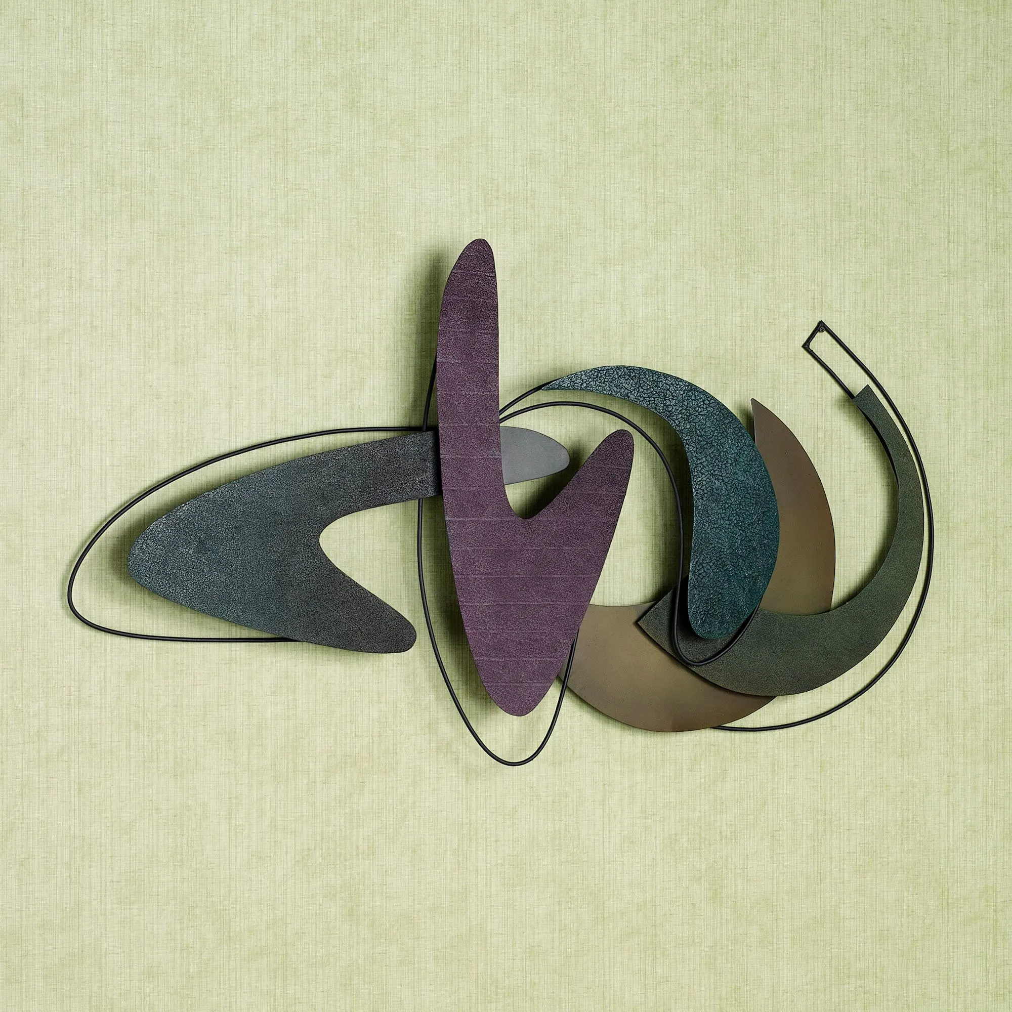The handpainted Overturned II Metal Wall Sculpture will definitely turn heads. The colorful handcrafted contemporary geometrics feature black outline shadows tracking the movements of the abstract art. Metal wall sculpture has green tones with purple and olive accents. Measures approx. 50"x28"; weighs 19 lbs. (C)2006 Touch of Class(R).