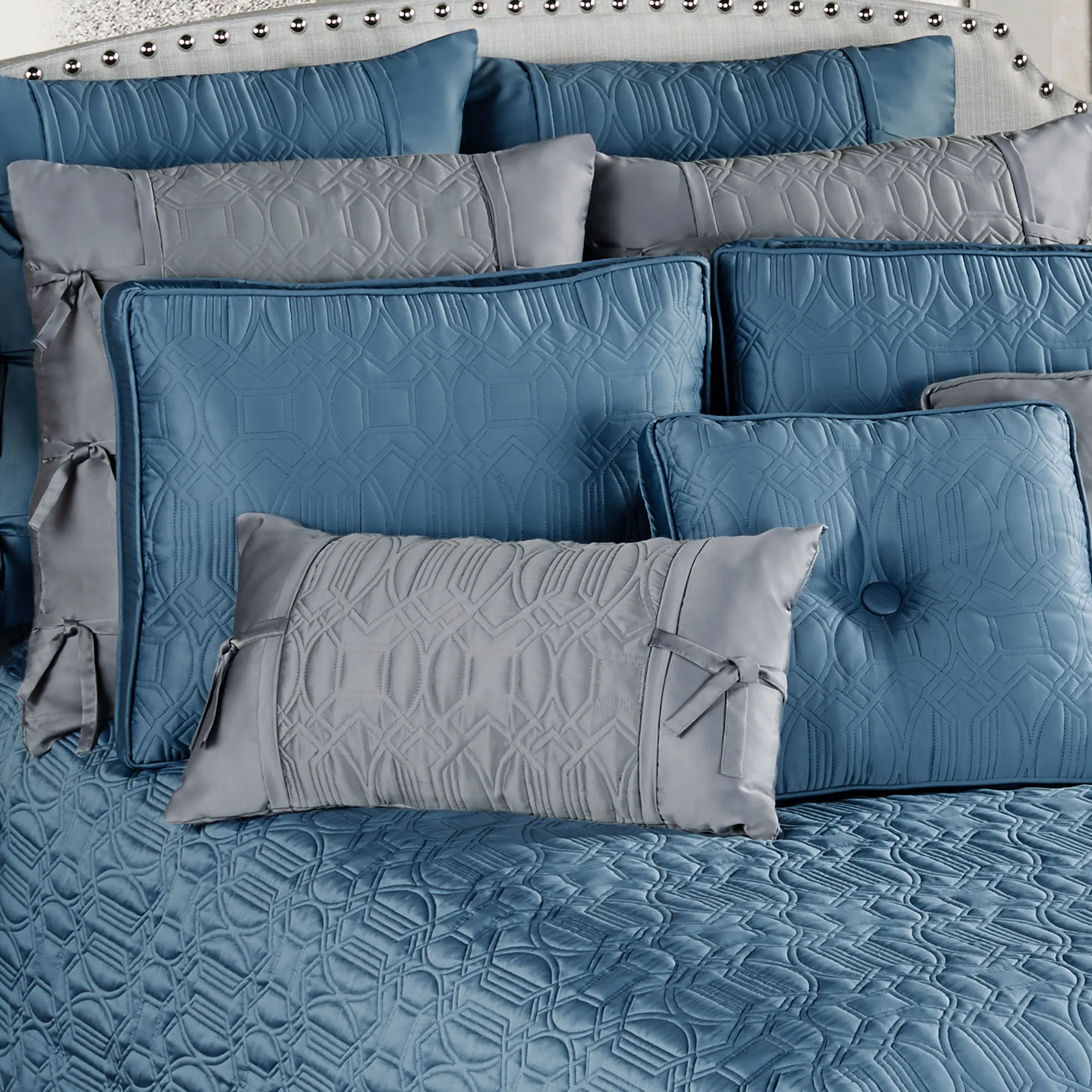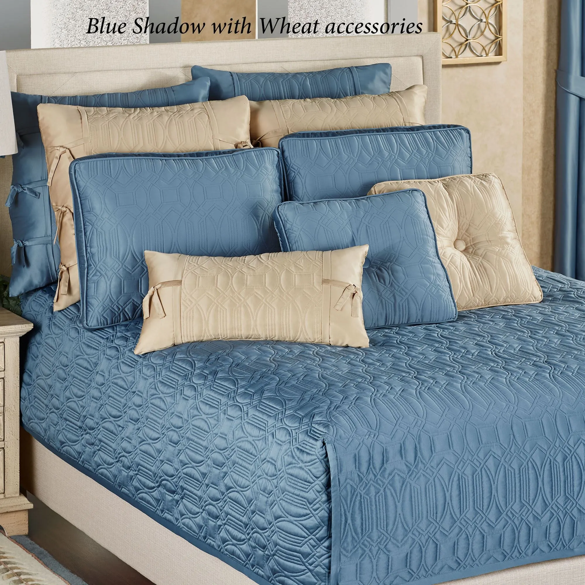 The blue shadow Oxford Classics Mini Coverlet Set includes an oversized coverlet and shams. This polyester matte satin coverlet features a luxuriously quilted geometric design and dimensional texture. Coverlet has a waterfall fitted style and tack stitching on the sides. The tucked bottom corners are covered neatly. Back is color-matched brushed polyester microfiber satin. Fill is polyester. Machine washable. Imported.