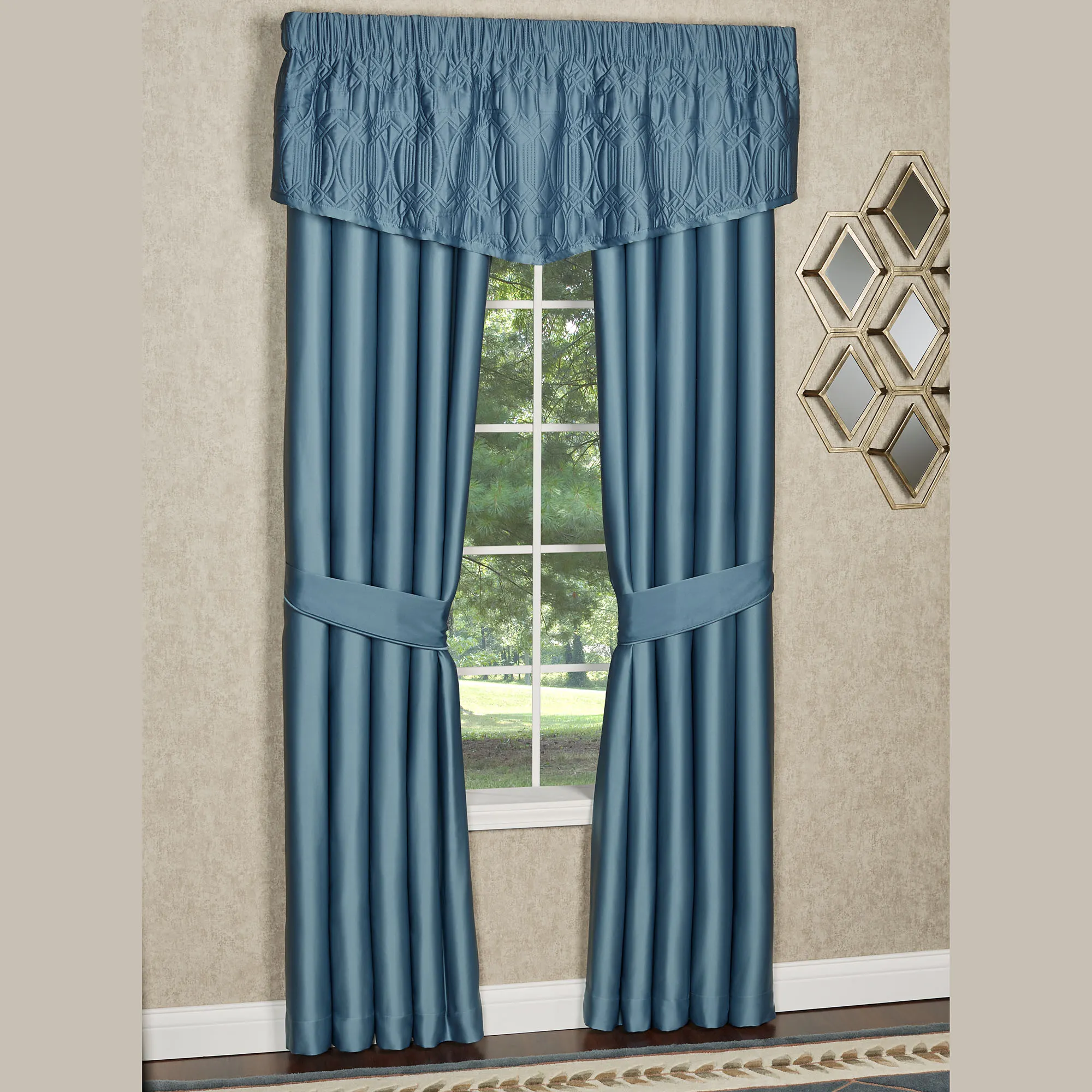 Window Treatment: The solid color, polyester microfiber satin Cambridge Classics Curtains have a 3.25" rod pocket. Lined curtains include tiebacks. The tailored Valance has geometric quilting, bound ends, and a 3" rod pocket.