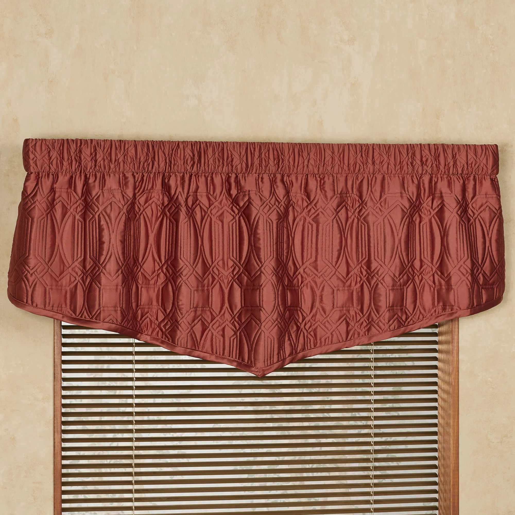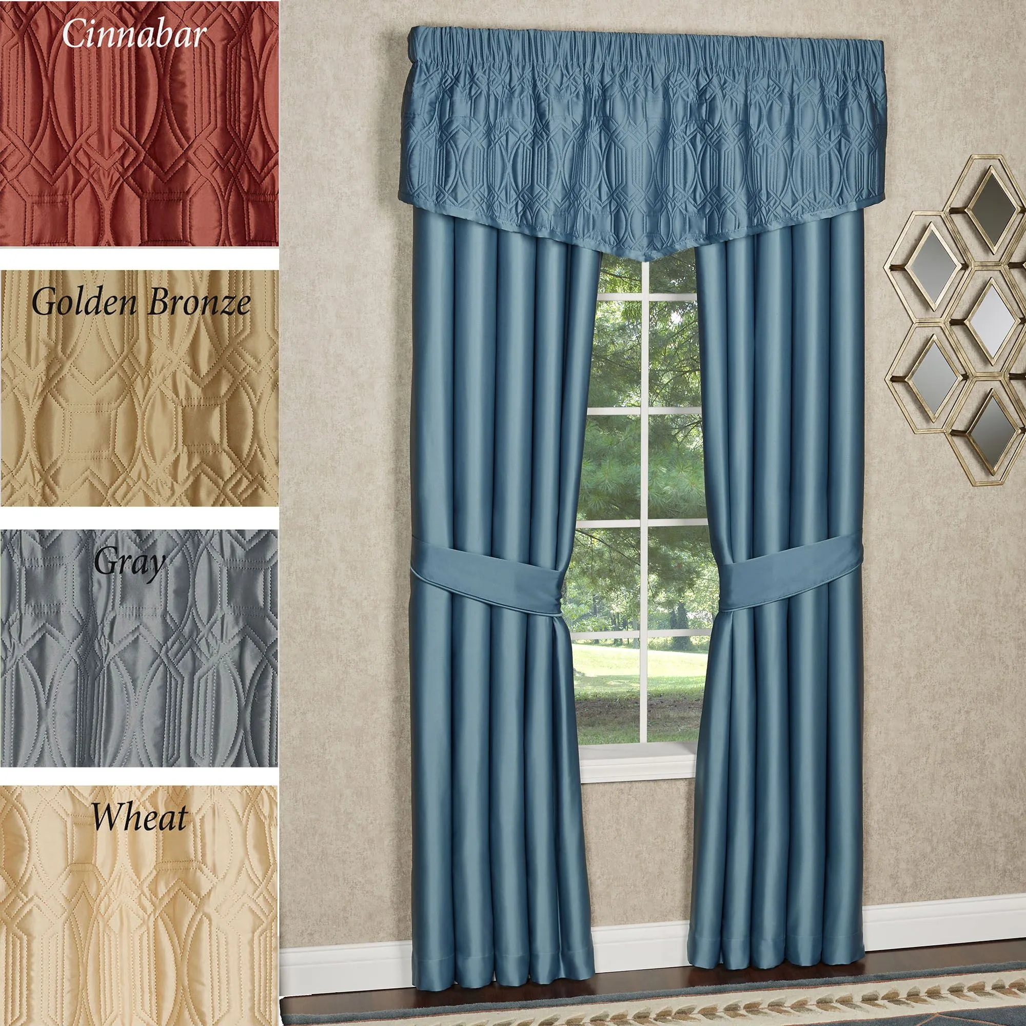 The Oxford Classics Window Treatment has a timeless look. Specify Valance or Curtain Pair. The tailored, polyester matte satin Valance features a luxuriously quilted geometric design and dimensional texture. Valance has bound ends and a 3" rod pocket. The solid color, polyester microfiber satin Cambridge Classics Curtains have a 3.25" rod pocket. Lined curtains include tiebacks. Choose Blue Shadow, Cinnabar, Warm Gray, or Wheat; curtains are also available in Aqua Mist and Golden Bronze. Machine washable. Imported. The curtain pair width is the total width of two panels together.