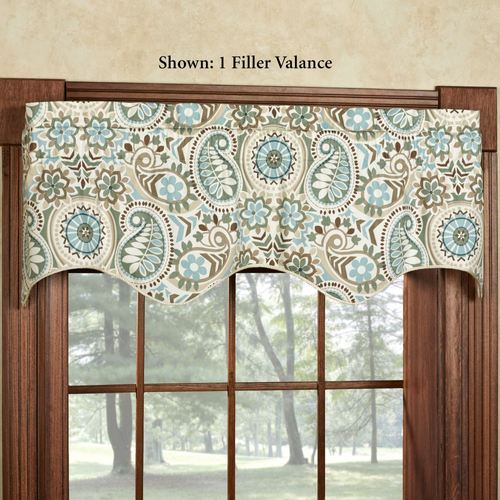 The pretty Paisley Prism Window Valance will add exotic greatness to your widow. Lined, cotton valance features paisley designs, prisms, and floral motifs on a light cream background. Twist cording accents the bottom edge. Colors include light blue, sage, latte, taupe, and light taupe. Filler valance has a 3" rod pocket and is 50"Wx15"L. Dry clean only. Made in Pakistan.