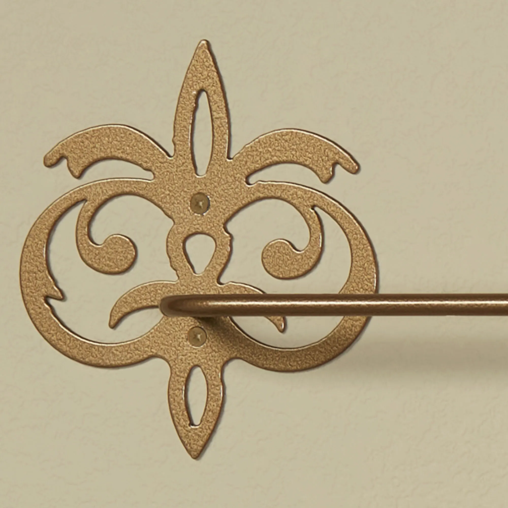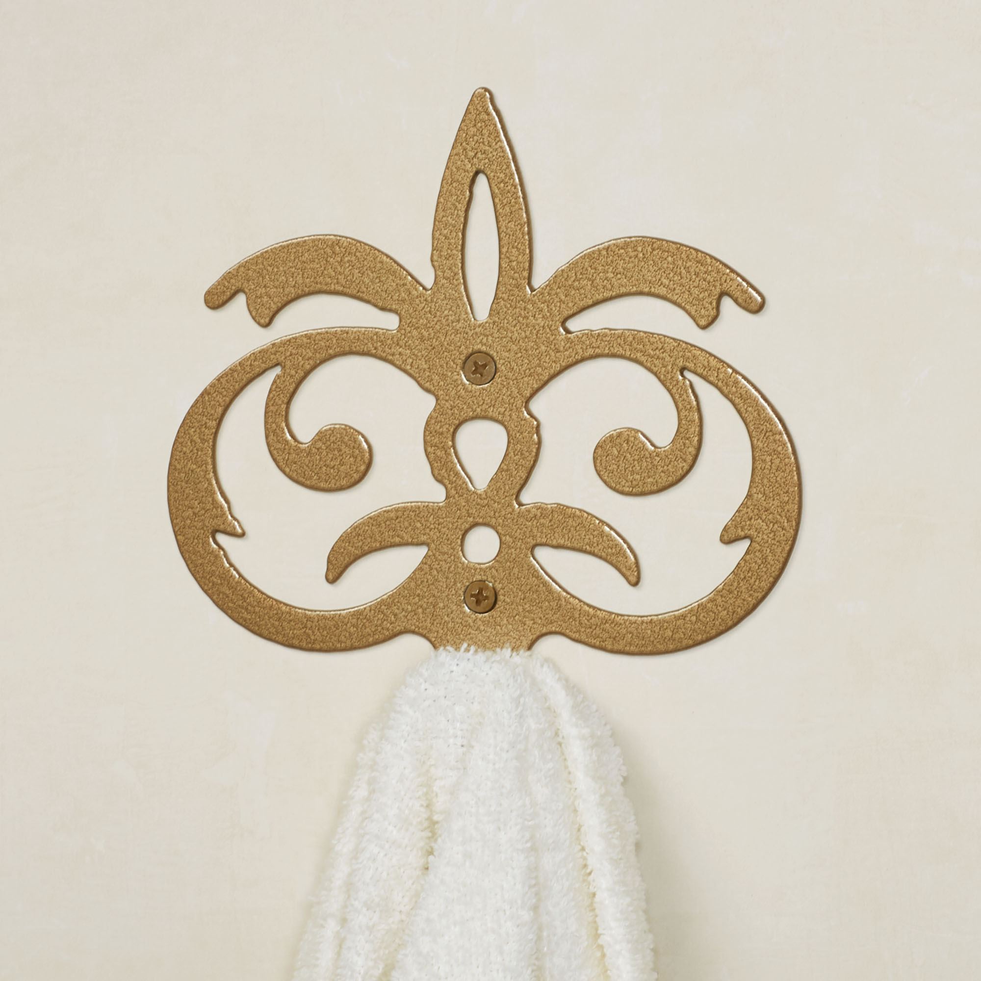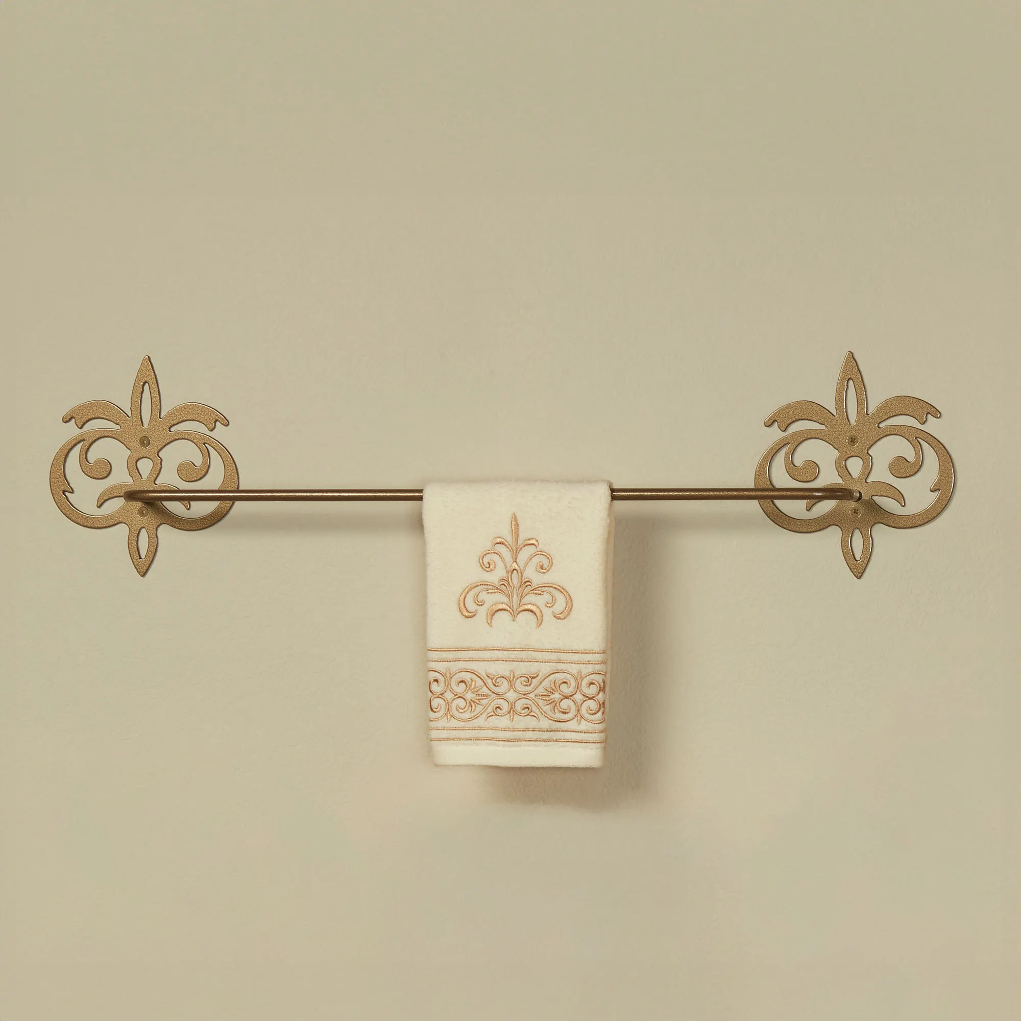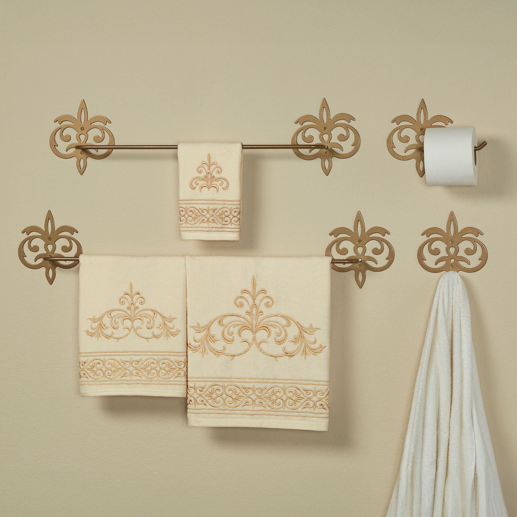 Outfit your space like a Palace with these bath wall fixtures designed by JasonW Studios(R). Proudly handcrafted in the USA by American craftsmen, each precision-cut, 14-gauge steel design features a lovely stylized fleur-de-lis motif and gold powder-coat finish. Towel Bar keeps your towels neatly displayed; each is 3"Dx7.5"H. The 24" Towel Bar is 30"W overall. The 30" Towel Bar is 37"W overall. Wall Hook holds your towel, robe, or other hanging items; measures 6.5"Wx1.5"Dx7"H. Toilet Paper Holder fits up to a mega roll; measures 10"Wx3.5"Dx7.5"H. (C)2023 Touch of Class(R).