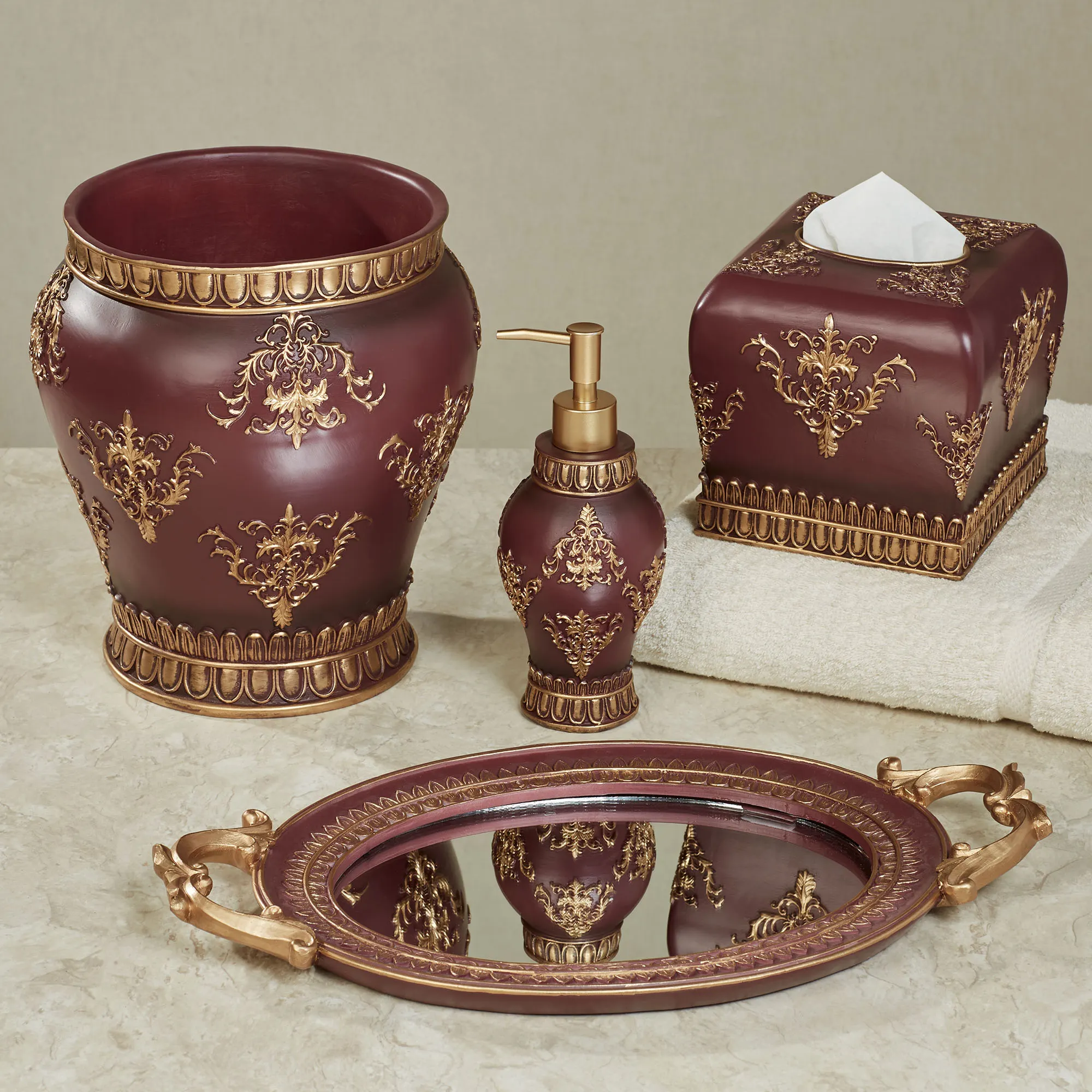 Grand elegance is beautifully displayed with the Palecia Burgundy Bath Accessories. These resin accessories have gold designs and a solid burgundy background. Lotion/Soap Dispenser is 3.5"dia.x8.5"H. Tissue Cover is 6.5"sq.x6"H. Wastebasket is 9"dia.x10"H. Vanity Tray has acanthus leaf handles and a 10"x7" mirrored glass bottom; measures 17"Wx10"Dx1.5"H overall.