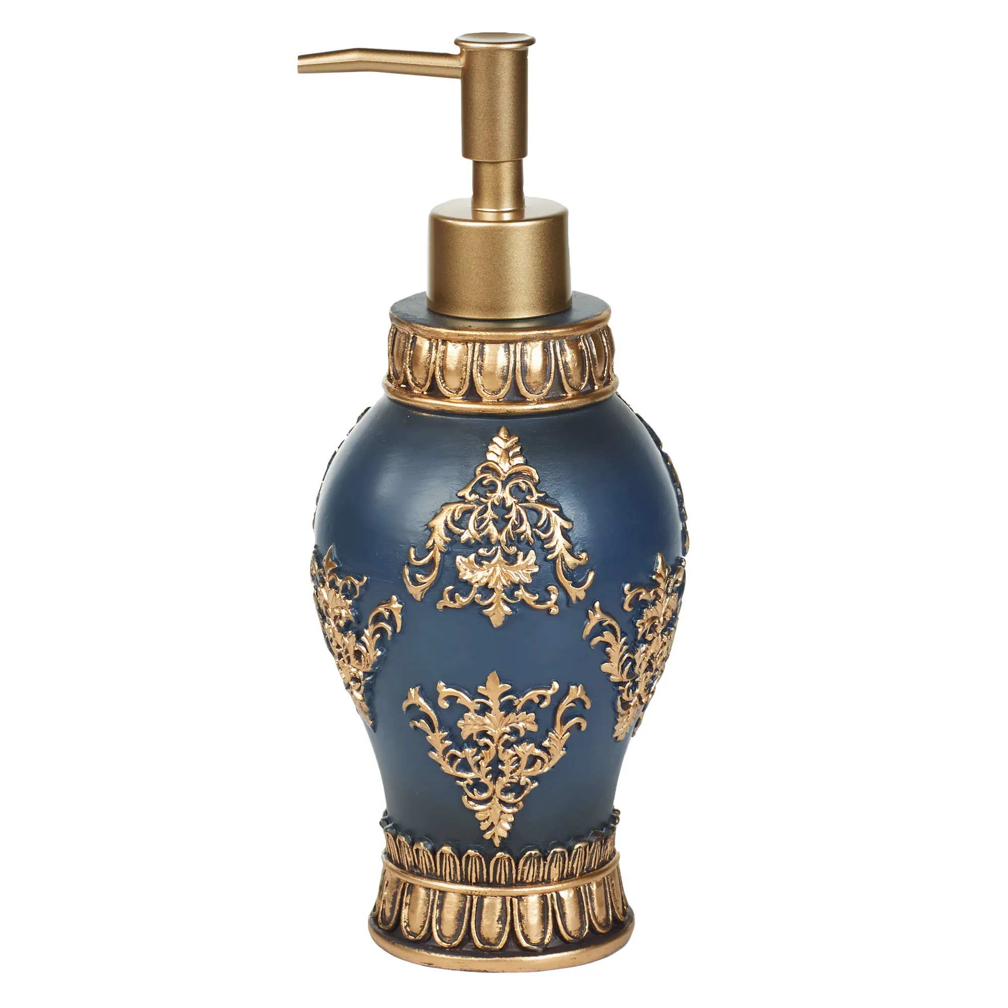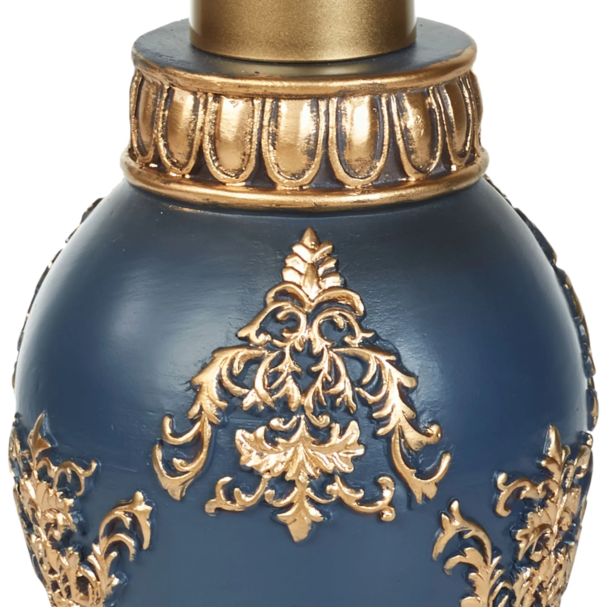 Grand elegance is beautifully displayed with the Palecia Navy Bath Accessories. These resin accessories have gold designs and a solid navy background. Lotion/Soap Dispenser is 3.5"dia.x8.5"H. Tissue Cover is 6.5"sq.x6"H. Wastebasket is 9"dia.x10"H. Vanity Tray has acanthus leaf handles and a 10"x7" mirrored glass bottom; measures 17"Wx10"Dx1.5"H overall.