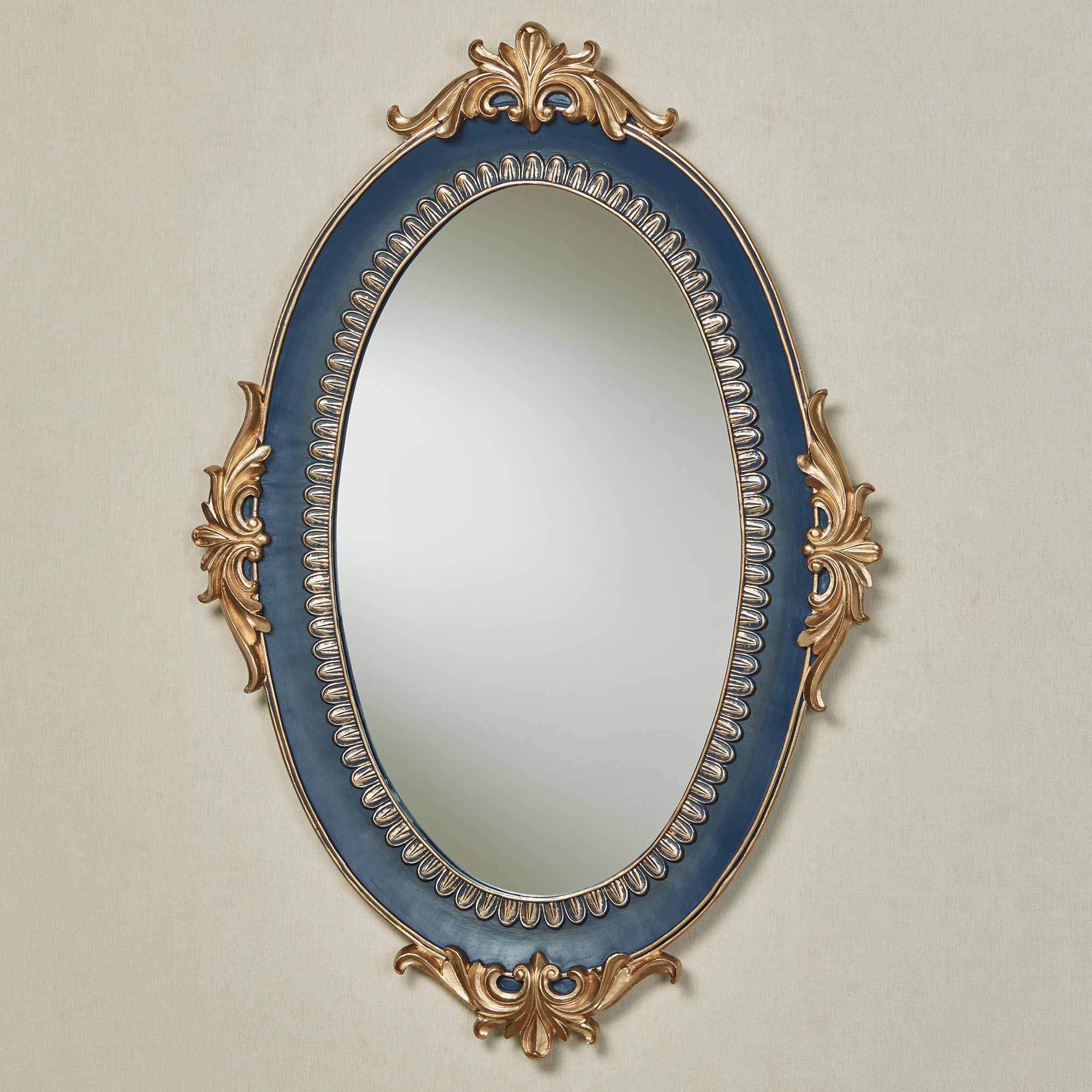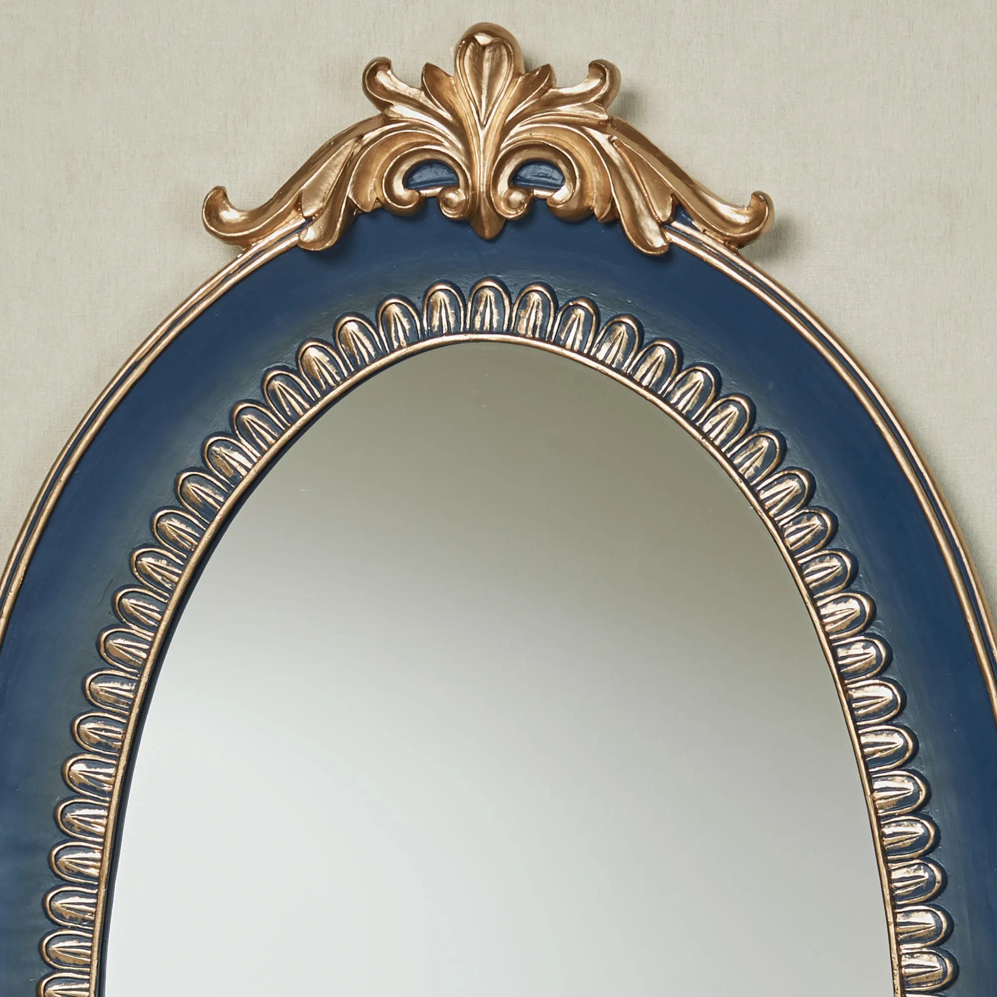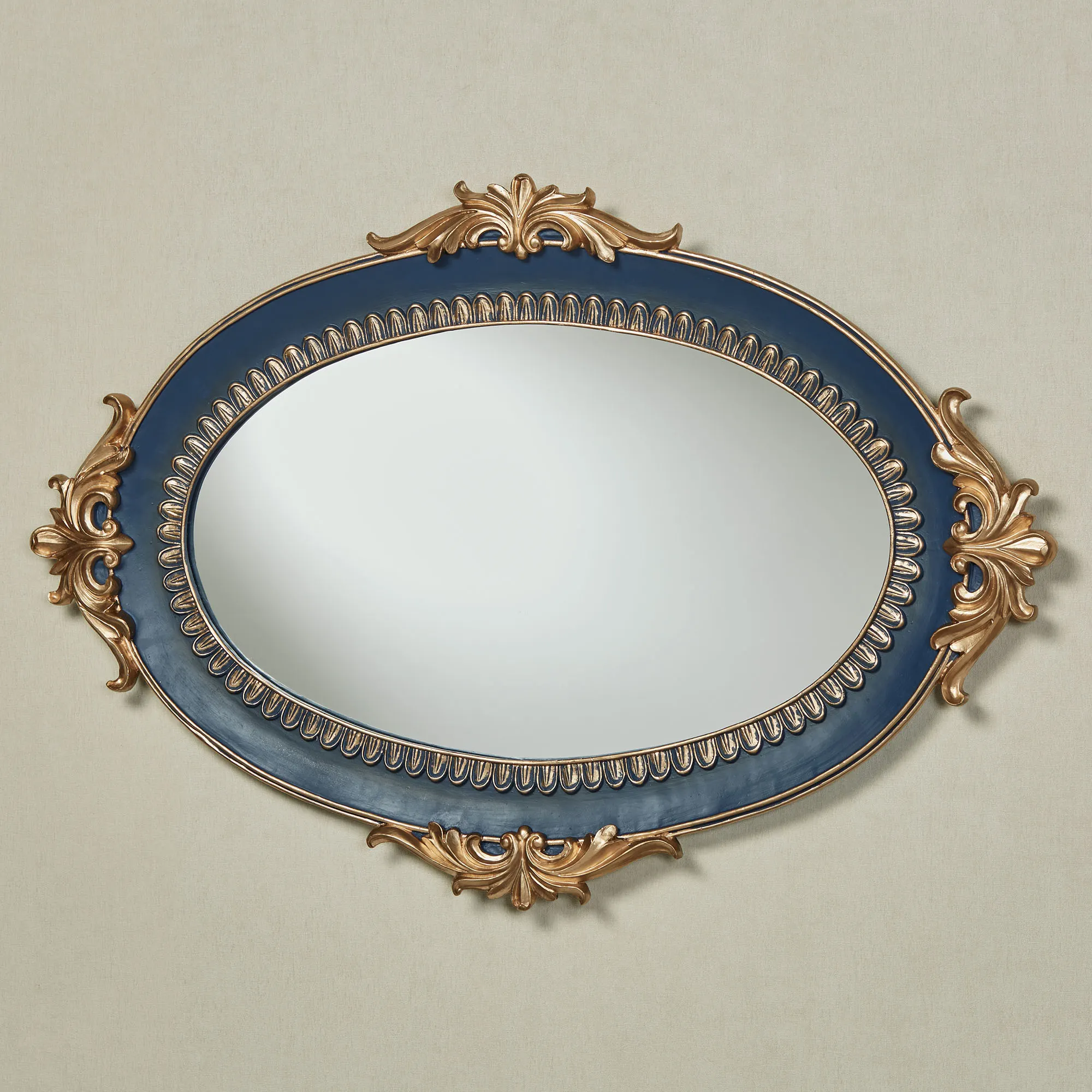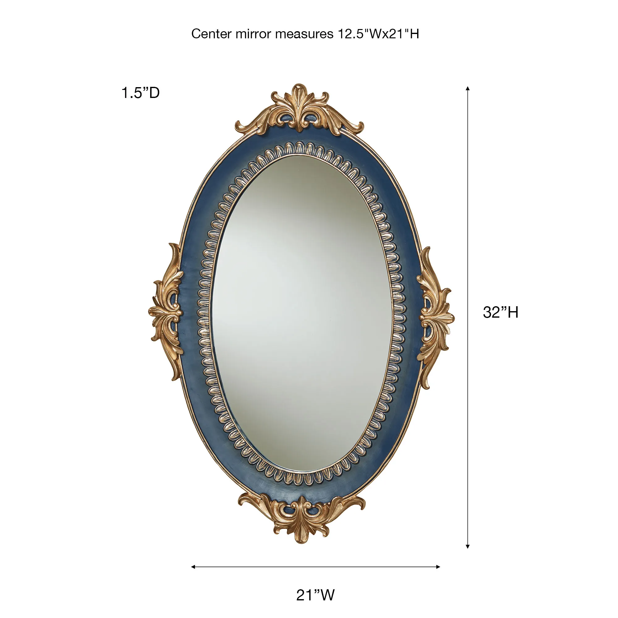 The Palecia Navy Oval Wall Mirror reflects a lovely allure. Finished in a solid navy, the beautiful resin frame features golden detailing and flourishing acanthus leaves that surround the oval glass mirror. Center mirror measures 12.5"x21". May hang vertically or horizontally. Overall, the wall mirror measures 21"Wx1.5"Dx32"H.