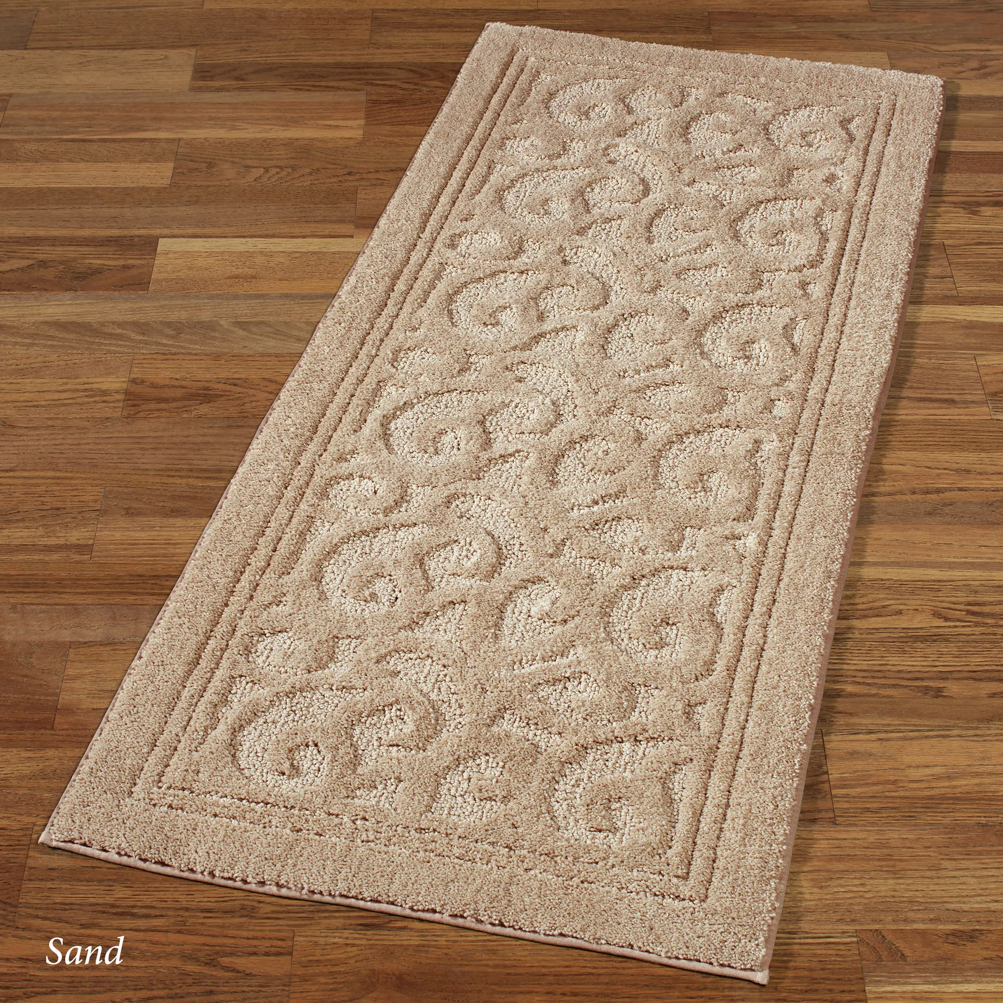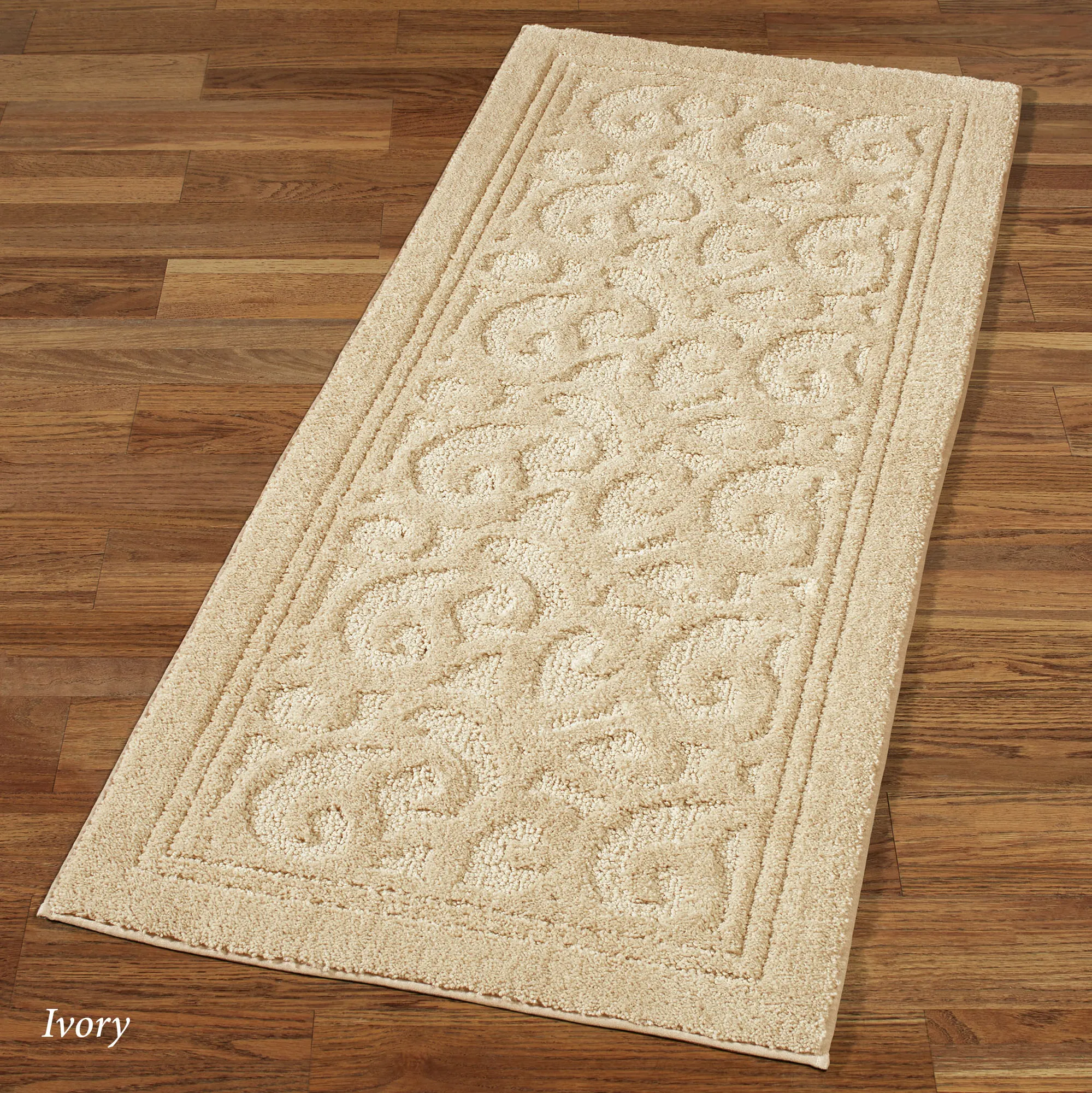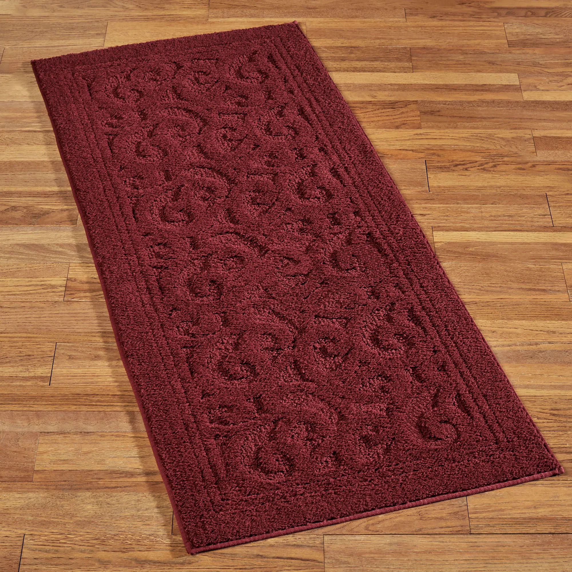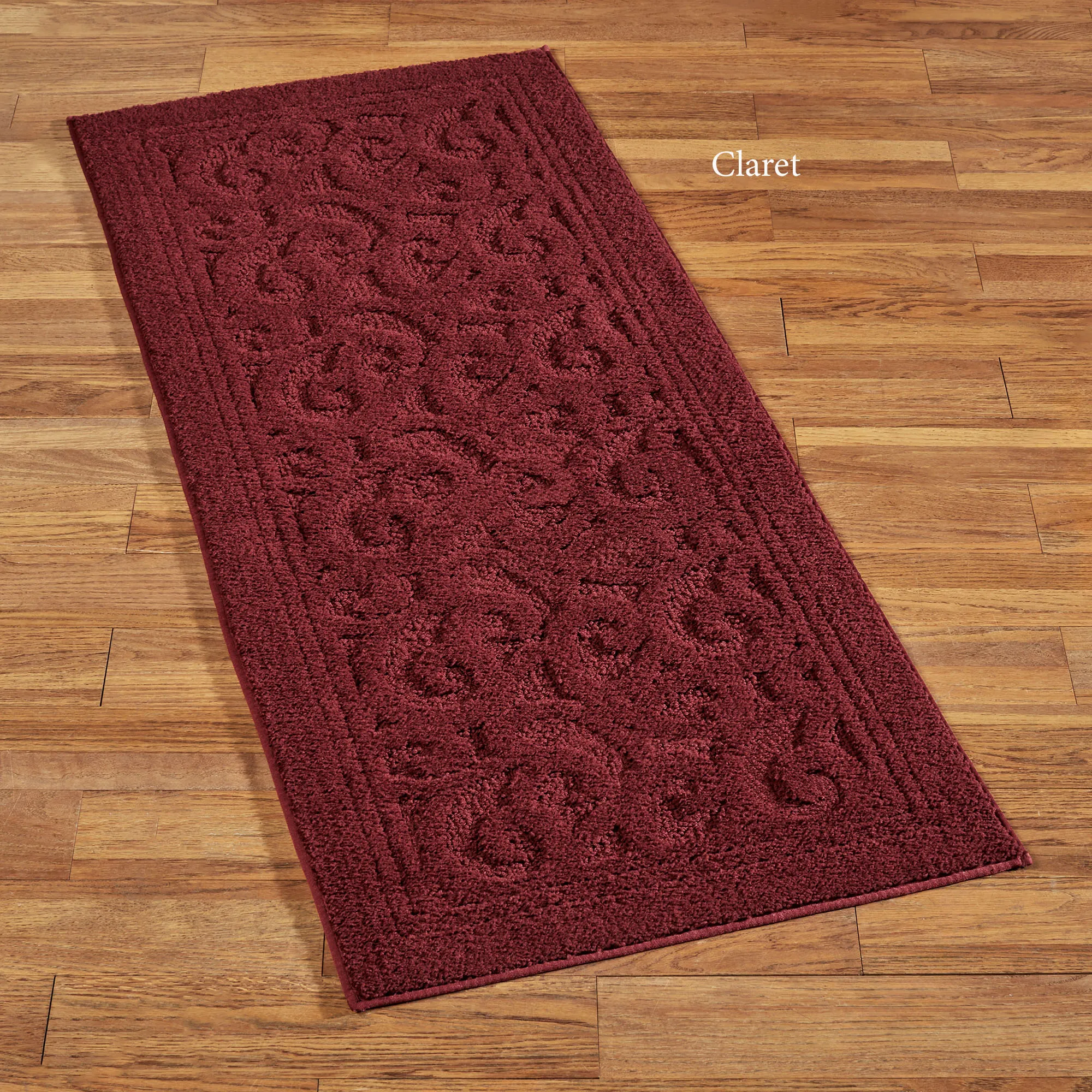 The Palermo Rug adds a charming touch with intriguing tone-on-tone sculpted scrollwork. Crafted from a super-soft micro polyester, the .5" thick, solid color rug features a rich touchable texture, scrolls, and a double frame. Backing is slip-resistant thermoplastic rubber. Machine washable. Do not vacuum. Imported.