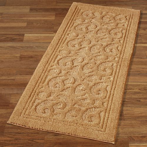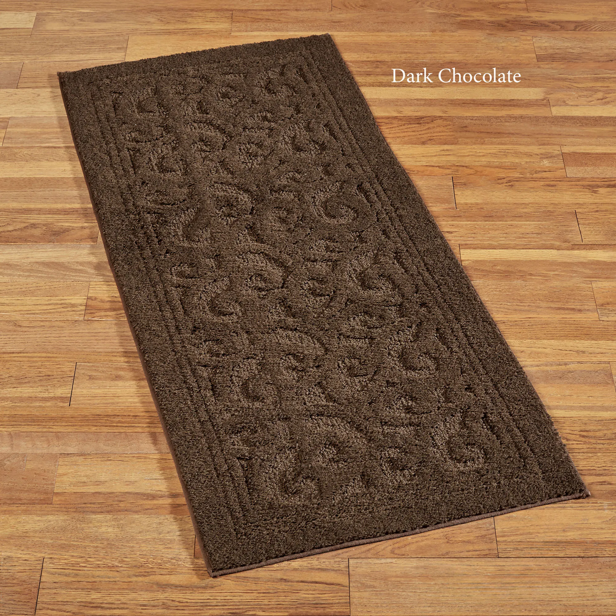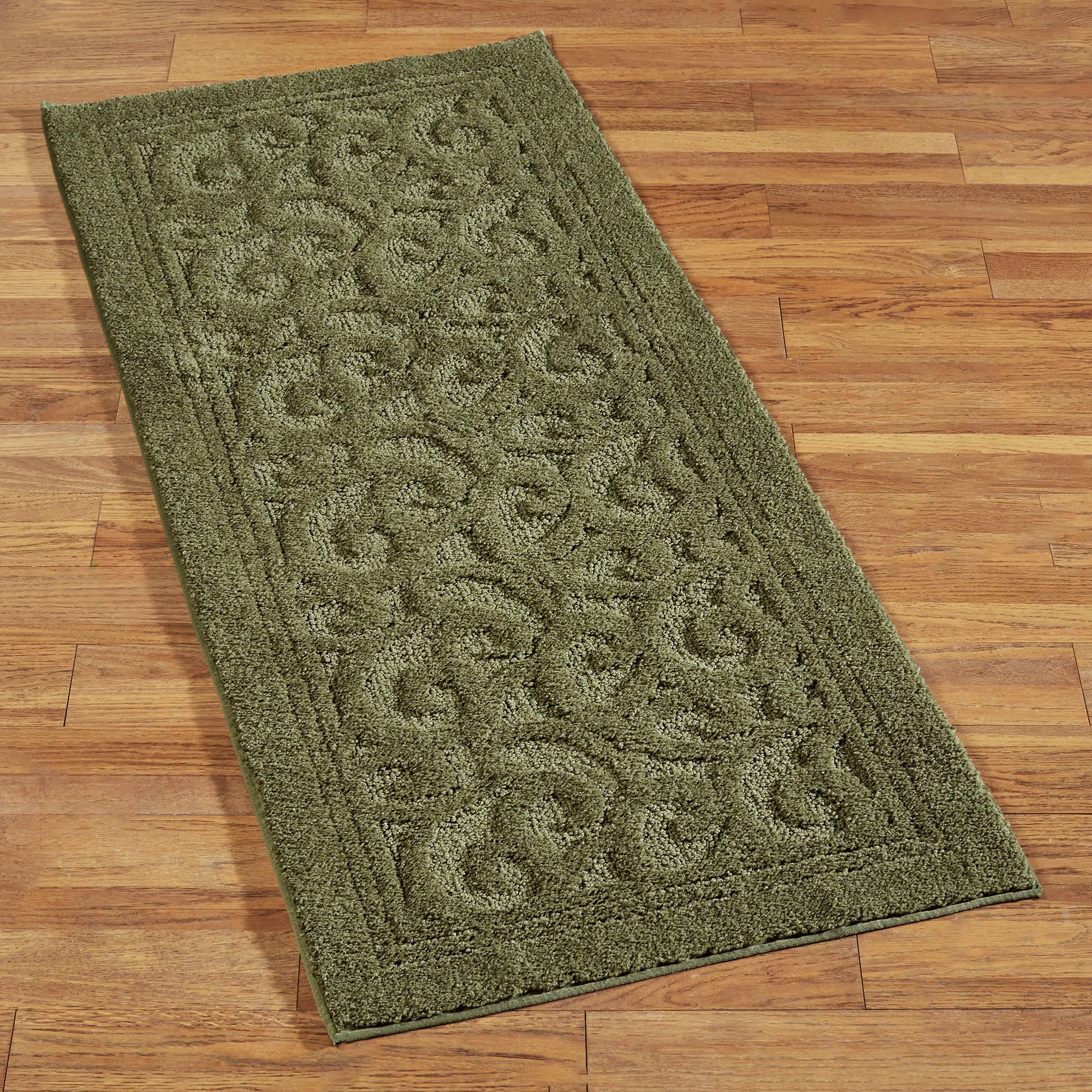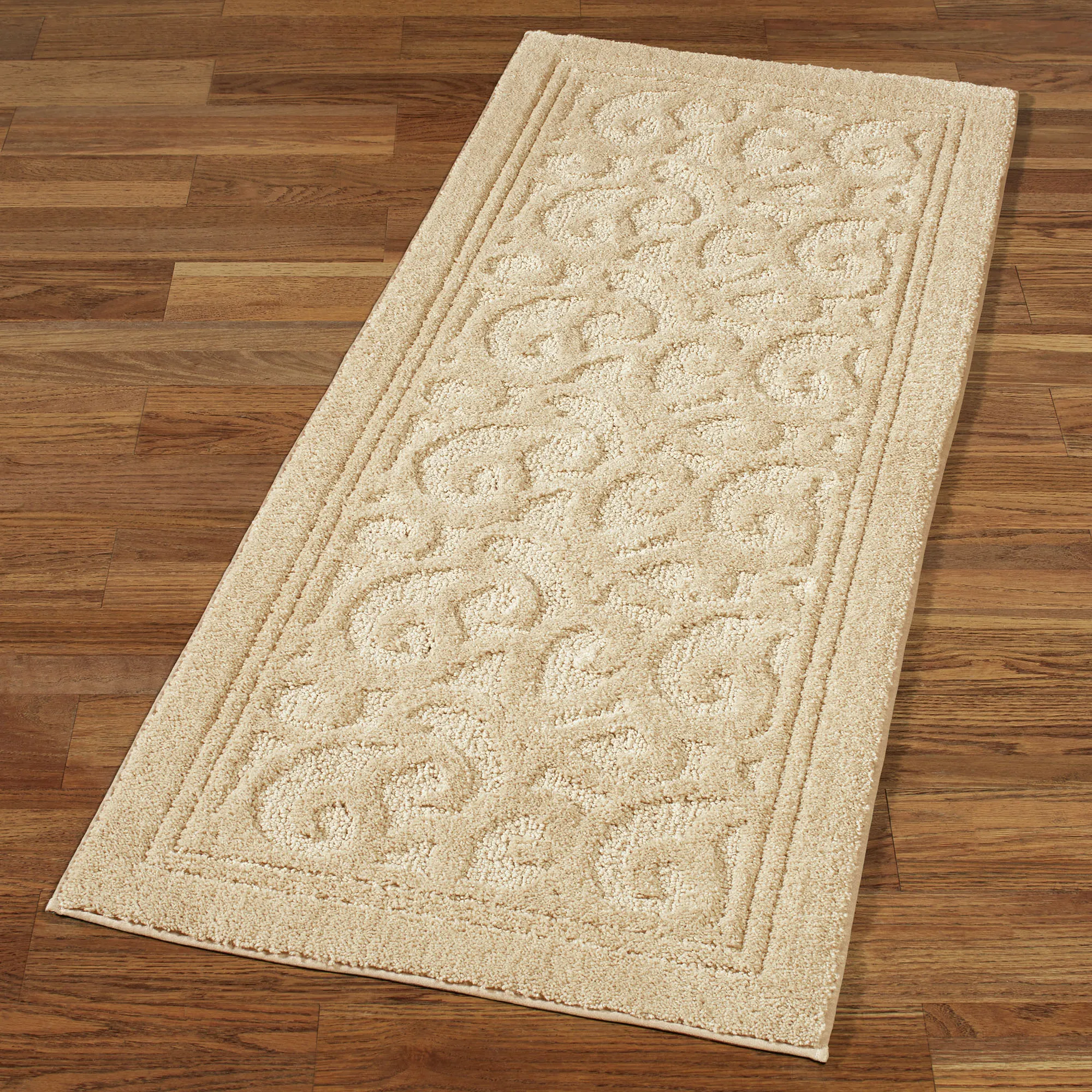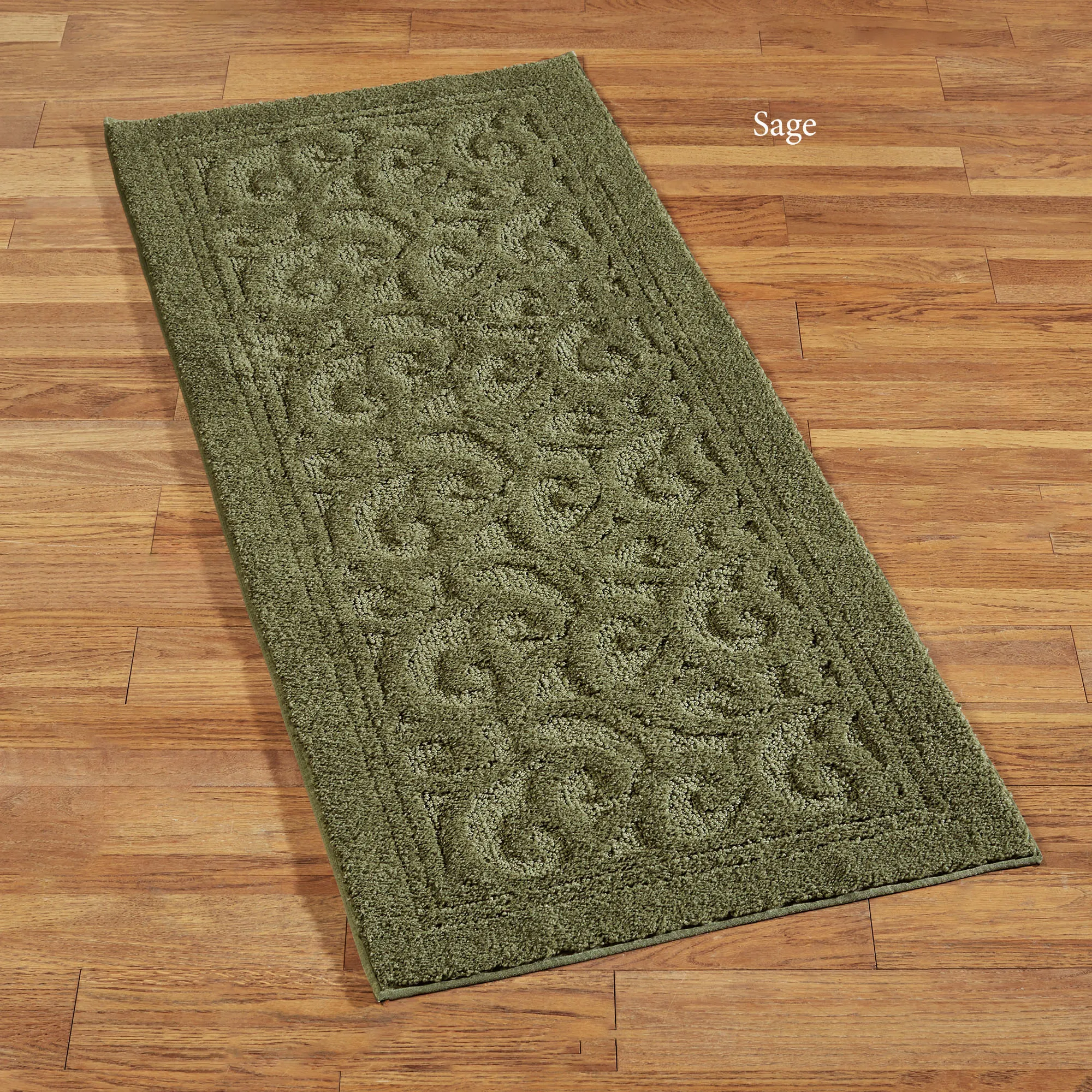 The Palermo Rug adds a charming touch with intriguing tone-on-tone sculpted scrollwork. Crafted from a super-soft micro polyester, the .5" thick, solid color rug features a rich touchable texture, scrolls, and a double frame. Backing is slip-resistant thermoplastic rubber. Machine washable. Do not vacuum. Imported.