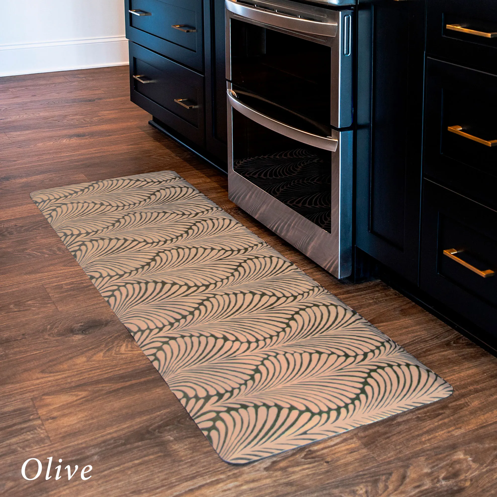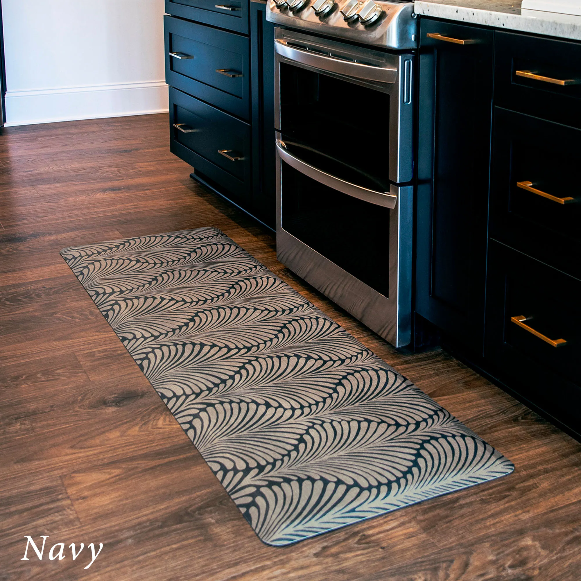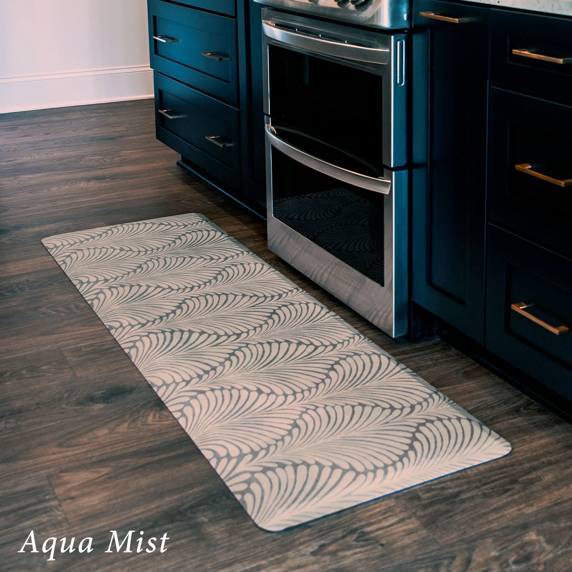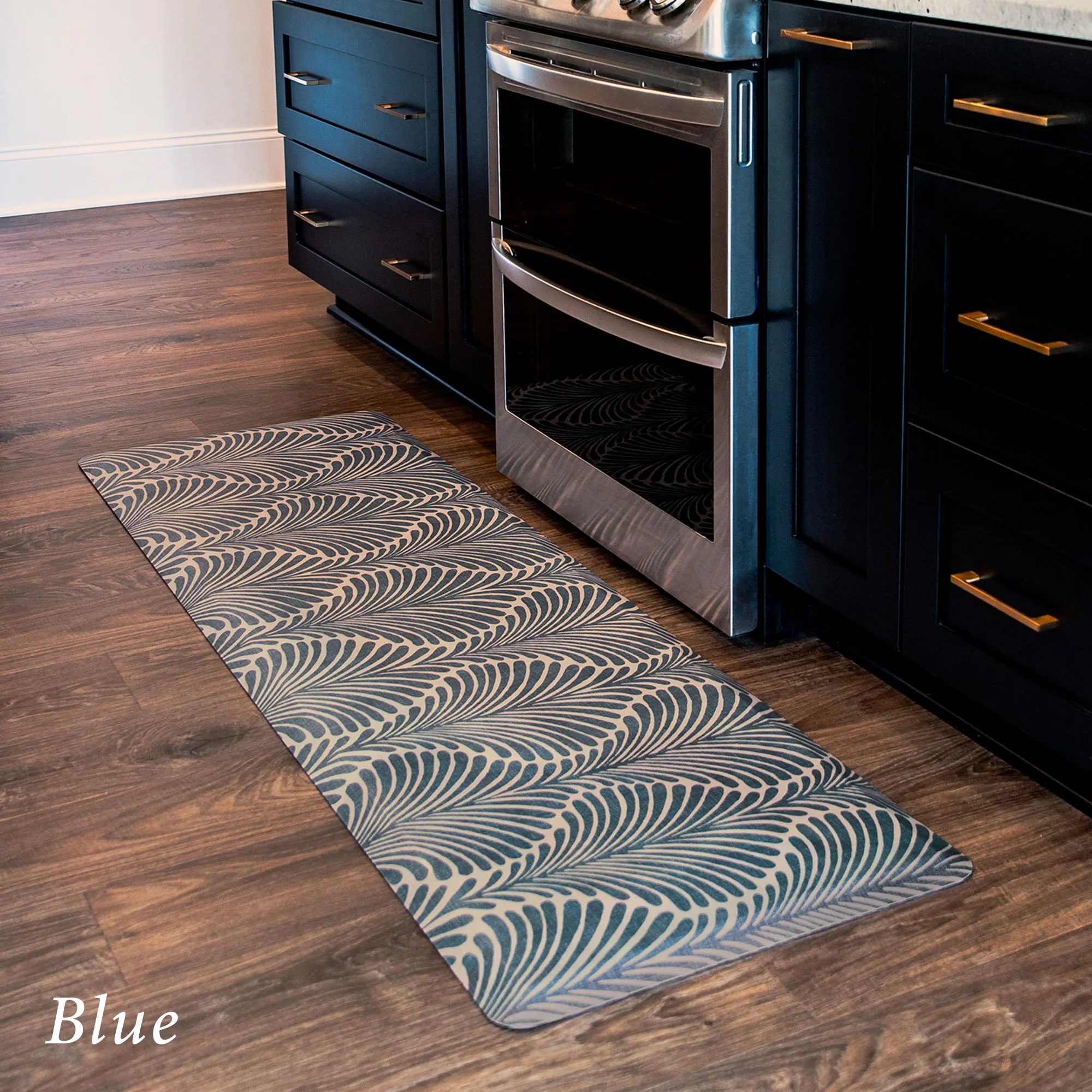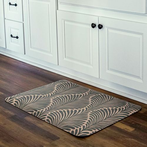 The stylish Palm Fronds Sole Comfort Anti-Fatigue Mat provides a waterproof, stain-resistant, easy-to-clean, and comfortable surface. Proudly made in the USA, the PVC-free polyurethane mat features a .625" thick resilient foam center resistant to crushing for a long-lasting design that reduces aches and pains from prolonged standing. The printed two-tone undulating pattern resembles palm fronds for an exotic modern touch. Rectangle is 32"x22". Runner is 72"x22". Simply wipe to clean.