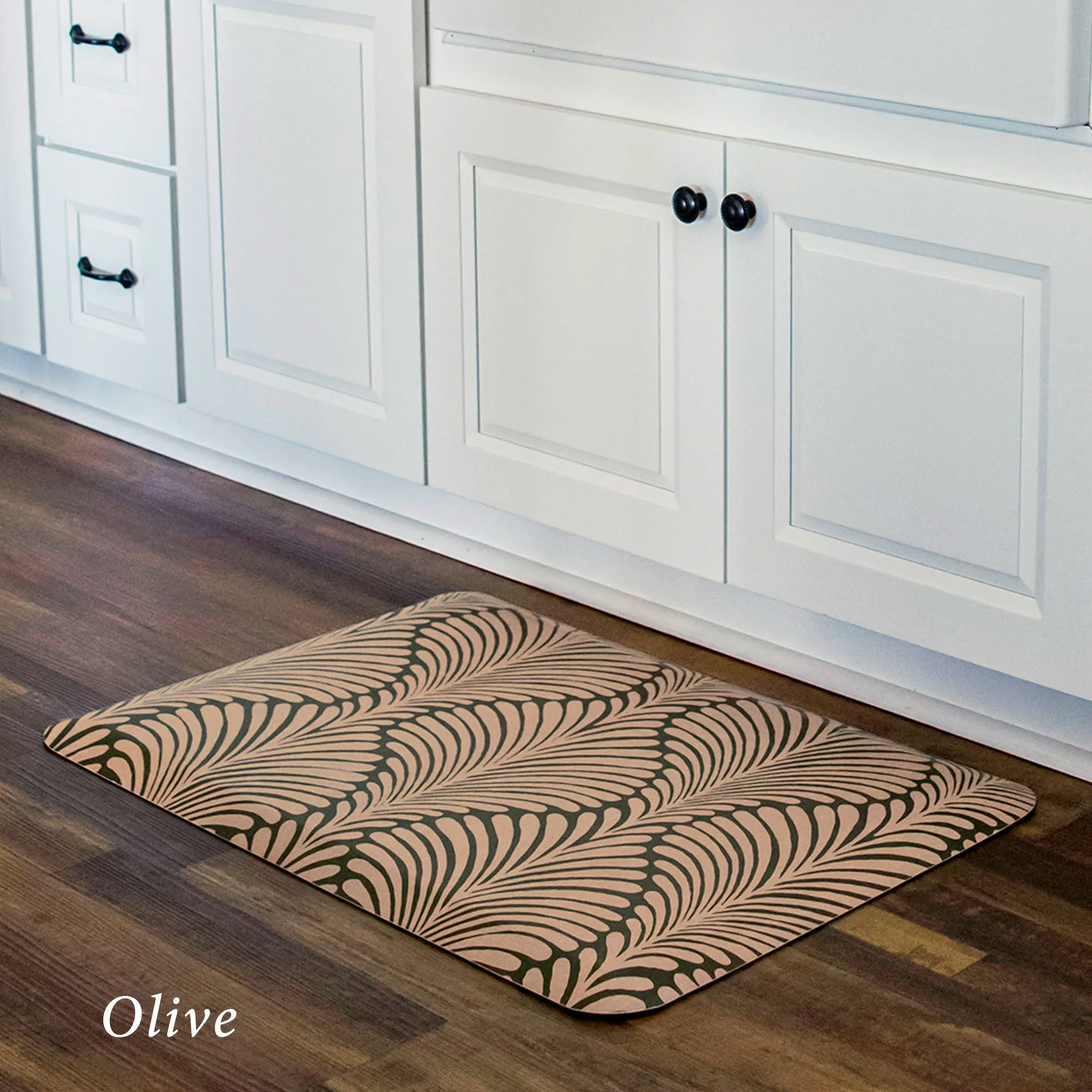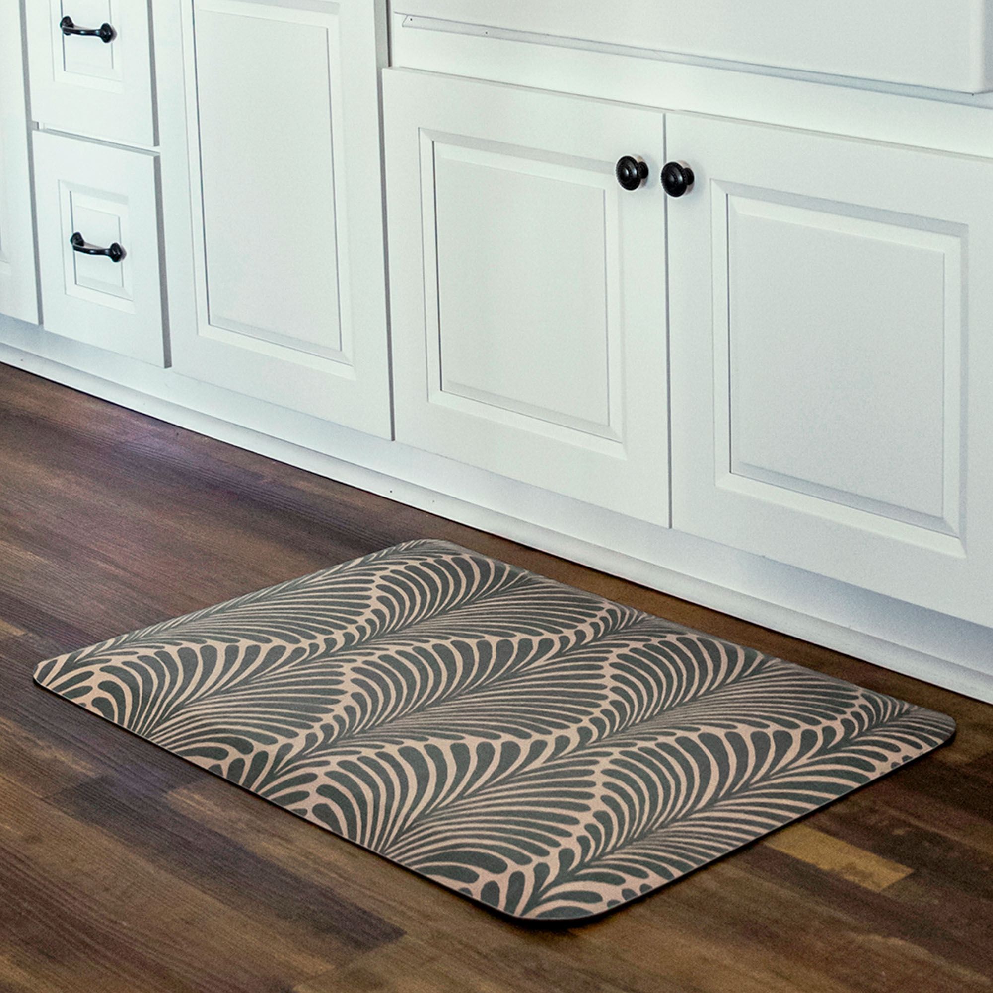 The Palm Fronds Sole Comfort Anti-Fatigue Mat is PVC-free polyurethane with a foam center. Made in the USA.