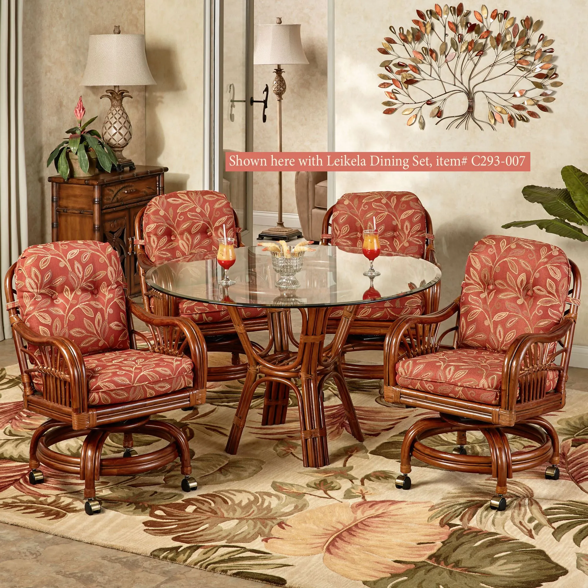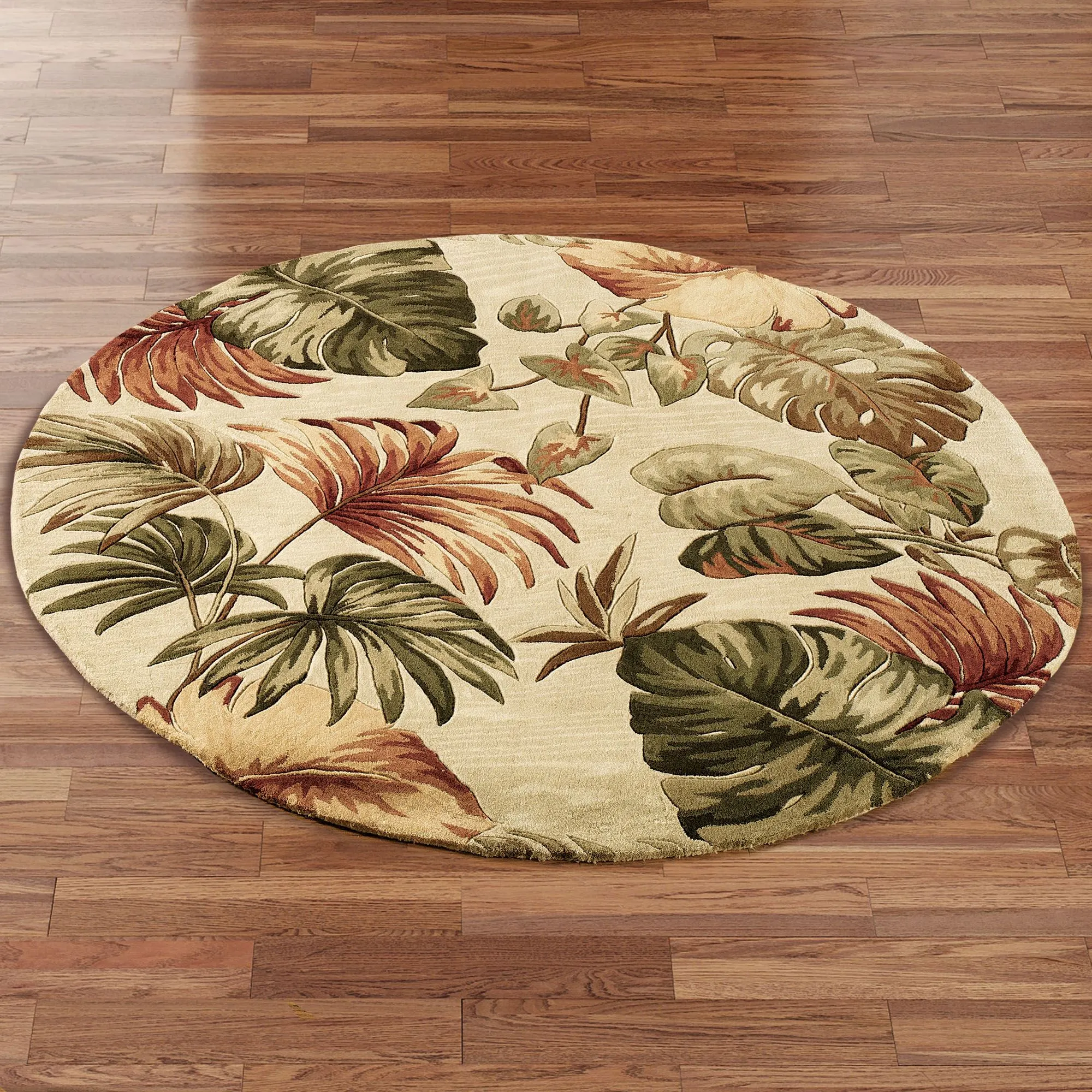 The Palm Leaf Tropical Rugs are made in India of 100% wool; backs are cloth-covered latex.