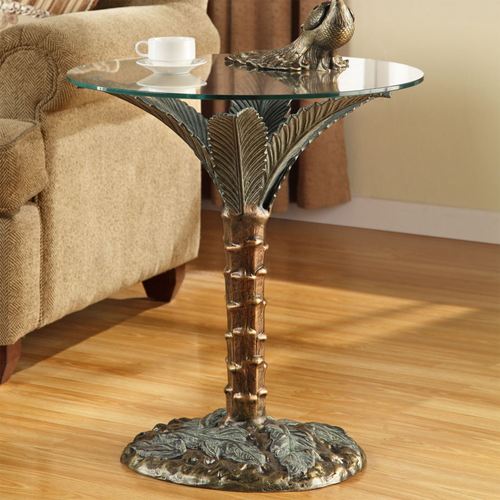 The Palm Tree Art Round Accent Table sprouts a breezy tropical vibe in any space. With a hand-rubbed finish, the hand-cast aluminum sculpture features an antique gold base growing a light bronze palm tree with verdi leaves that lift the clear glass table top. Overall, the unique accent table measures 22"dia.x21"H and weighs 19 lbs.