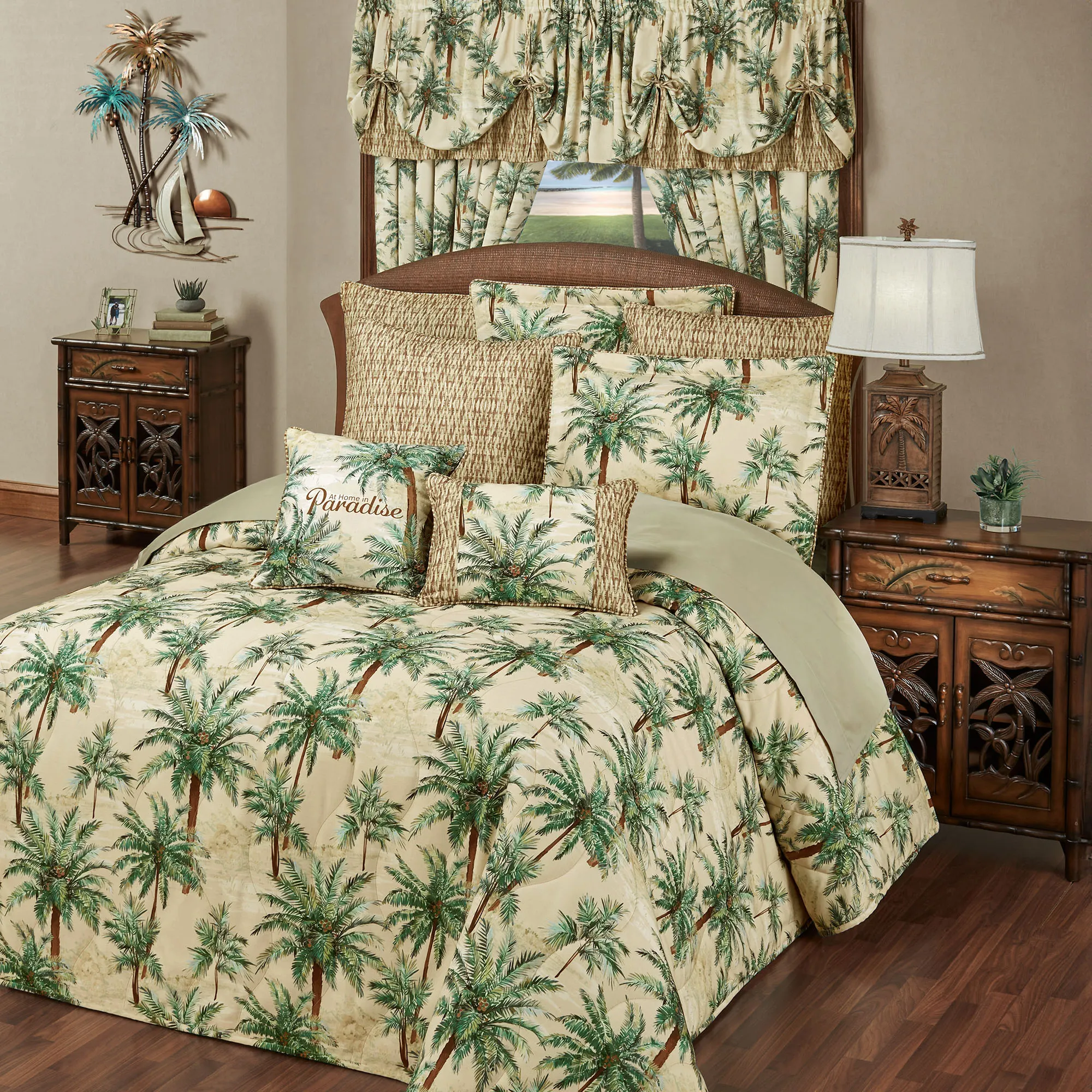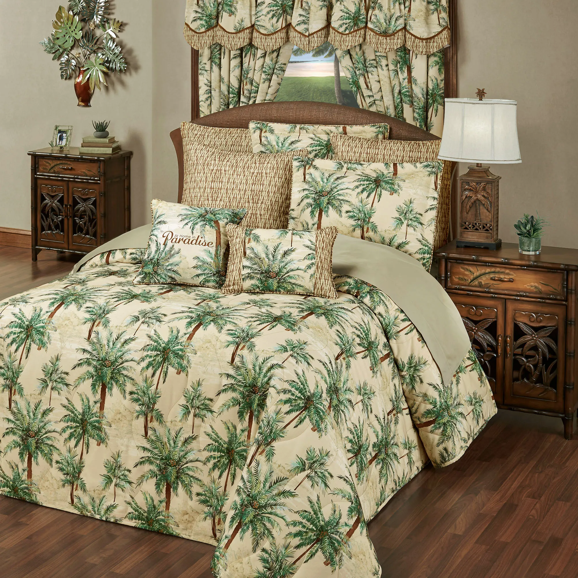 Imagine balmy tropical breezes when resting with the Palmetto Bedding. With classic printed designs, the woven slubbed polyester ensemble features lush green and brown palm trees on a wheat and ivory watercolor ground. A brown, soft wheat, and green basket weave motif adds charming visual texture and an island appeal.