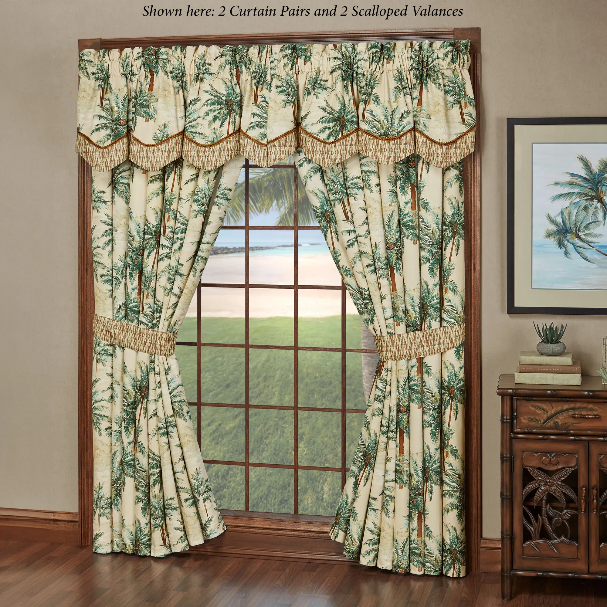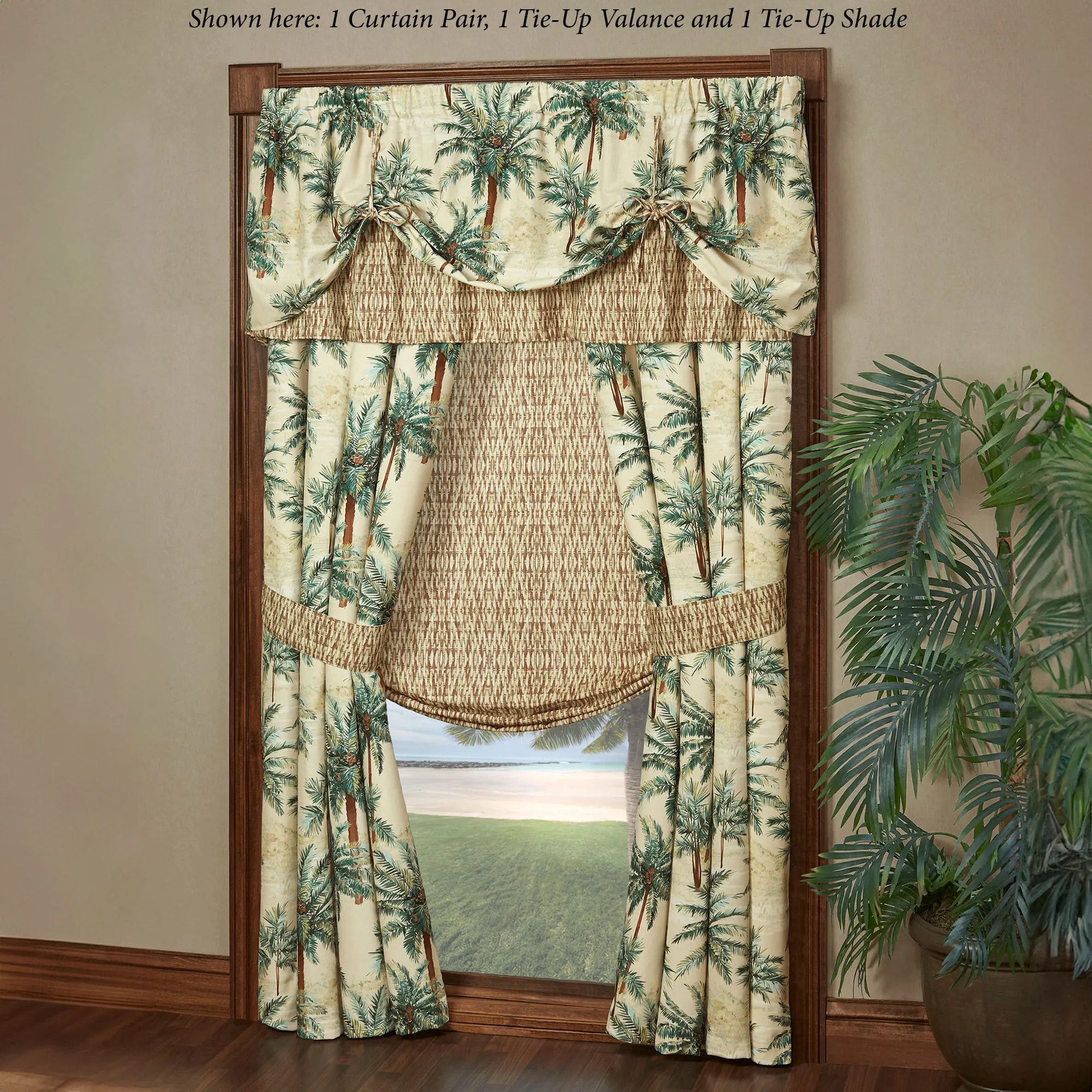 Window Treatments have tailored edges and 3" rod pockets. All, except the Tie-Up Shade, are lined and have palm trees. Curtain Pair includes reversible tiebacks. Scalloped Valance is pieced with a basket weave bottom and gimp trim. Tie-Up Valance has a basket weave bottom and ties. Tie-Up Shade has the basket weave motif and ties.
