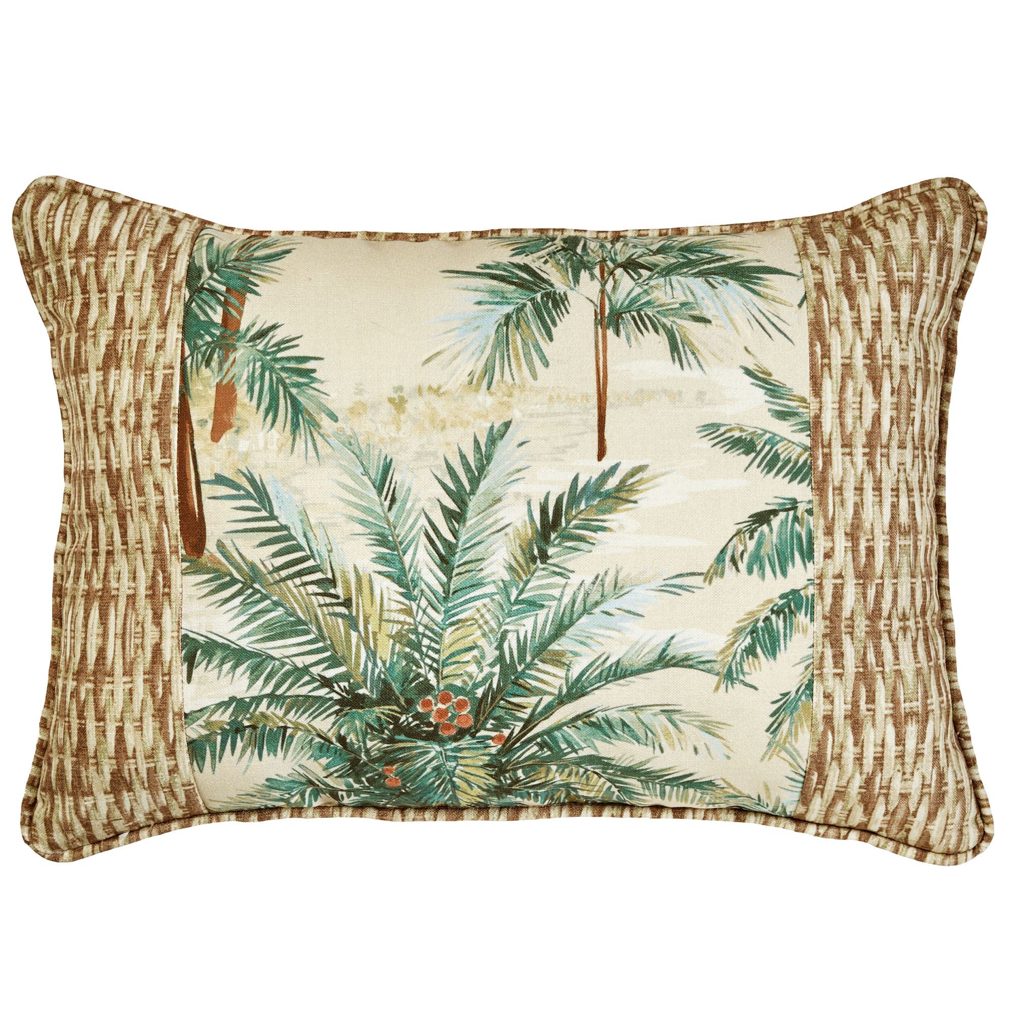 Pillows have palm trees and piped edges. Spot clean. Square reads "At Home in Paradise" in brown. Rectangle is pieced with basket weave ends.