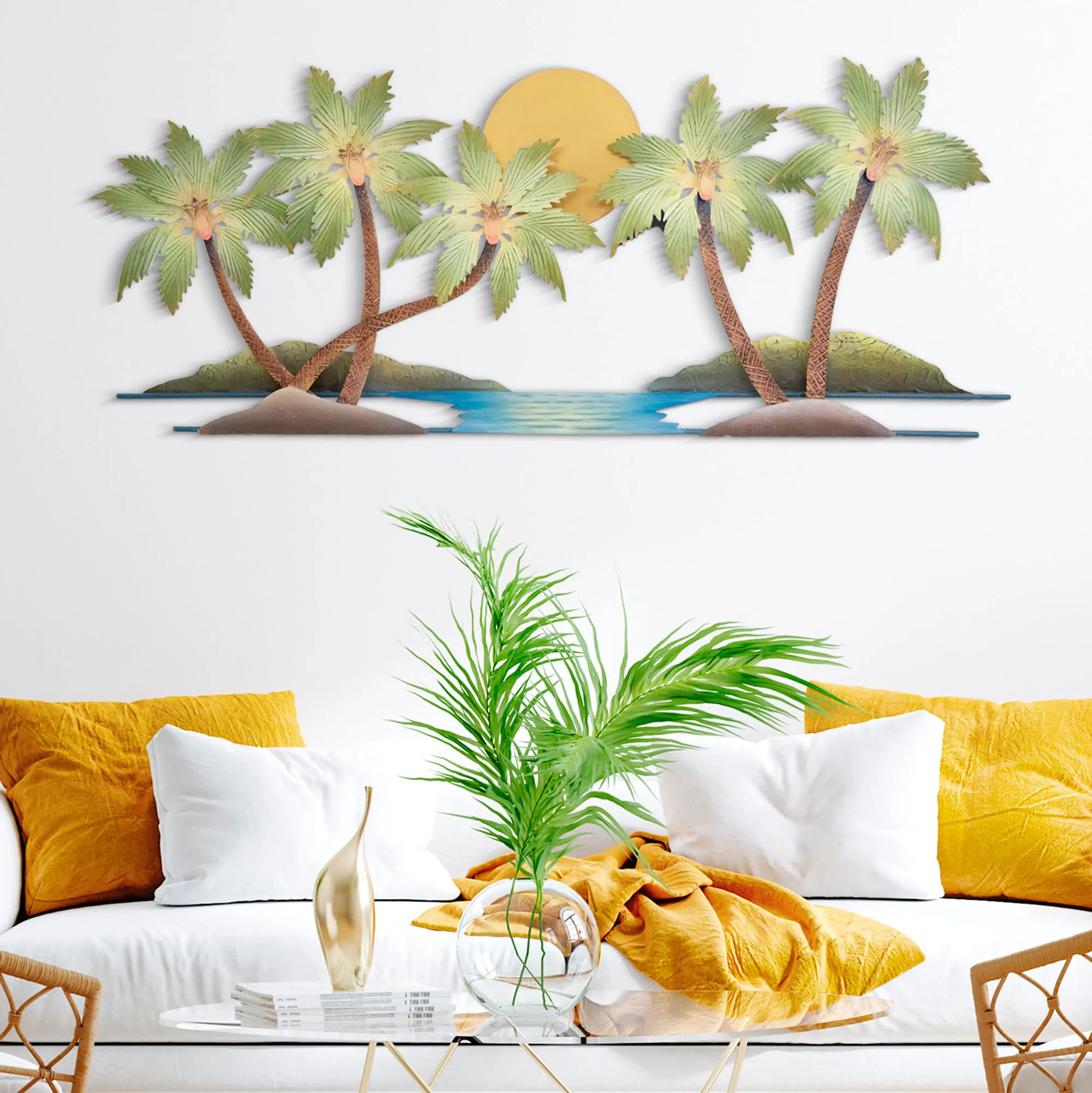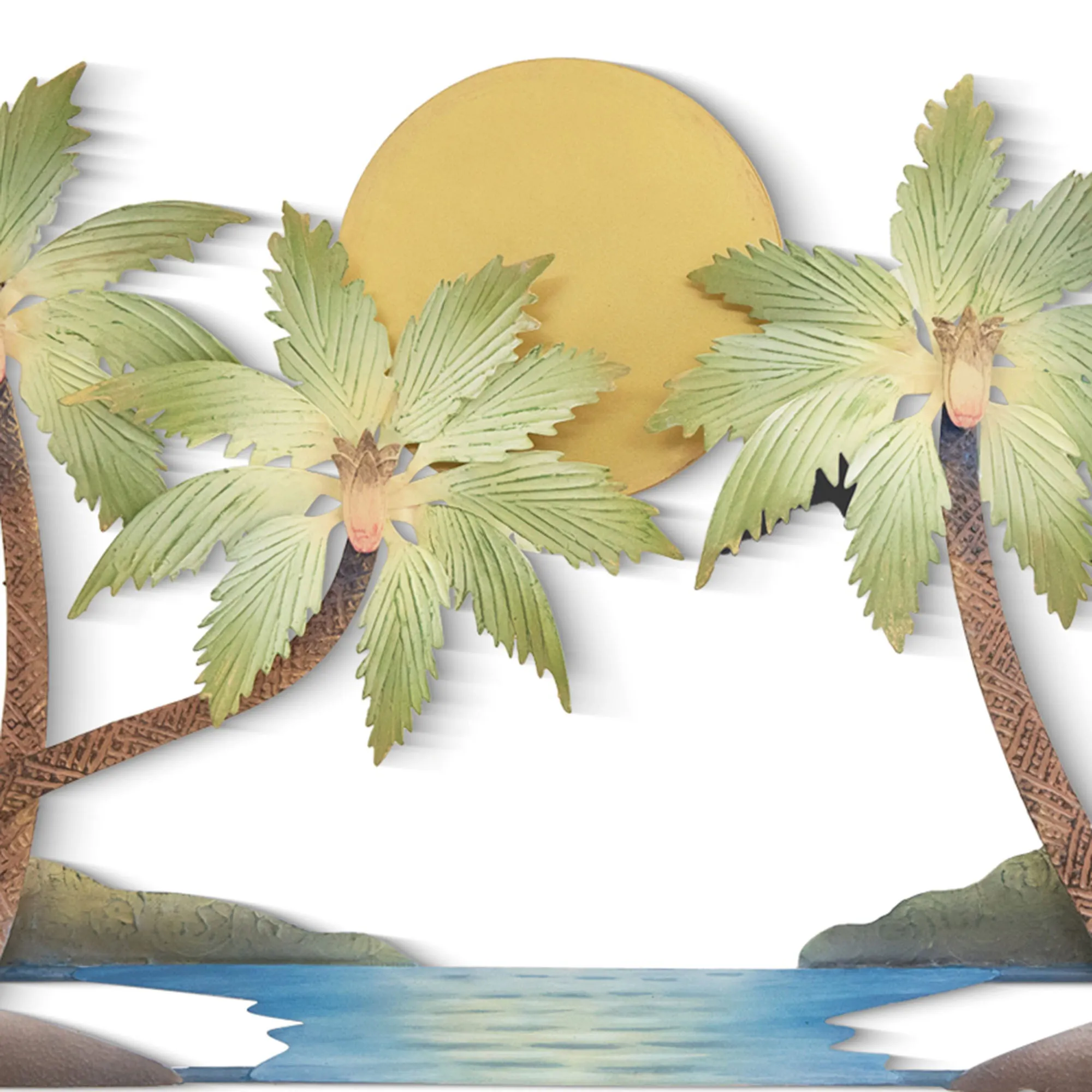 No view rivals the beautiful Paradise Palms Sunset. By artist Joanne Ferrara, the handcrafted metal wall sculpture features sage tropical palms on the beach in front of the setting sun. Handpainted natural tones bring the design to life. Perfect for your indoor space, covered porch, or enclosed patio, the palm tree wall art measures 43"Wx1.5"Dx19"H.