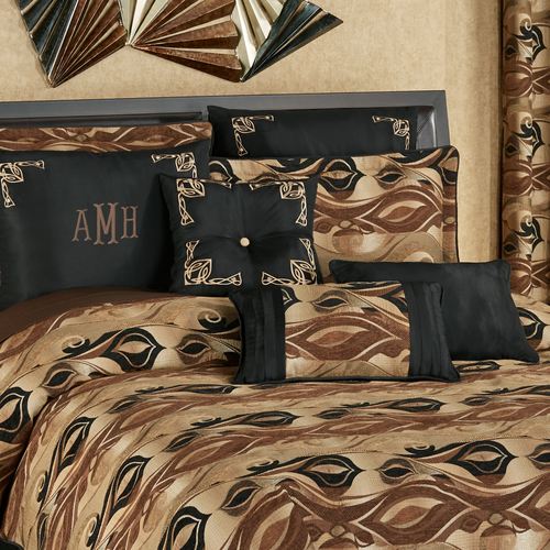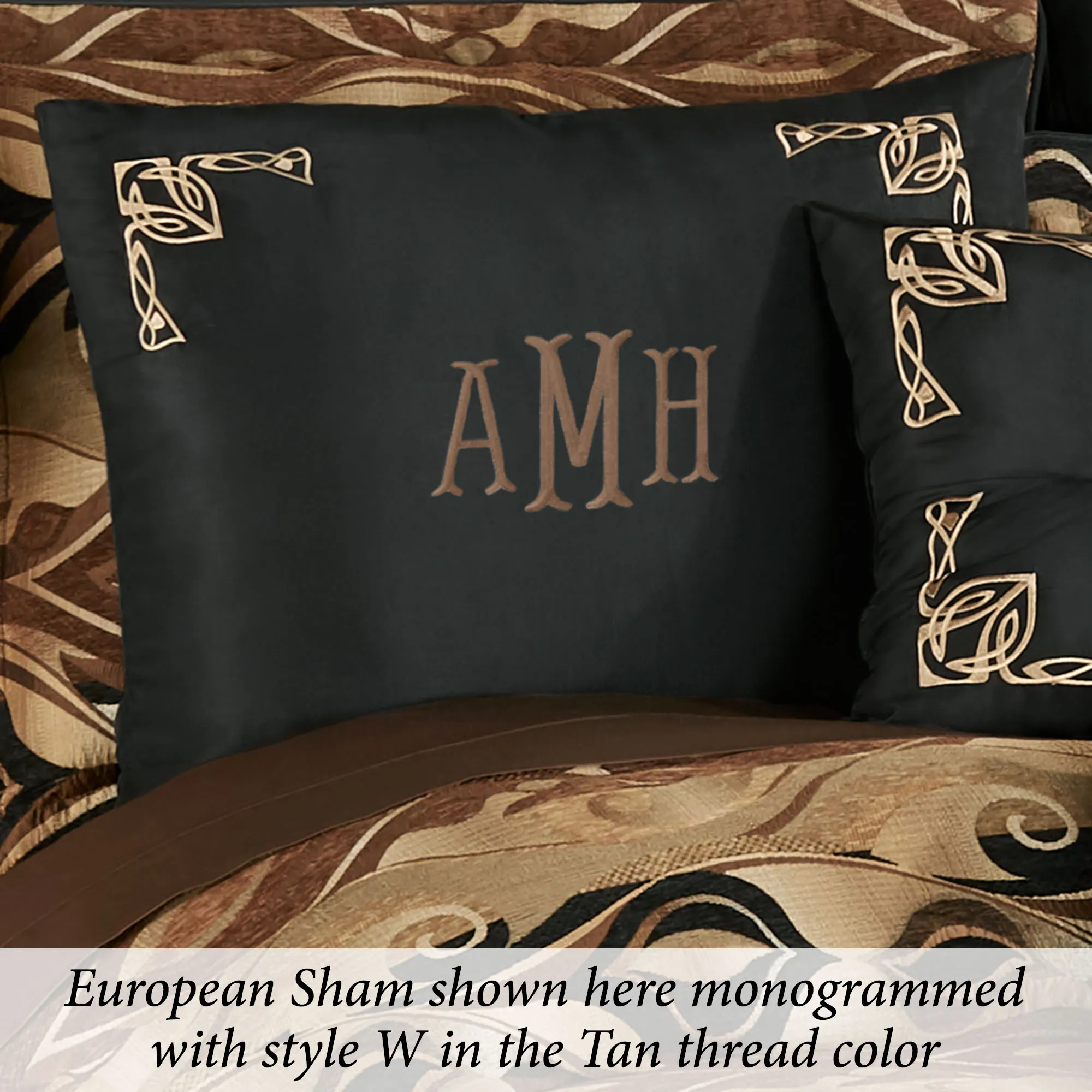 Modern designs adorn the polyester Paragon Bedding Accessories. The tailored, solid black Square Pillow, 18", has tan airy scroll embroidery and a button tuft. The piped, pieced Rectangle Pillow, 14"x22", has a woven abstract ogee design accented with chenille in black, tan, and dark brown; double-pleated sides are black. The tailored, padded European Sham is black with tan airy scroll embroidery in the corners; insert is not included. Spot clean the polyester-filled pillows. Dry clean the European sham. Imported.