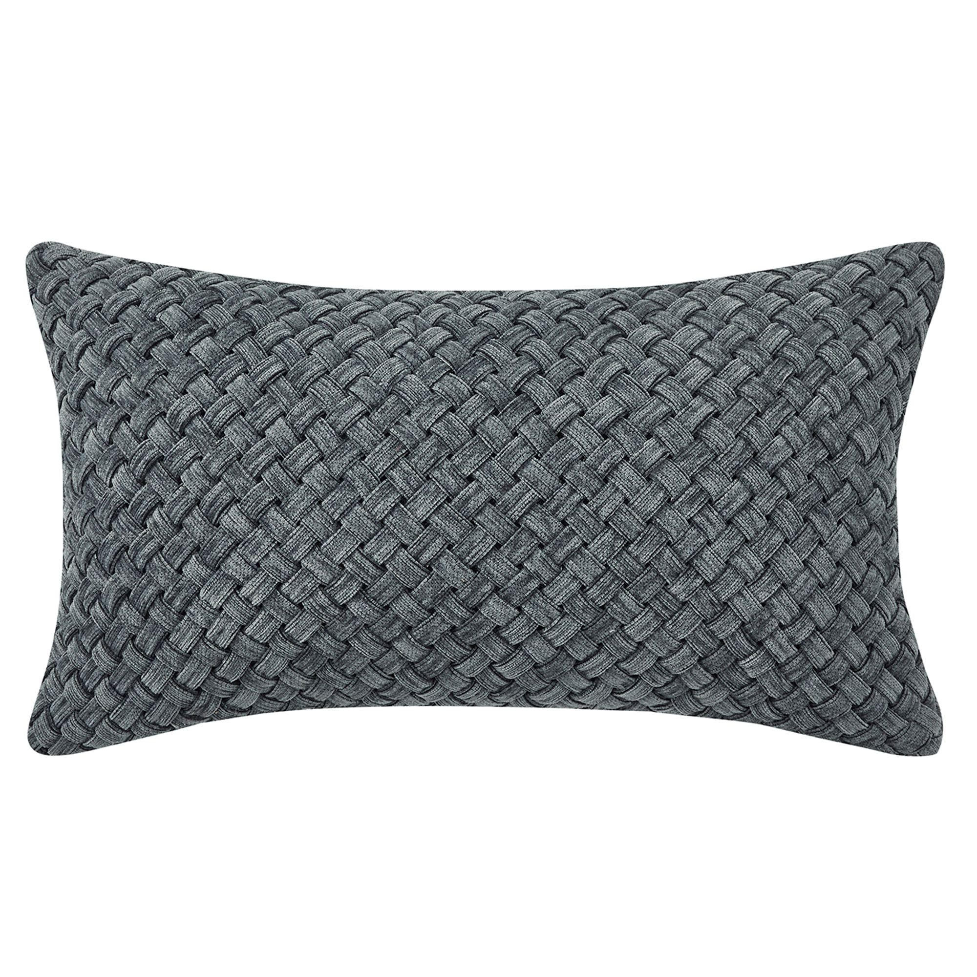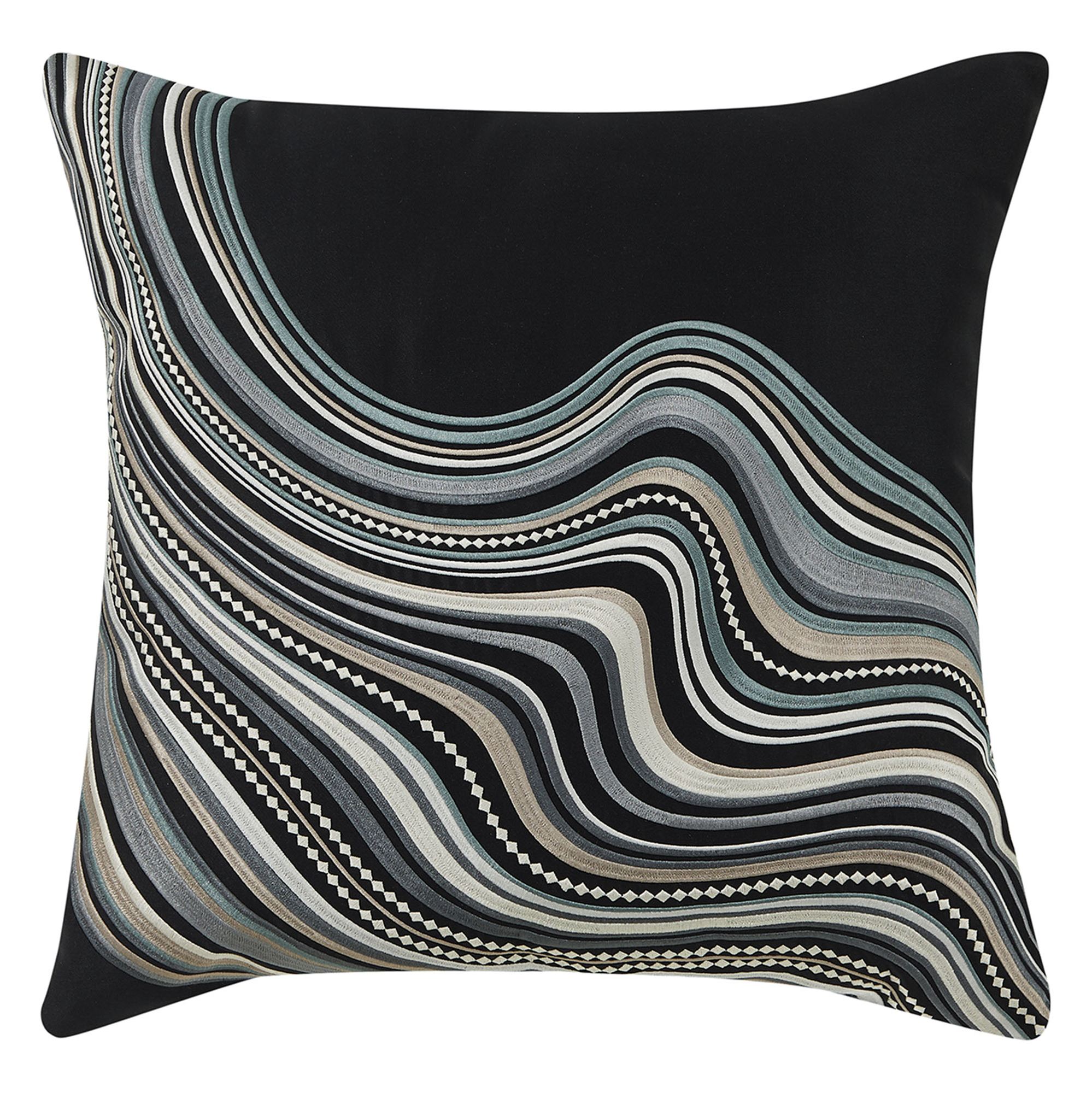 Pillows: Spot clean. The 20" Square is striped with piped edges. The Jumbo Rectangle is solid chenille with center stripes and piped, gusseted edges. The handmade Accent Rectangle is solid chenille with intricate braided pleats and tailored edges. The Geometric 18" Square has embroidered contemporary geometrics on black with tailored edges. The Wave-Striped 18" Square has embroidered coordinating wavy stripes on black with tailored edges.