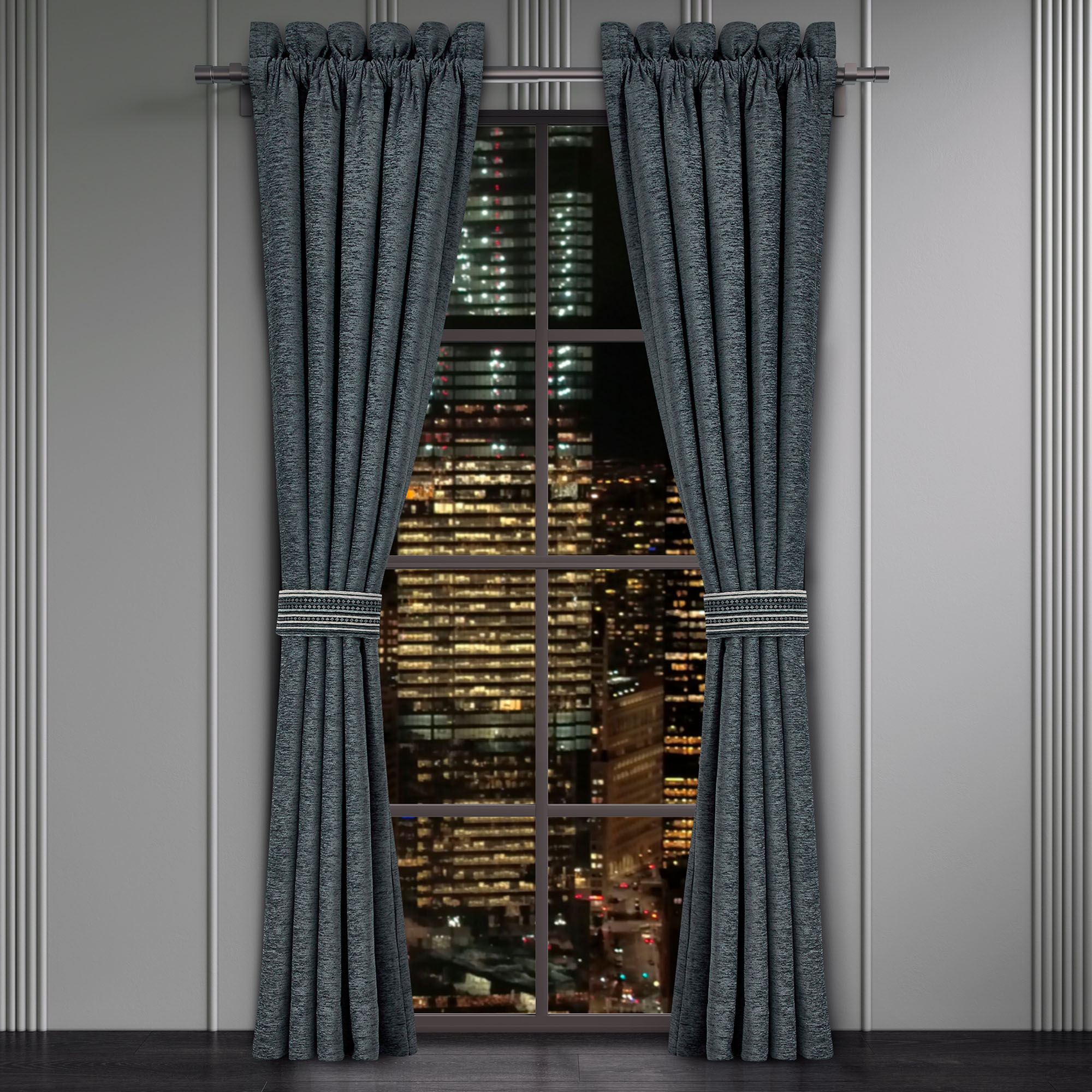 Lined Window Treatments are solid woven chenille with tailored edges. Wide Curtain Pair has a 3" rod pocket and includes striped tiebacks. Curtains are available in two lengths. Valance has a striped bottom and a 3.25" rod pocket.