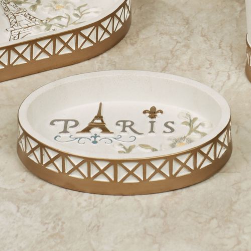 The Paris Botanique Soap Dish decorates your bathroom with the beauty of France. Made of resin, the soap dish features embossed designs of the Eiffel Tower, vining flowers, a grid motif, and the word "Paris." Colors include handpainted shades of gold, gray, white, yellow, French blue, and green on a speckled eggshell background. Measures 5.5"Wx4"Dx1"H.