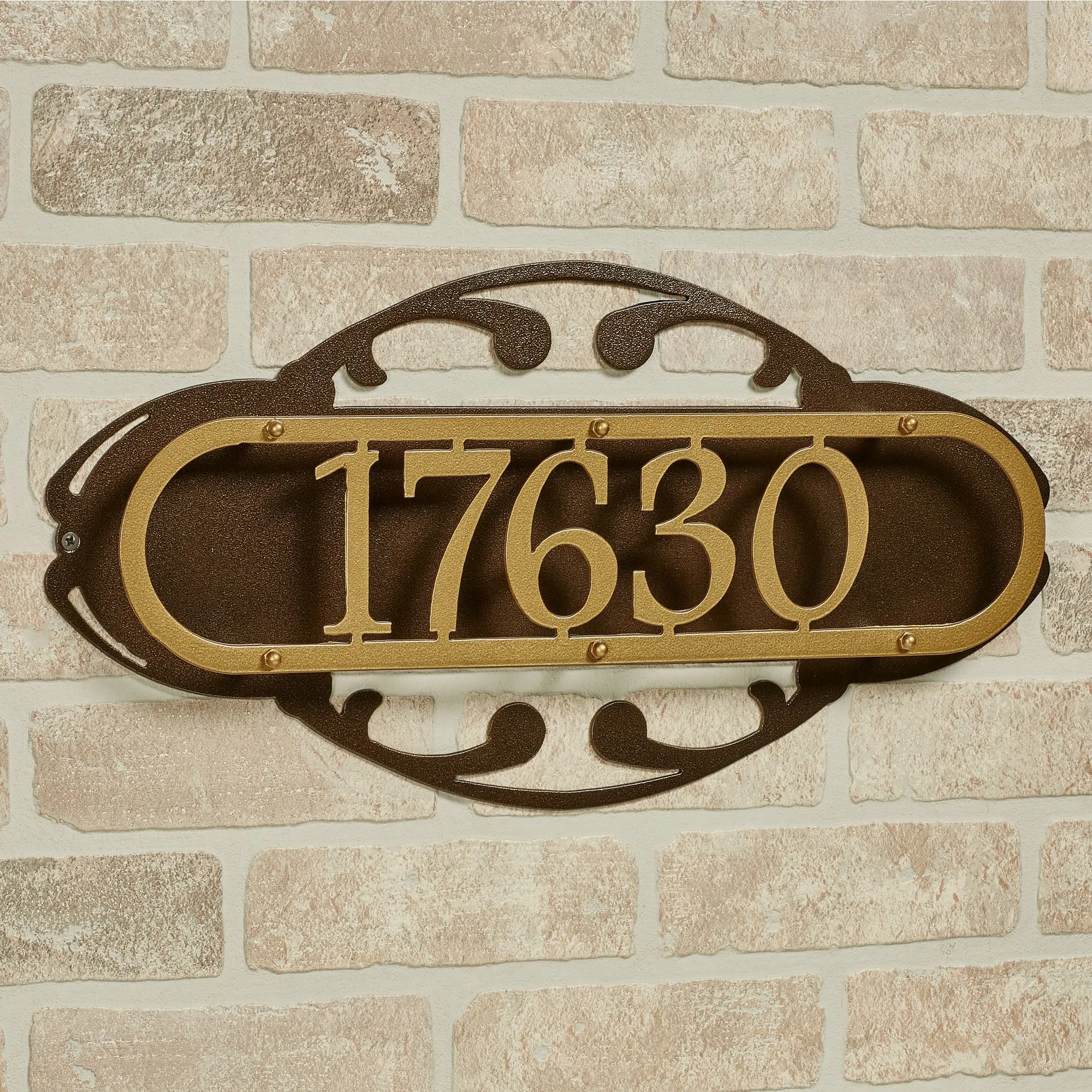 Display the Paris House Number Address Wall Sign so that your address can easily be seen. Handcrafted of precision-cut, 14-gauge steel, this wall accent has a UV-, weather-, and tarnish-resistant powder-coat finish. The arched backplate and scrolls have a rich bronze finish; the oval plaque with 4.5"H numbers is beautifully finished in gold. Outdoor year-round use. Measures 20"Wx1.5"Dx10"H. Please enter numbers only. Sorry, letters are not available.