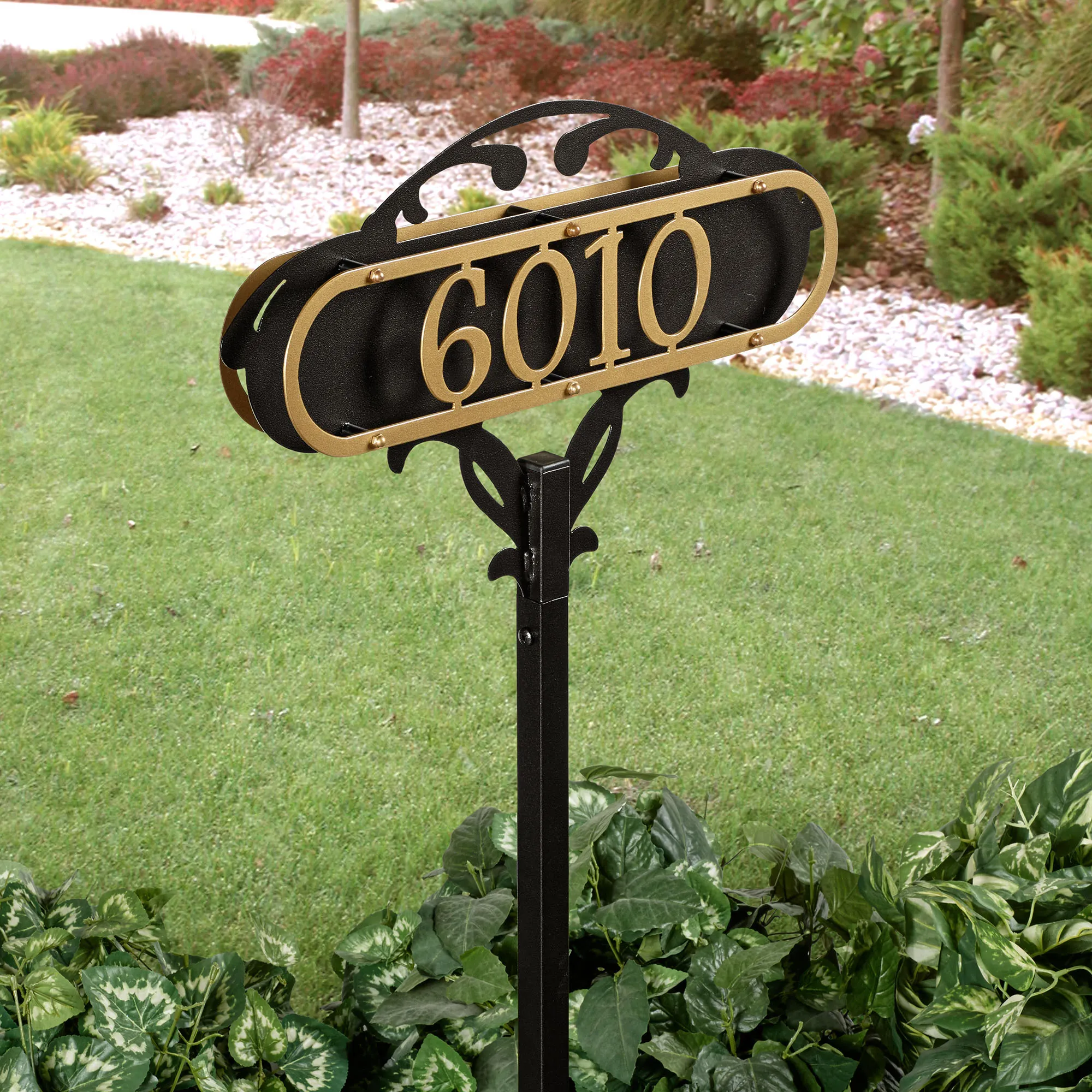 Display the Paris House Number Address Sign Yard Stake so that your address can easily be seen. Handcrafted of precision-cut, 14-gauge steel, this yard stake has a UV-, weather-, and tarnish-resistant powder-coat finish. The arched backplate, scrolls, and stake have a black finish; the oval plaque with 4.5"H numbers is beautifully finished in gold. The double-sided yard stake displays your house numbers on both sides. Outdoor year-round use. Measures 20"Wx2.5"Dx36"H.