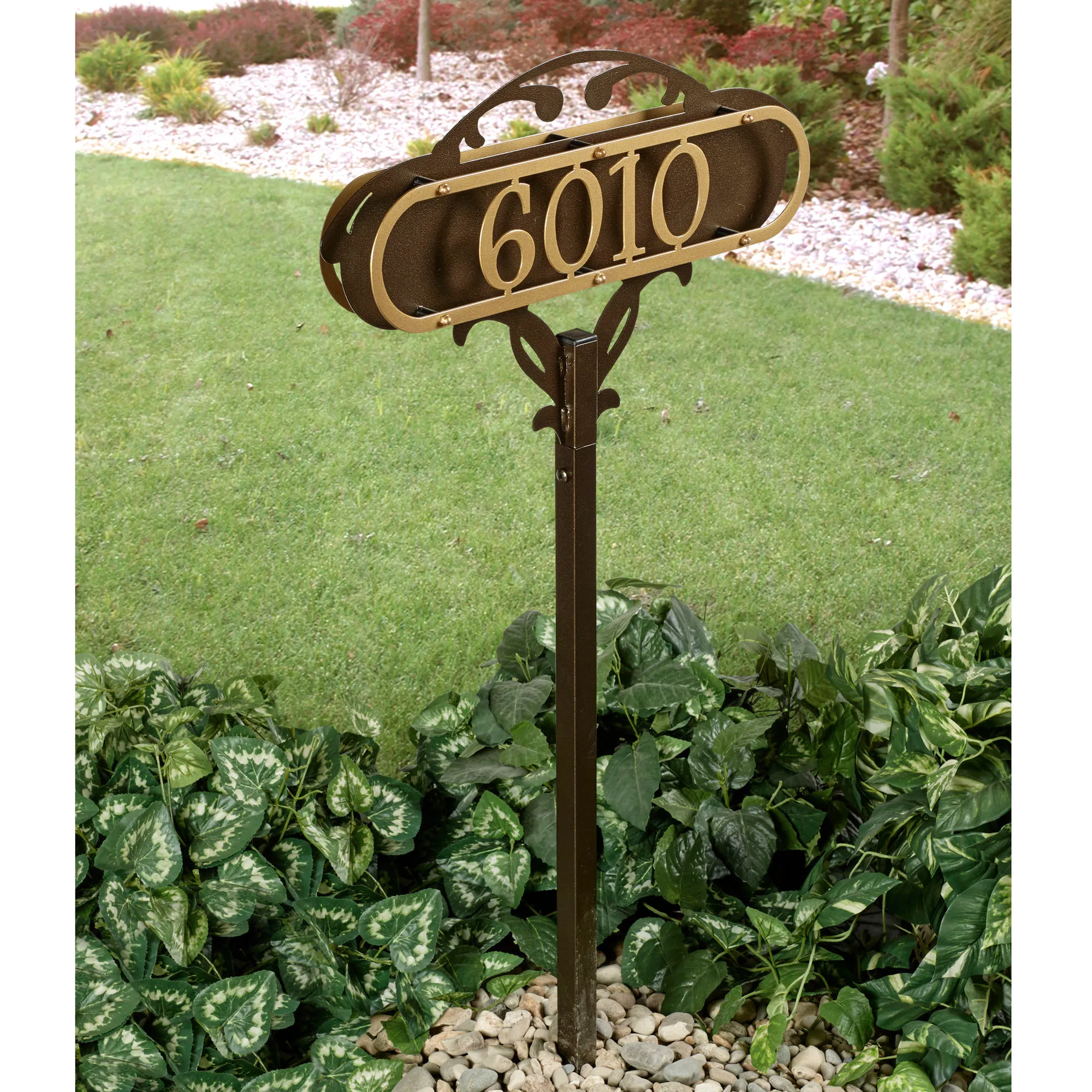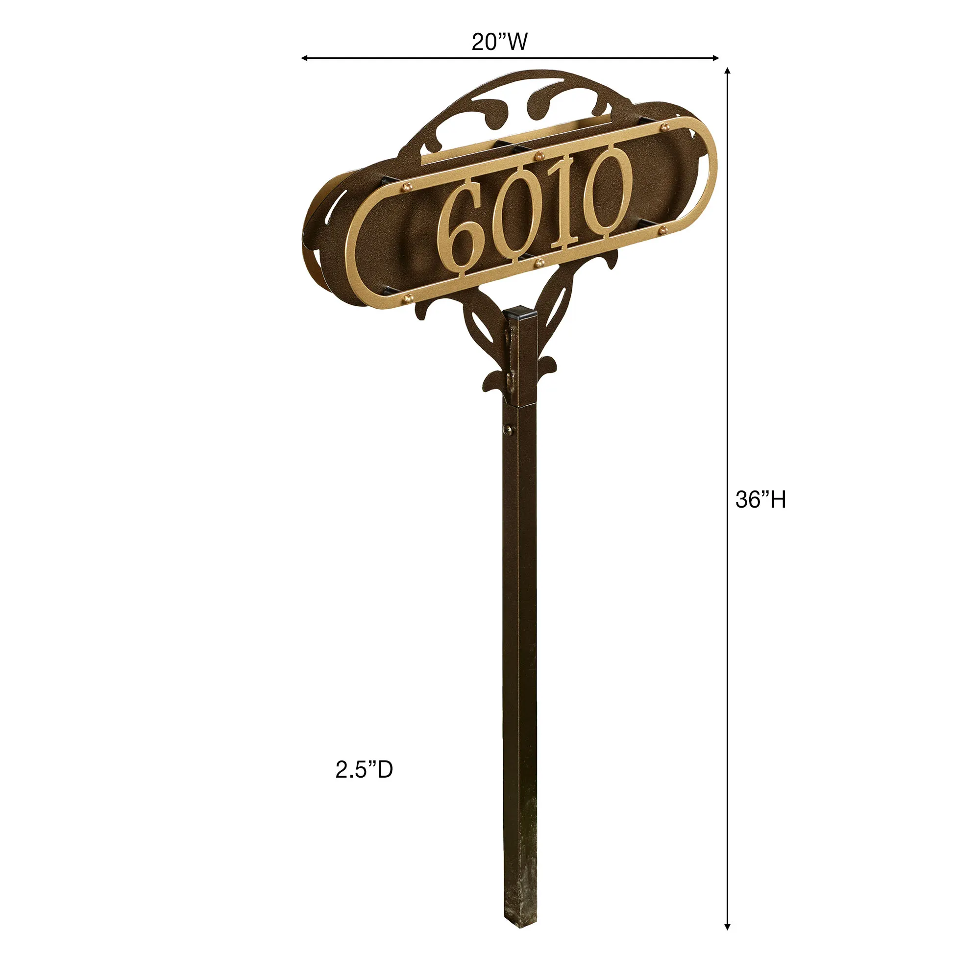 Display the Paris House Number Address Sign Yard Stake so that your address can easily be seen. Handcrafted of precision-cut, 14-gauge steel, this yard stake has a UV-, weather-, and tarnish-resistant powder-coat finish. The arched backplate, scrolls, and stake have a rich bronze finish; the oval plaque with 4.5"H numbers is beautifully finished in gold. The double-sided yard stake displays your house numbers on both sides. Outdoor year-round use. Measures 20"Wx2.5"Dx36"H.