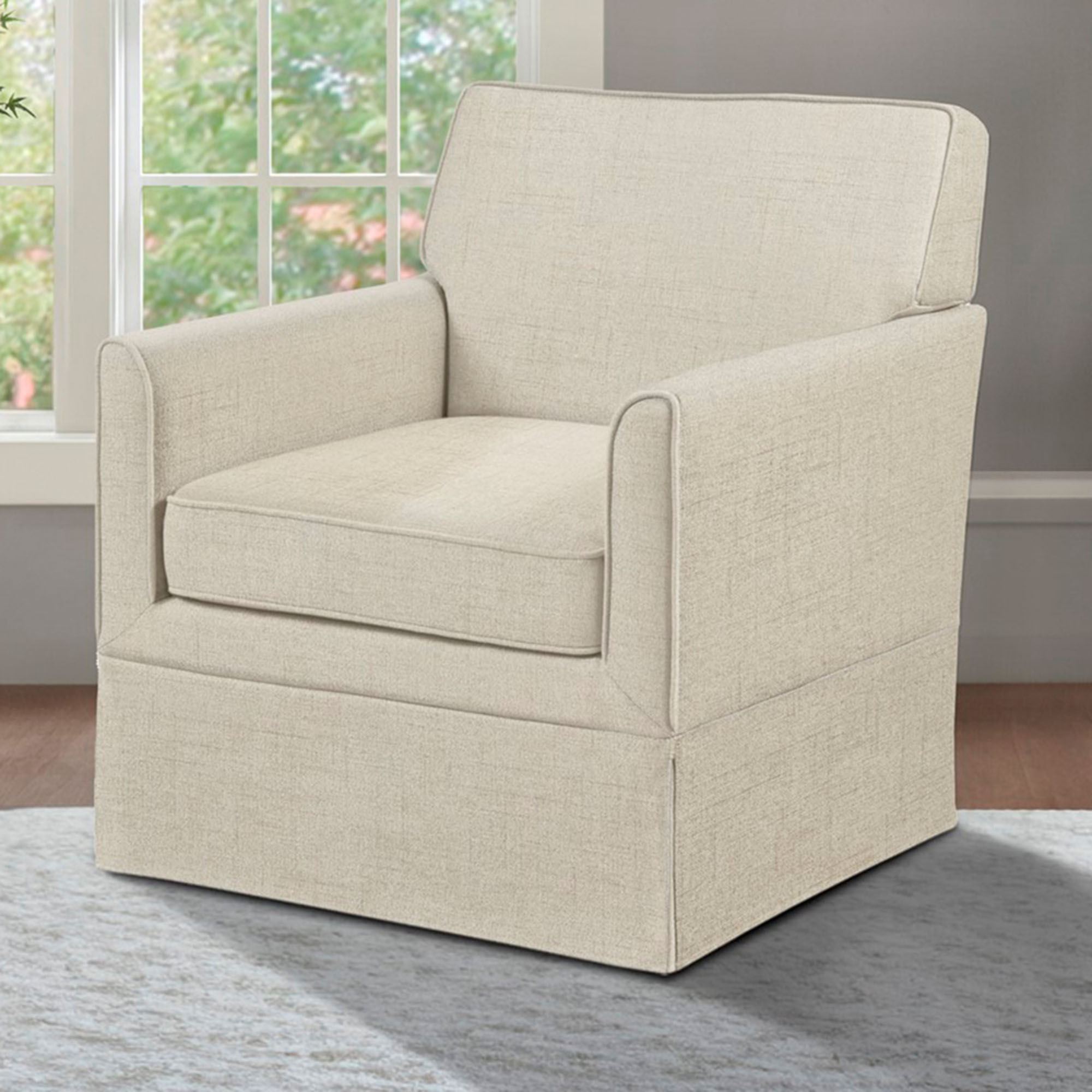 Decorate with the classic look of the Parisa Light Cream Accent Armchair. This sophisticated chair has a tailored aesthetic, light cream polyester fabric, piped details, and a removable seat cushion. The durable and sturdy chair has a wood frame and legs, spring cushion support, and high-density foam fill. Initially the foam fill will feel firm and will soften over time to provide optimal comfort. The maximum recommended weight is 300 lbs. Seat height is 18". Overall, the chair measures 30"Wx30.5"Dx33"H and weighs 42 lbs. Spot clean the fabric.