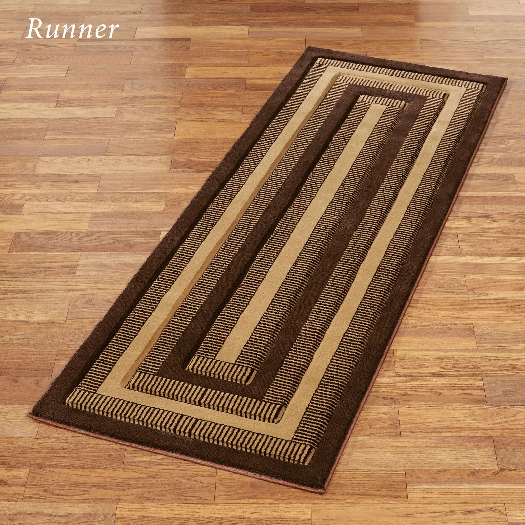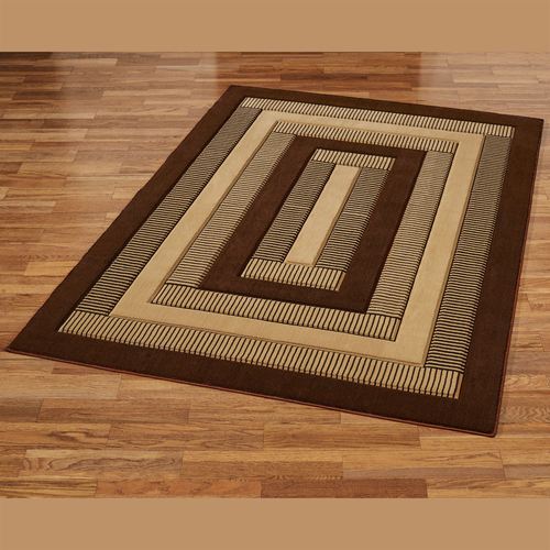 Stake your mark upon Park Place with this luxurious geometric area rug. Power-loomed from heat-set polypropylene, the .375" thick rug features defining alternating striped and solid frames detailed with angular borders. The brown coloration has brown, dark brown, and gold shades. We recommend professional cleaning by a rug cleaner. Imported.