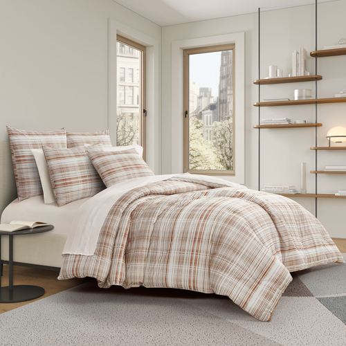 Enjoy the effortless, modern charm of the Pascal Cinnamon Plaid Bedding from Oscar Oliver New York City. The Comforter Set includes a comforter and shams. The reversible, printed cotton bedding features a modern linear plaid in shades of cinnamon, beige, and white. Oversized comforter has piped edges. Fill is polyester. Dry clean only. Imported.