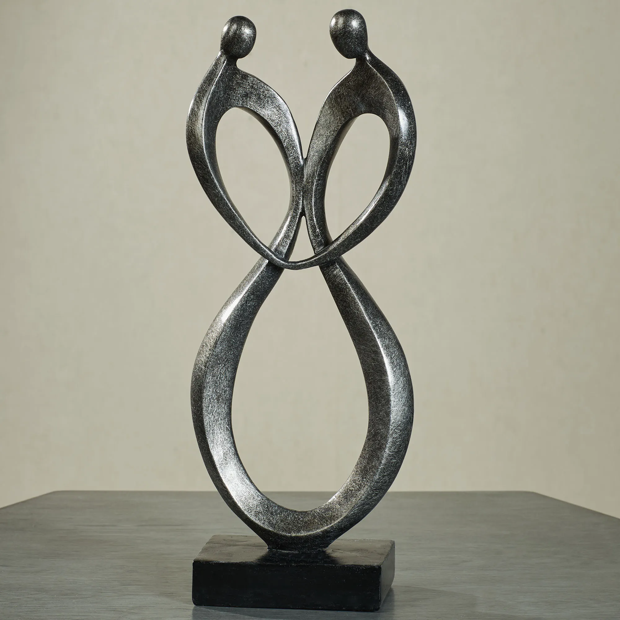 Wild and intense or slow and steady, a couple's life together can certainly be a Passionate Dance. With an abstract looped design, the silver resin sculpture resembles two people locked together atop a square base. Overall, the sculpture measures 6"Wx3"Dx15.5"H.