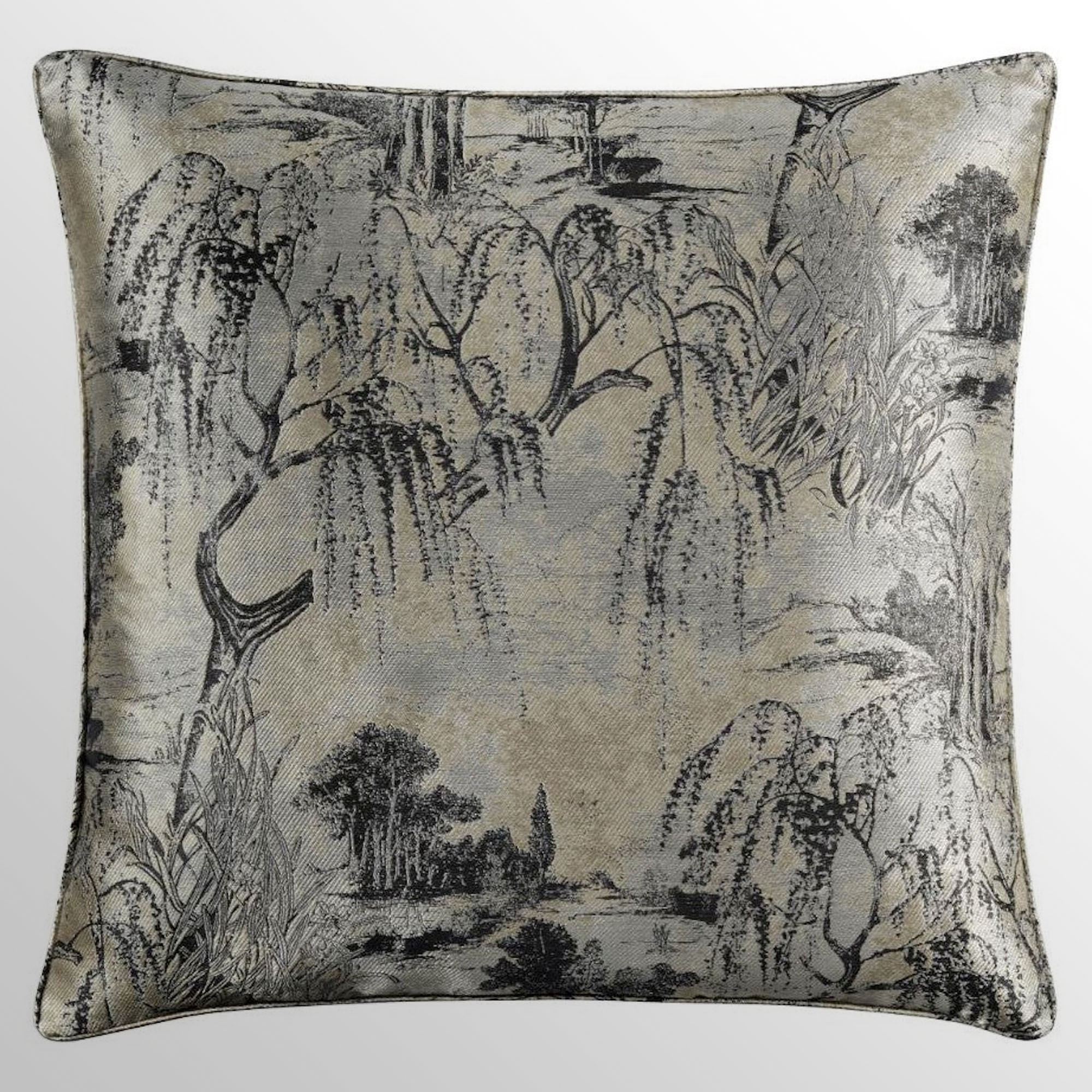Luxuriate in the countryside with the Pastoral Jacquard Champagne Bedding. The Mini Comforter Set includes a comforter and shams. Crafted with metallic yarns, the jacquard-woven polyester/nylon blend ensemble features lush greenery, trees, and open pastures in black on champagne mingled with gray. Oversized comforter has tailored edges and a light taupe cotton back; fill is polyester. Piped shams have zipper closures. Dry clean only. Imported.