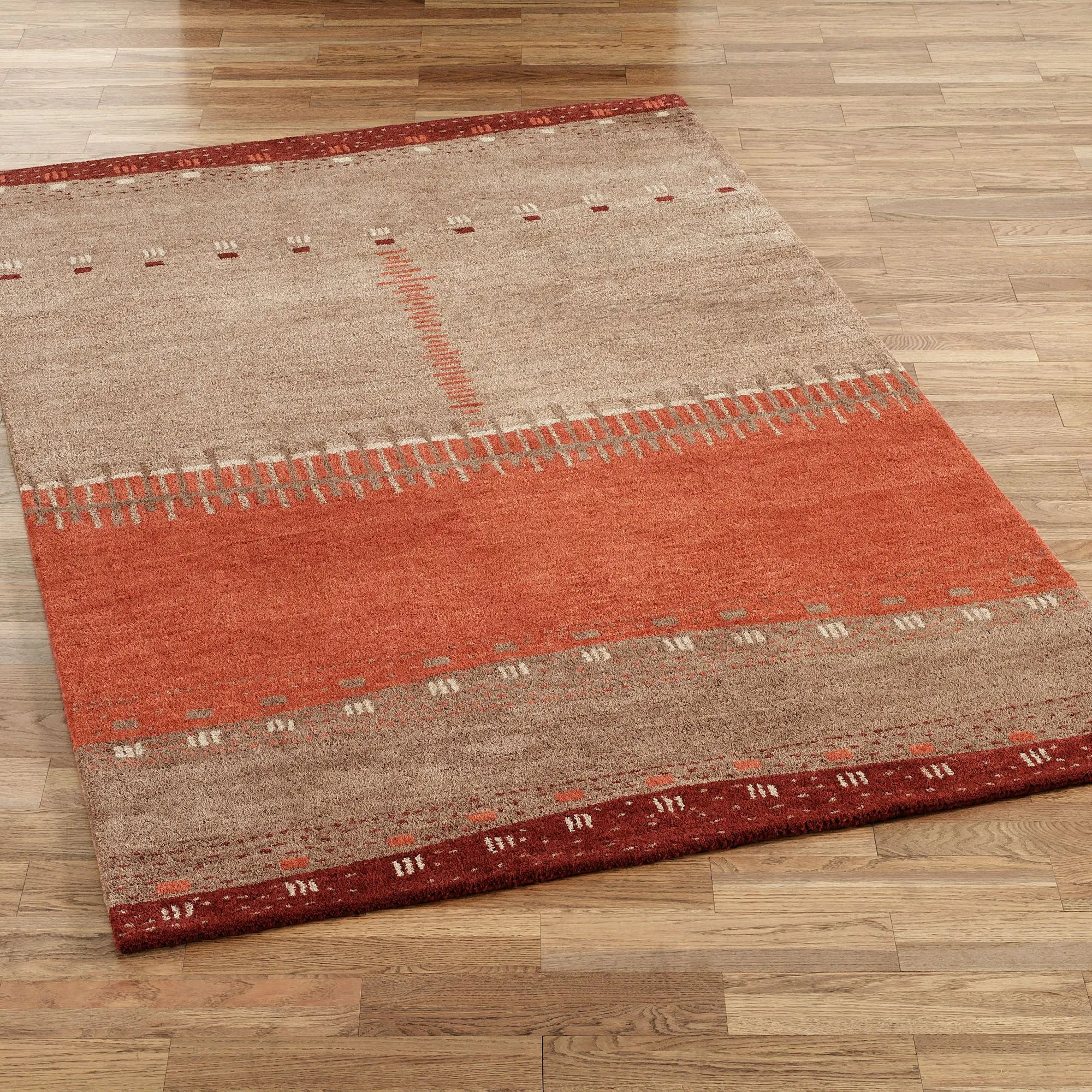 The handmade Path in Sand Area Rugs have a stylish Southwestern design that will really make your decor pop. Hand-tufted in India from hard-twist wool, these .625" thick area rugs feature large bands of color with unique dot and line accents where each band meets. Colors include brown, tan, burgundy, and deep vermillion. We recommend professional cleaning by a rug cleaner.