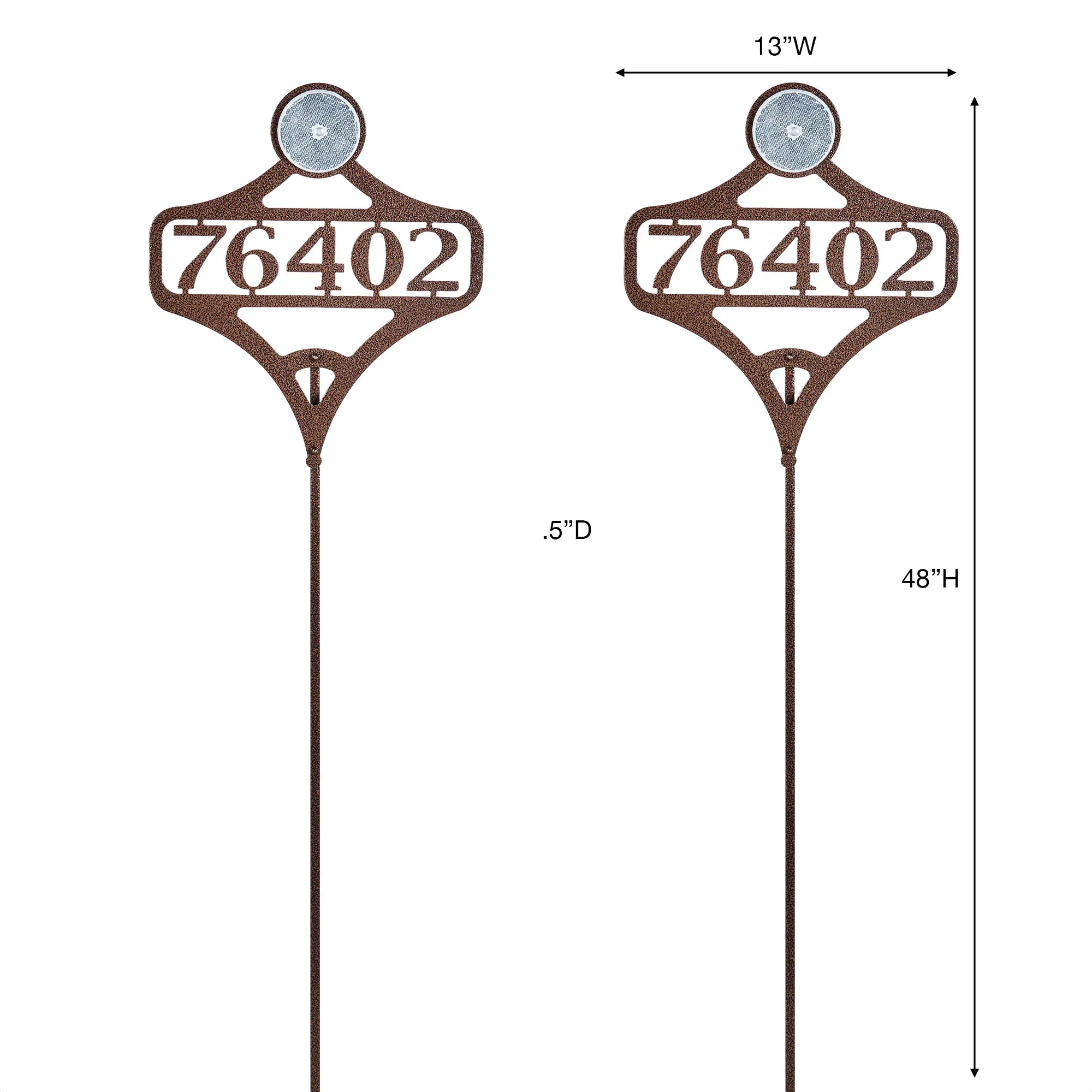 The Pathways Horizontal Personalized Reflective Driveway Marker Set proudly claims your space and guides guests in the right direction. Designed by JasonW Studios(R), each weathered bronze sign is finely handcrafted in the USA from precision-cut, 14-gauge steel and finished in a UV-, weather-, and tarnish-resistant powder coat fit for outdoor year-round use. Displaying your house address numbers or last name with up to five characters or spaces, each openwork staked marker features a curved design, center personalized information, and a double-sided disc reflector. The bright white acrylic disc, 3.75" dia., creates a bright reflection to capture attention. With a stake to secure the sign into the ground, each driveway marker measures 13"Wx.5"Dx48"H overall.
