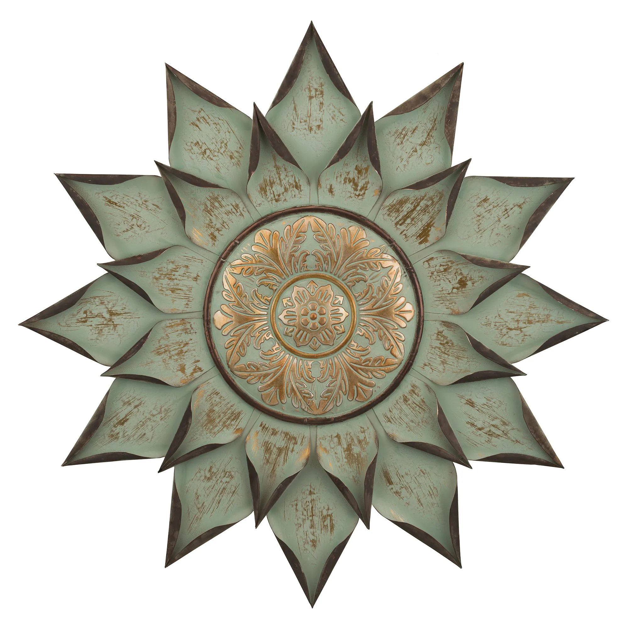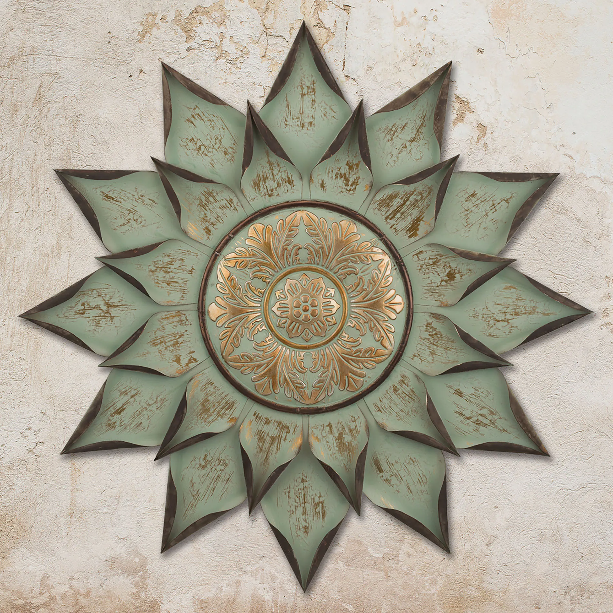Resembling a grand succulent or layered bloom, the Patina Blossom captures attention with vintage charm. With dimensional curled ends, the weather- and fade-resistant metal wall art features layered petals finished in sage with a weathered copper patina. A copper leafy floral medallion patterns the center with a timeless appeal. Perfect indoors or outdoors year round, the wall sculpture measures 35"dia.x2.5"D.