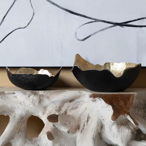 The organic shapes and undulating edges of the Patton Bowl Set add a modern appeal. Crafted from aluminum, the unique decorative bowls feature a bold dual-tone design with chic black exteriors and brilliant polished gold-finished interiors. Decorative use only. Perfect displayed together, alone, empty, or full of your decorative items, the set includes one small bowl, 12.5"Wx10.5"Dx5"H; and one large bowl, 16.5"Wx15.5"Dx8"H. Set weighs approx. 29 lbs.