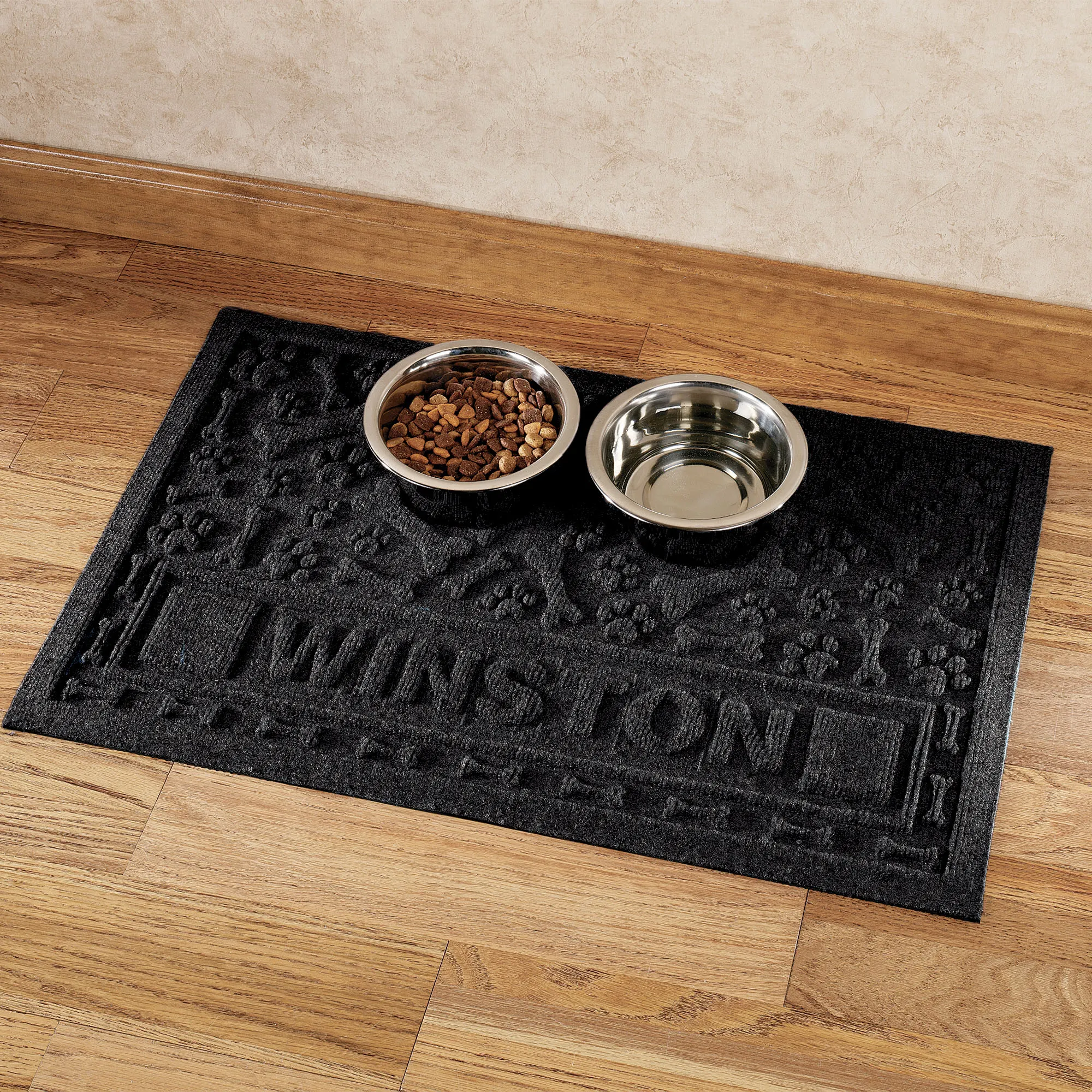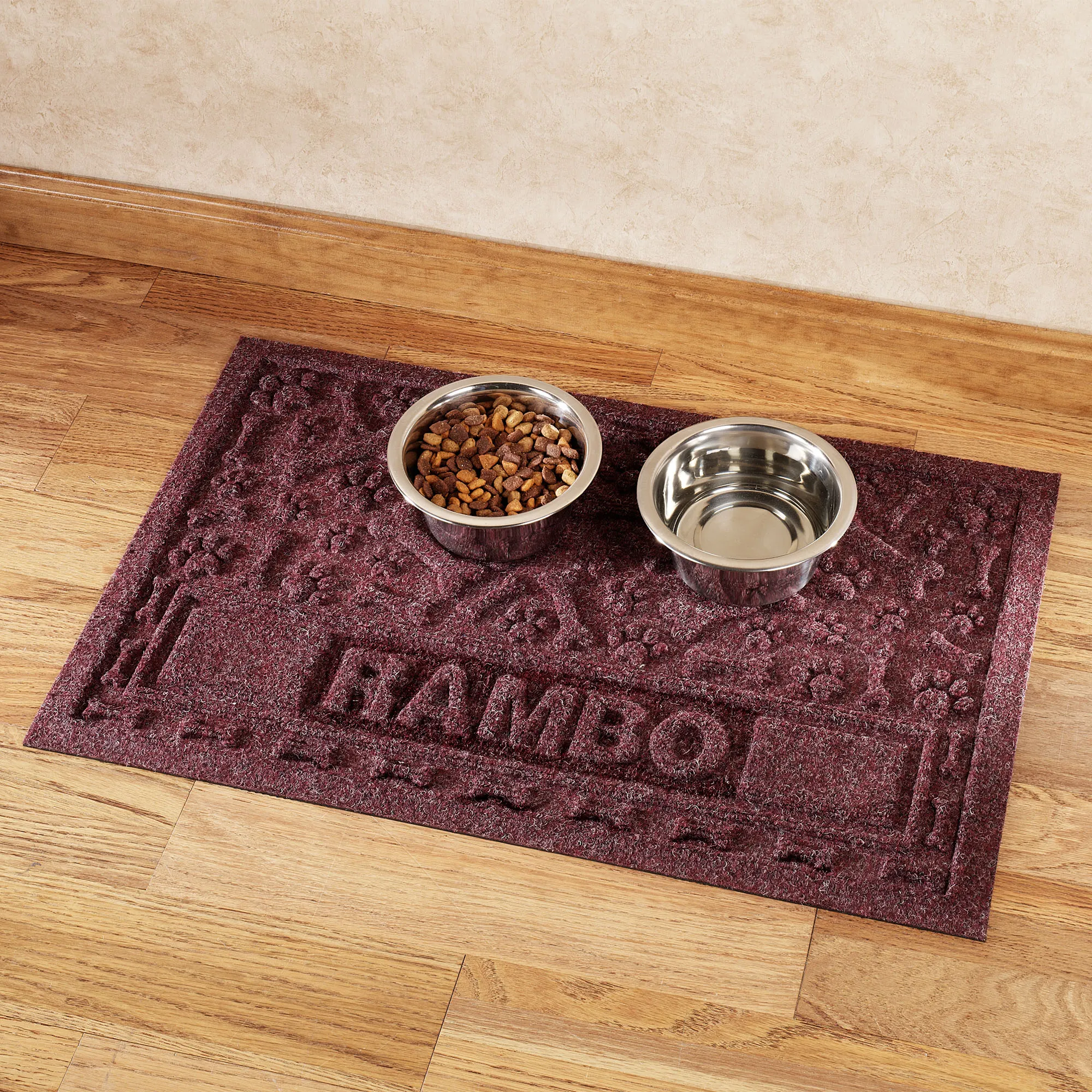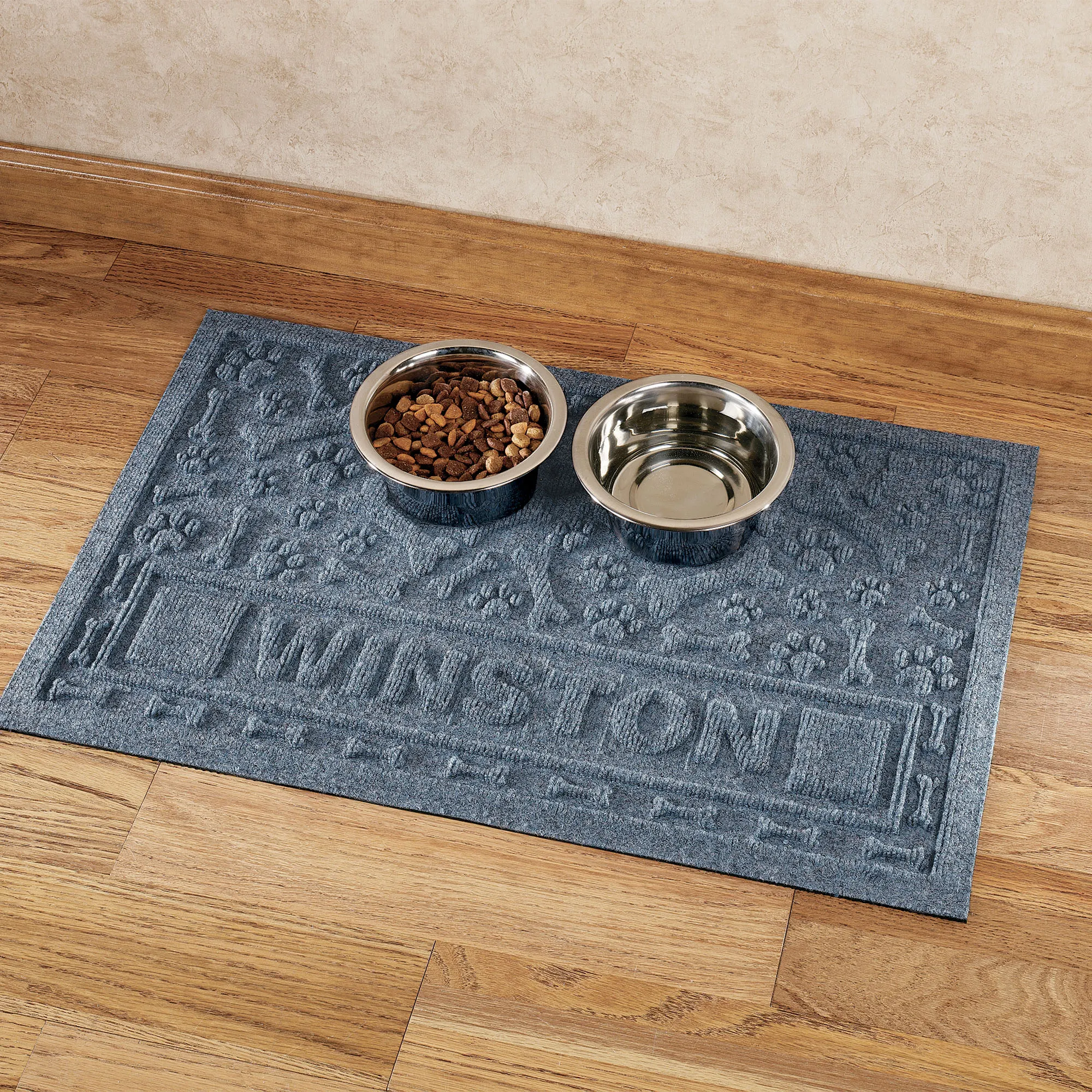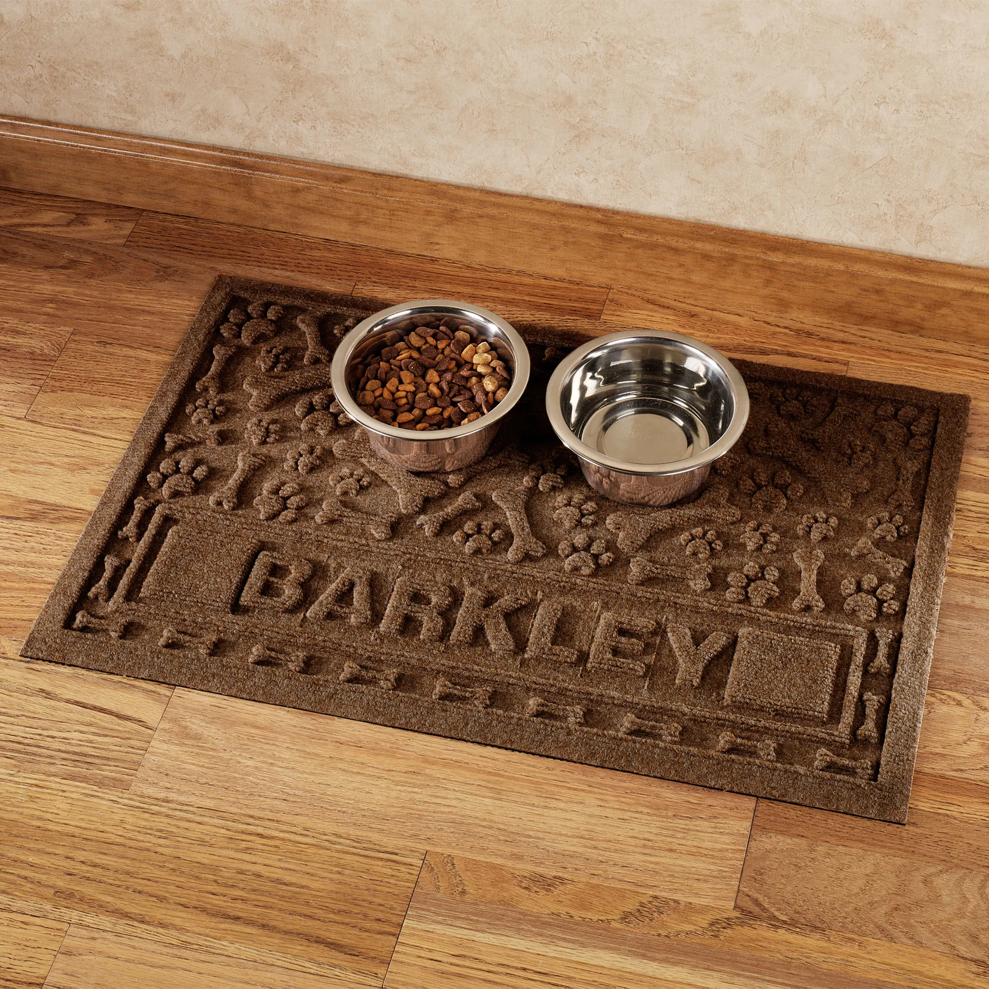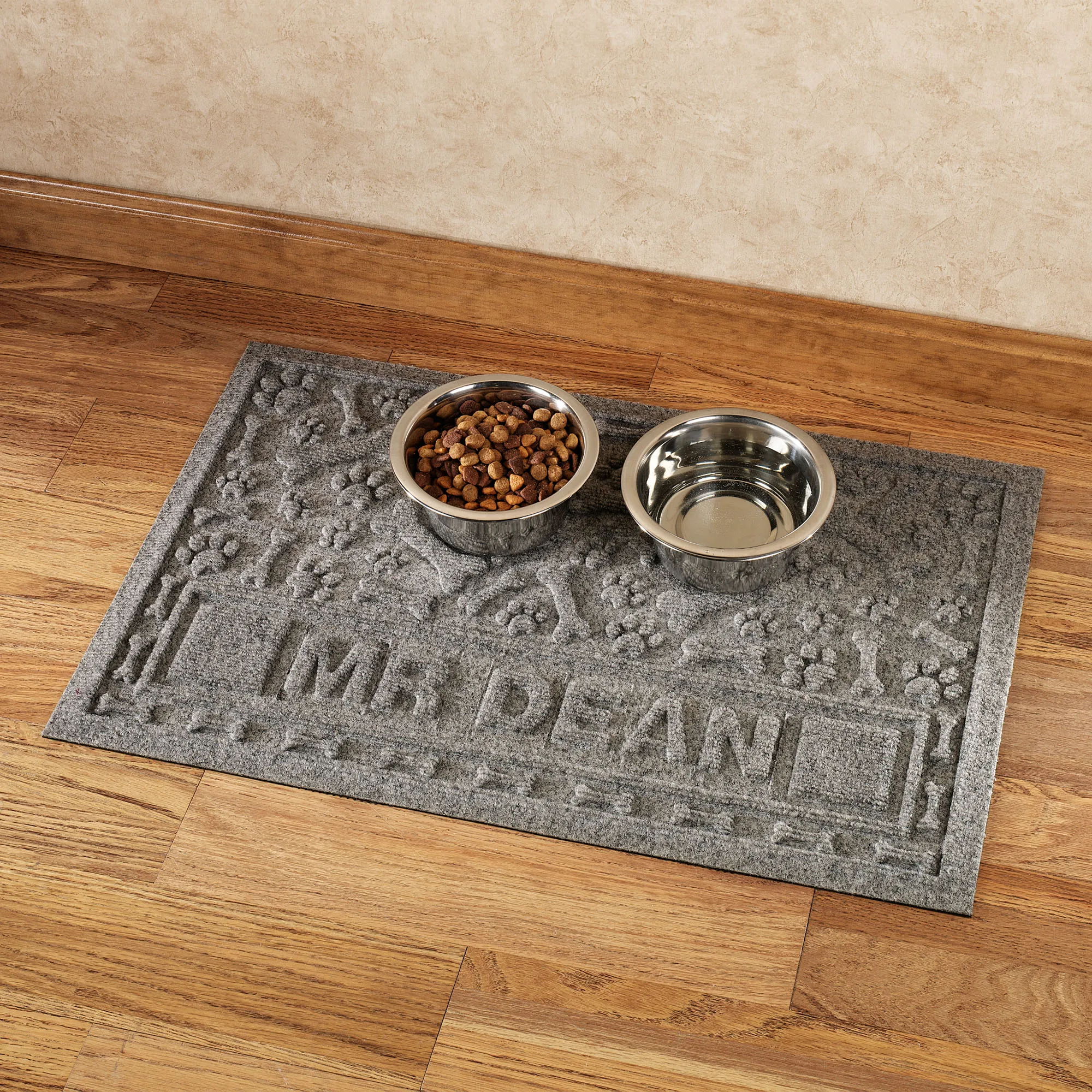 The Paws & Bones Personalized Pet Mat has a PET polyester fiber face and rubber backing. Made in the USA.