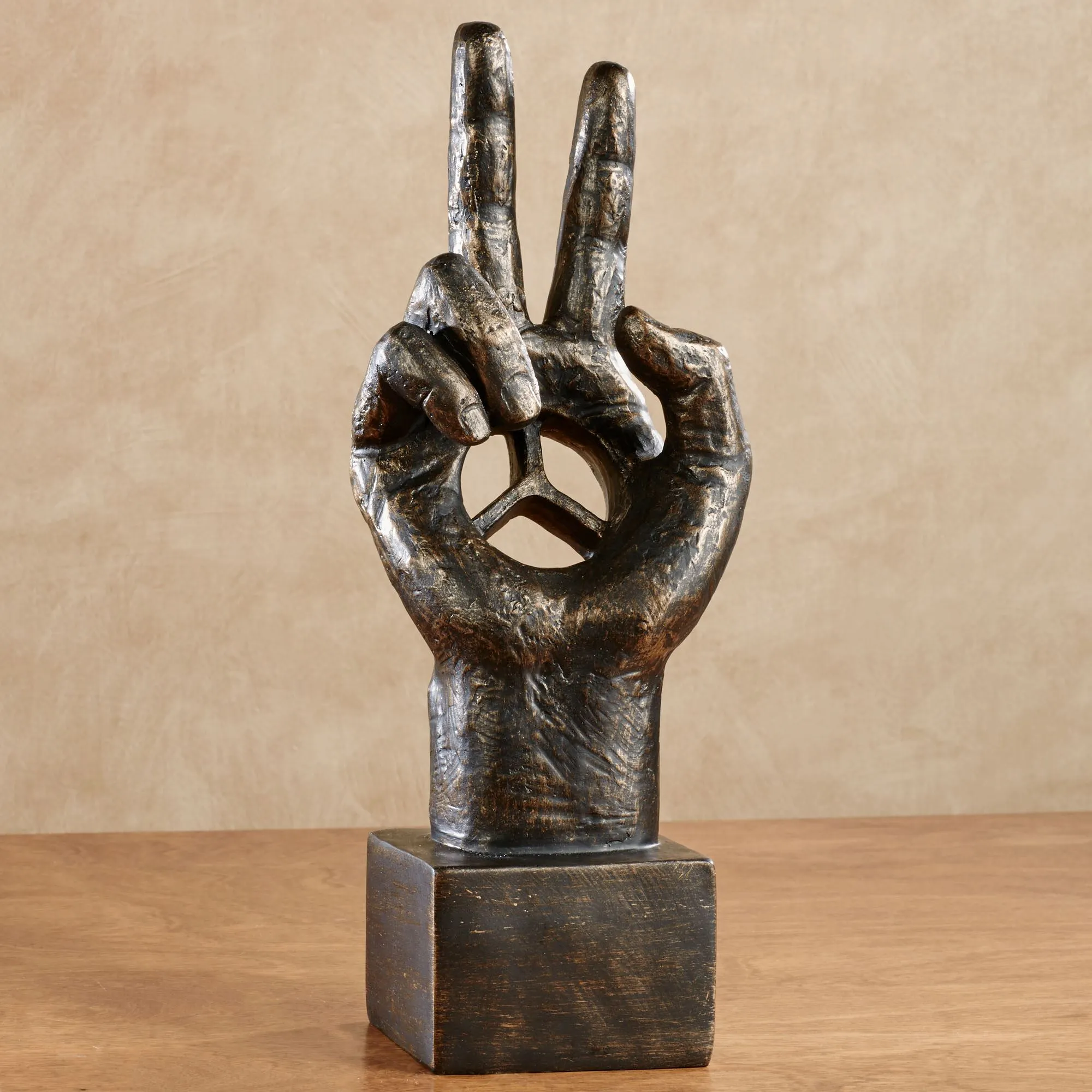 Good will, harmony, and understanding radiate from the simple gesture within the Peace Hand Table Sculpture. Highlighted in gold, the black resin sculpture features a block base and realistic hand with an openwork peace symbol. Measures 5"Wx4"Dx13"H.