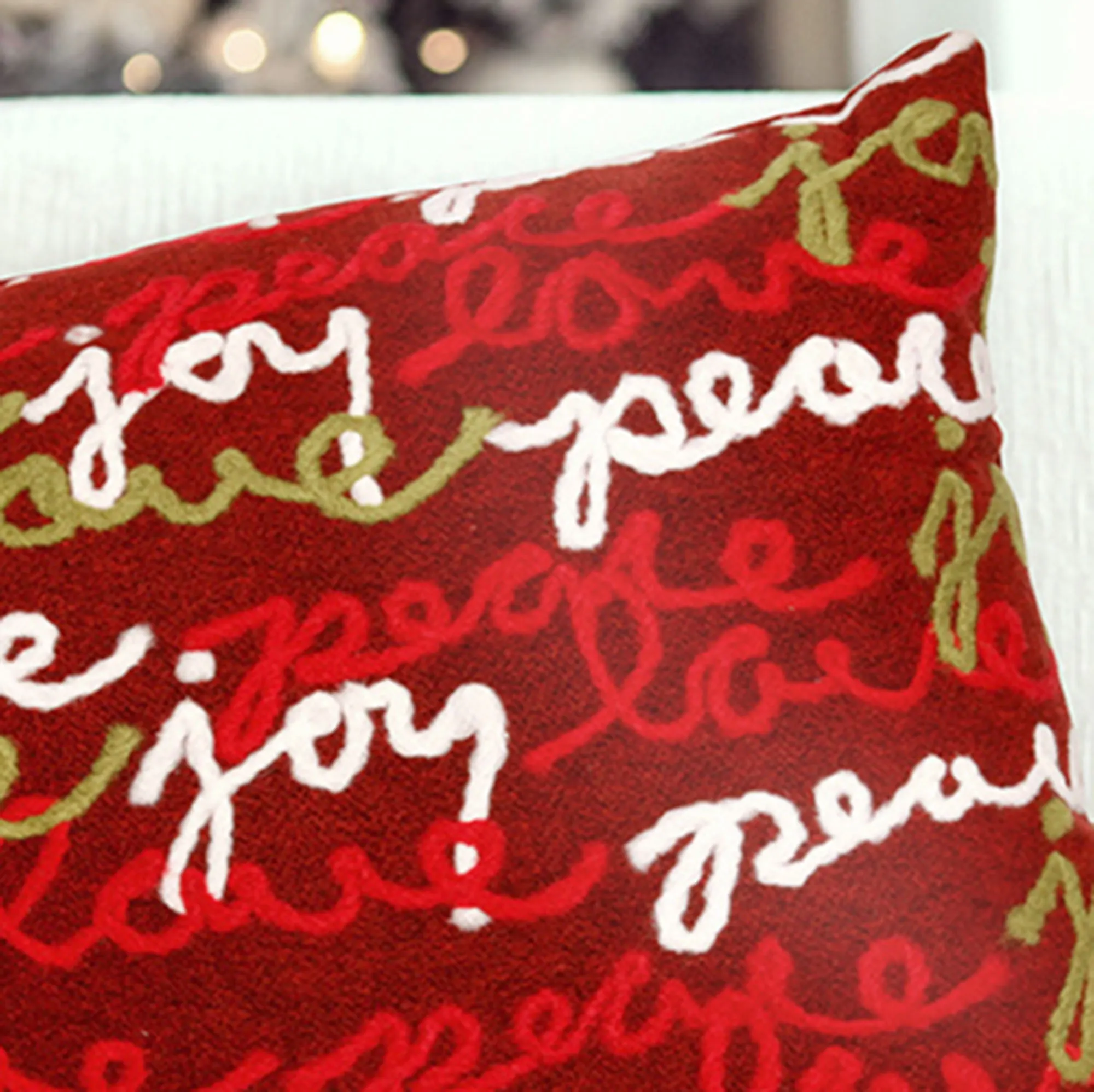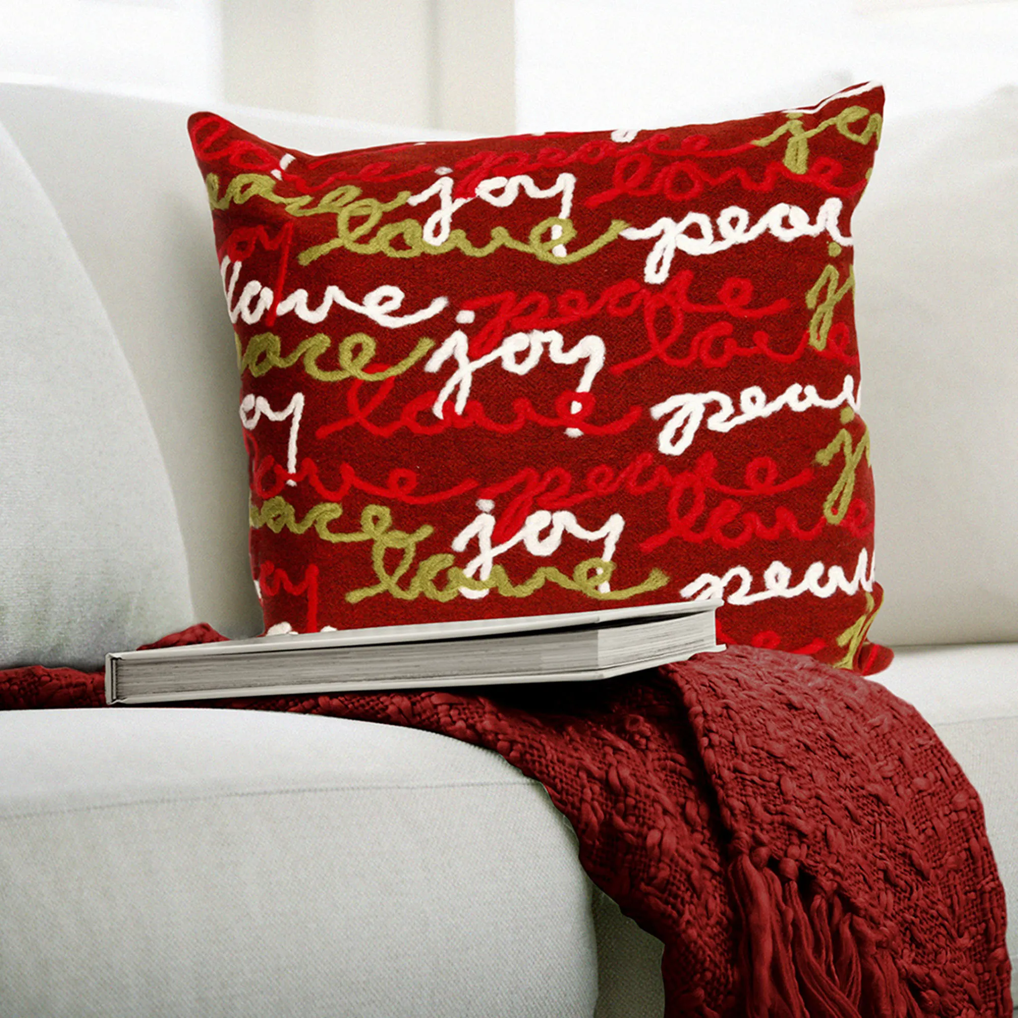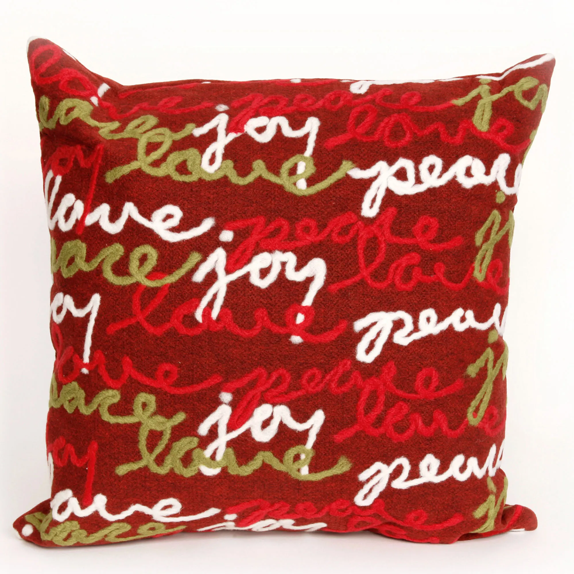 Embrace Peace, Love, Joy, and a festive feeling in your indoor or outdoor space with this charming holiday accent pillow. Designed by Liora Manne, the Everywear(TM) decorative pillow features a UV-stabilized, weather- and fade-resistant, handmade felted polyester design via the unique patented Lamontage process, which creates a tailored, highly detailed, dimensional effect. The red, green, and white "peace," "love," and "joy" decorate the red background in a handcrafted, hand-guided crewel work embroidery effect. Cover has a red felted polyester back, hidden zipper closure, and polyester fiber fill insert. Indoor or outdoor seasonal use. Square pillow is 20". Hand wash the cover; spot clean the insert. Imported.