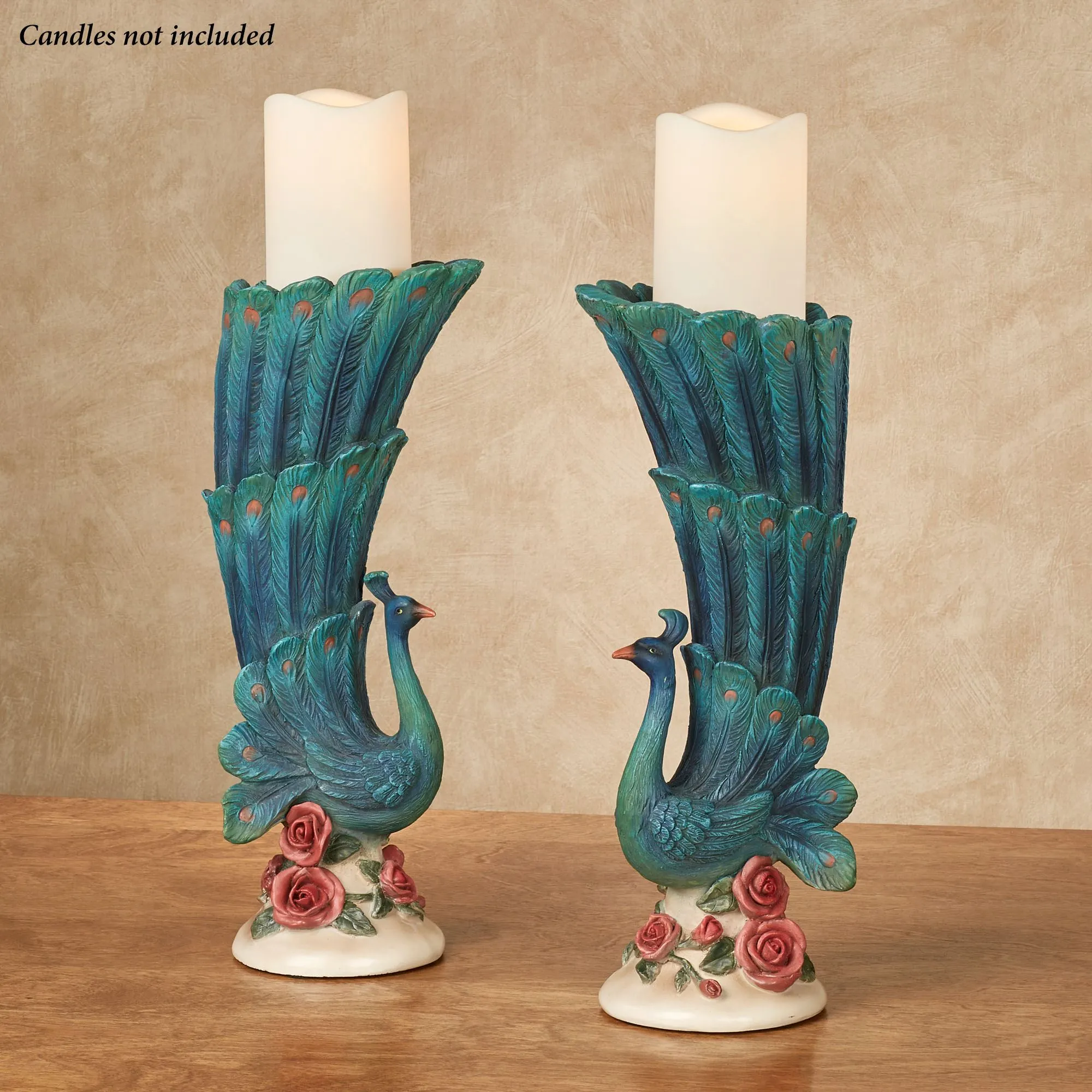 Hailing from the Peacock Garden, this majestic candleholder pair perfectly complements your decor with lush handpainted jewel tones. The detailed resin peacocks feature deep blue and green hues on their towering feathers as they stand among vining pink roses. Each holds your 3" dia. candle and measures 6.5"Wx5"Dx15"H.