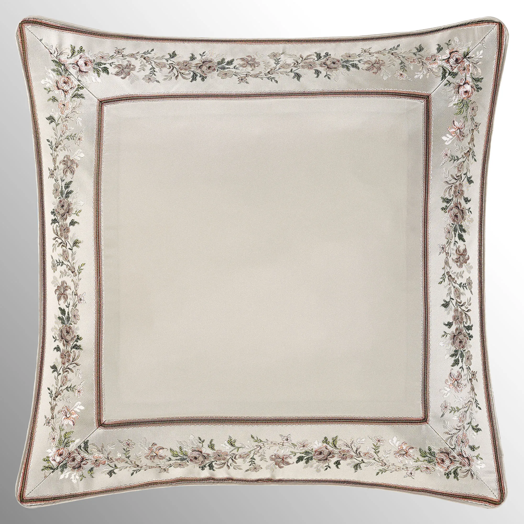 The mitred European Sham has woven floral and stripe designs, a solid silver center, piped ends, and a zipper closure; reverses to a woven floral design.