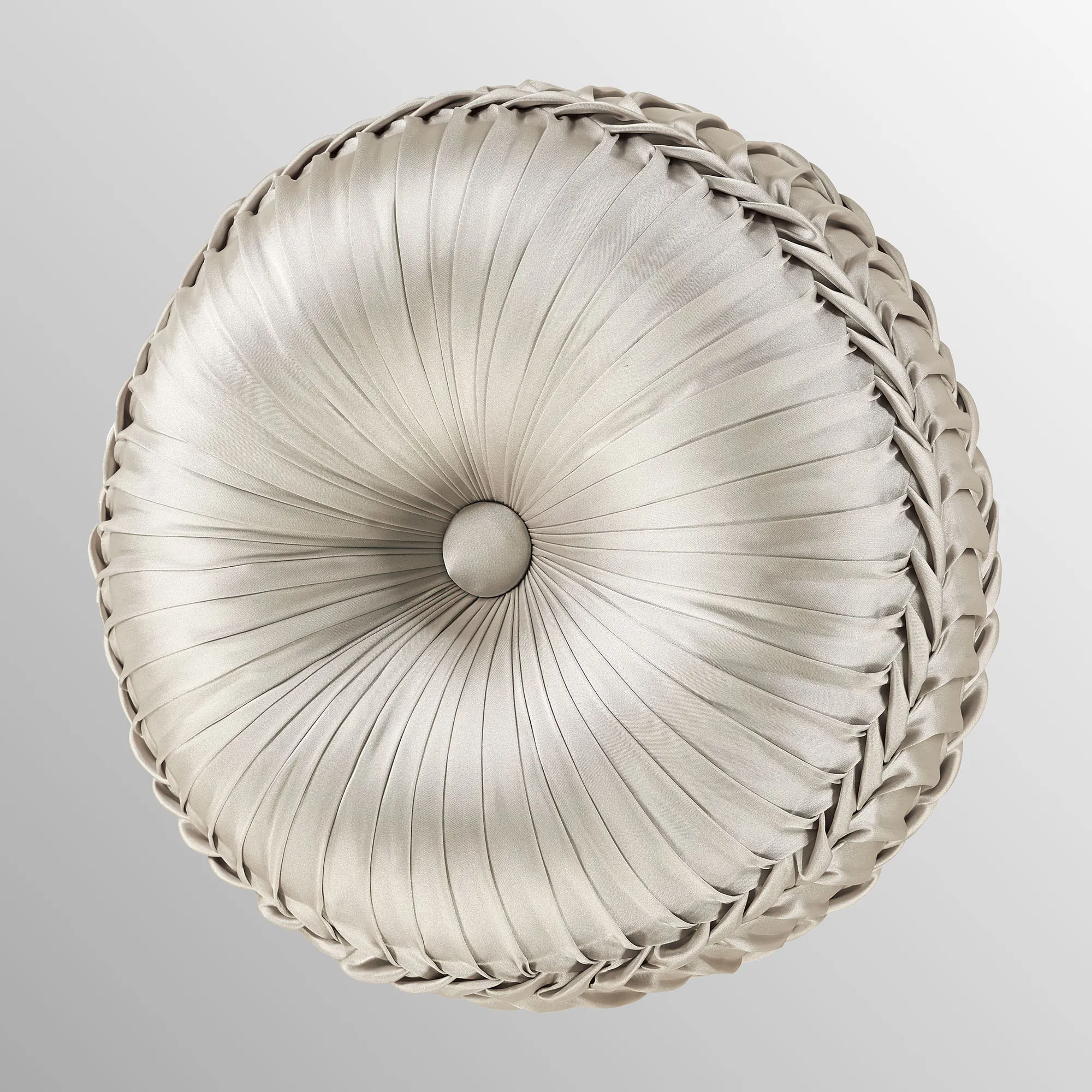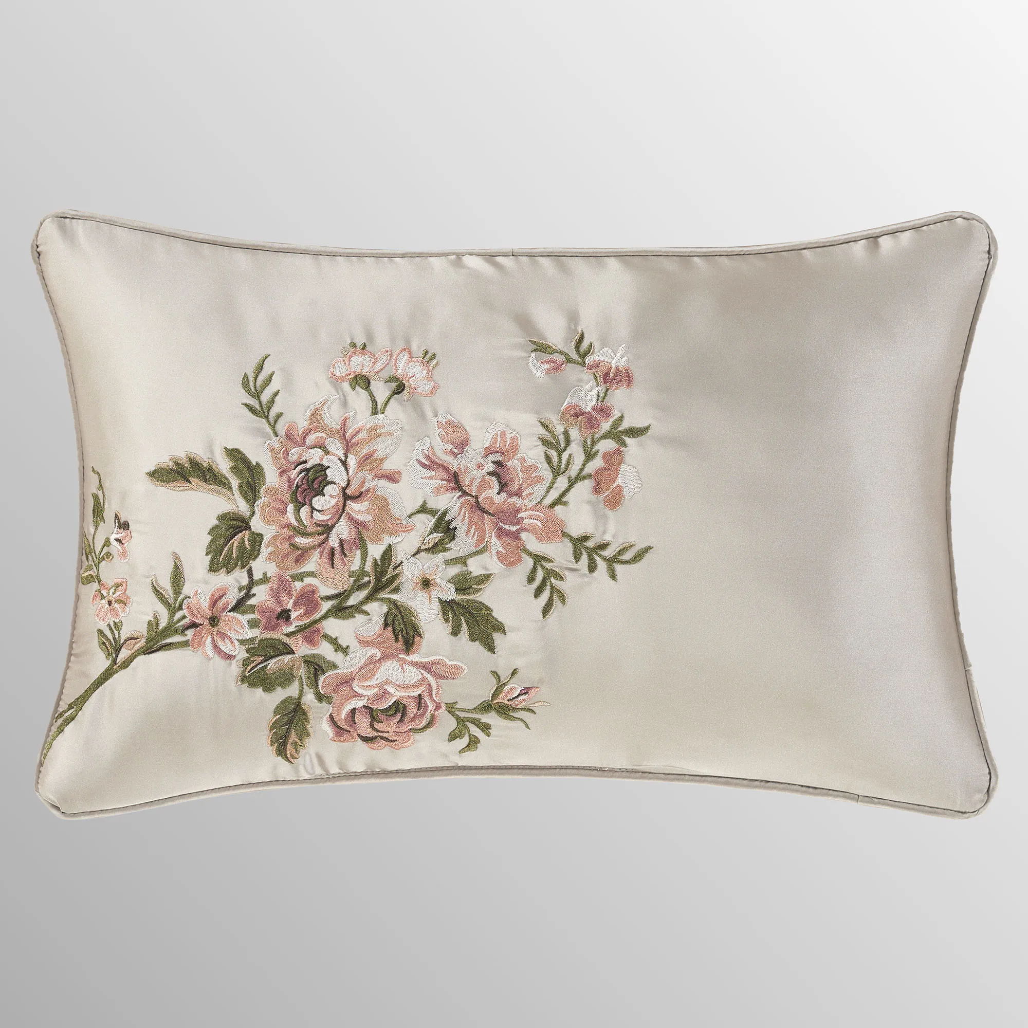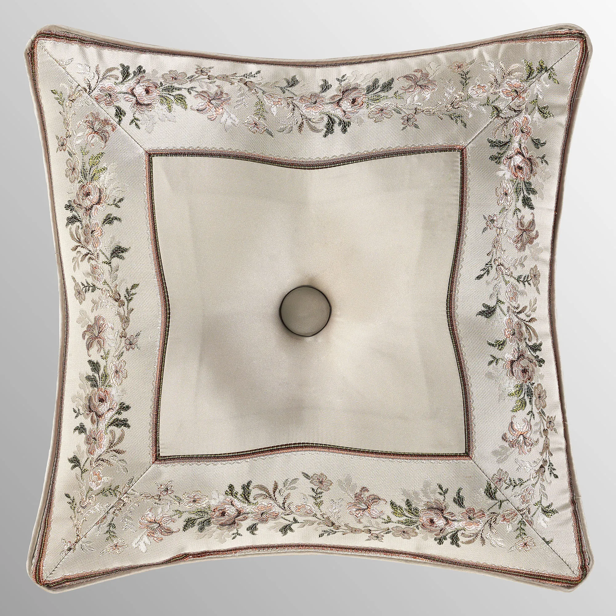Pillows: Spot clean. The solid silver Rectangle has embroidered florals and piped ends. The silver, reversible Round is handmade and has pleats, a button tuft in the center, and a 3" side gusset. The mitred 18" Square has woven floral and stripe designs, a solid silver center with a button tuft, and piped ends. The piped 20" Square has woven floral designs and reverses to a vertical floral stripe design on silver.