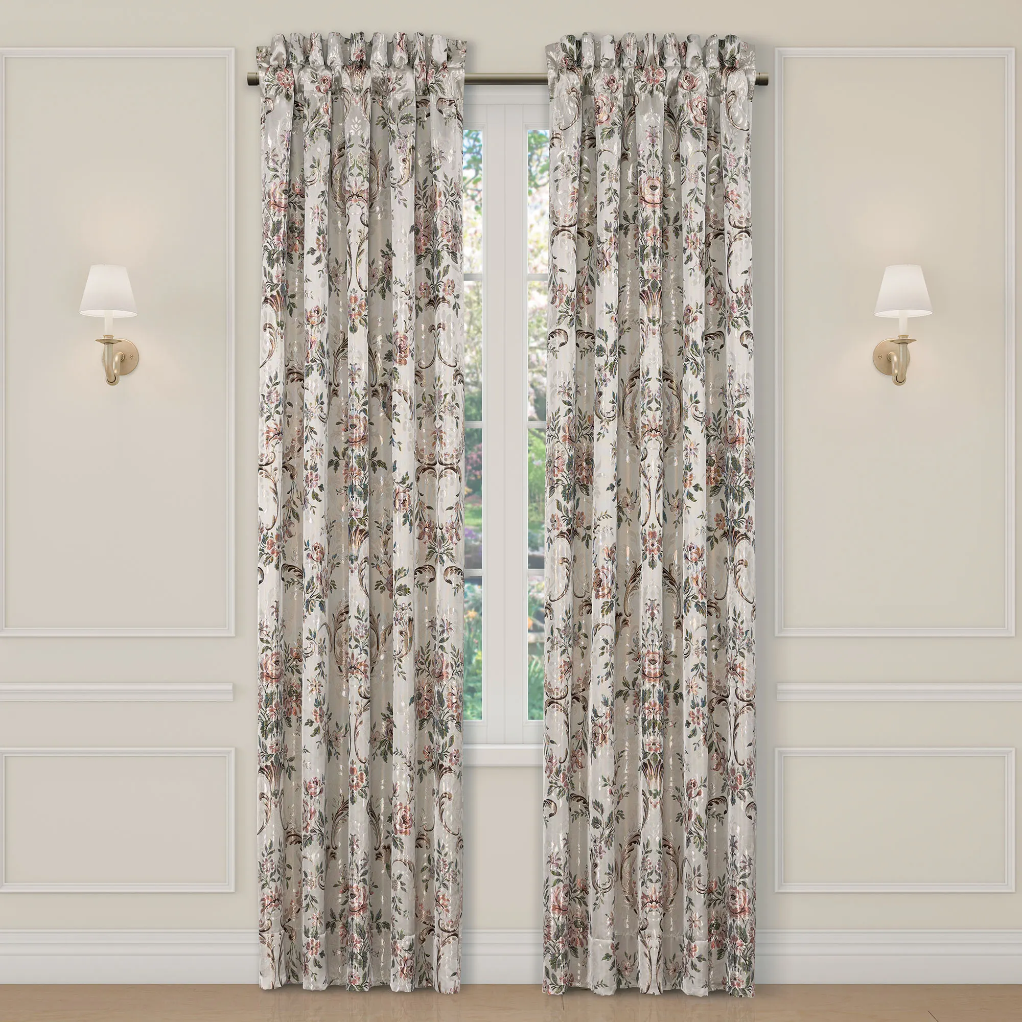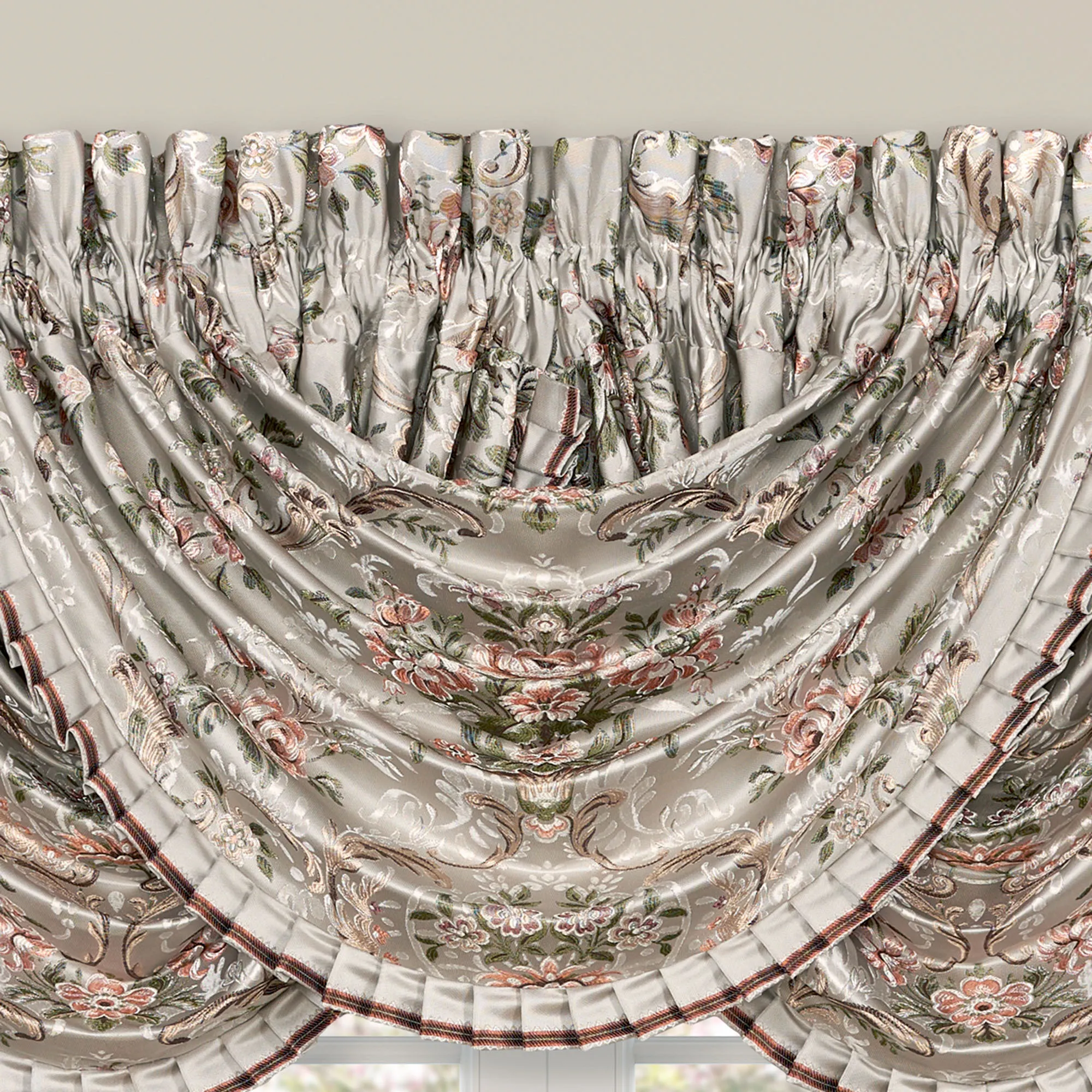 Lined Window Treatment has woven floral designs and 3" rod pockets. The tailored Wide Curtain Pair includes tiebacks. Each Waterfall Valance has a pleated bottom flange. We recommend one valance for every 12"-15" of window width.