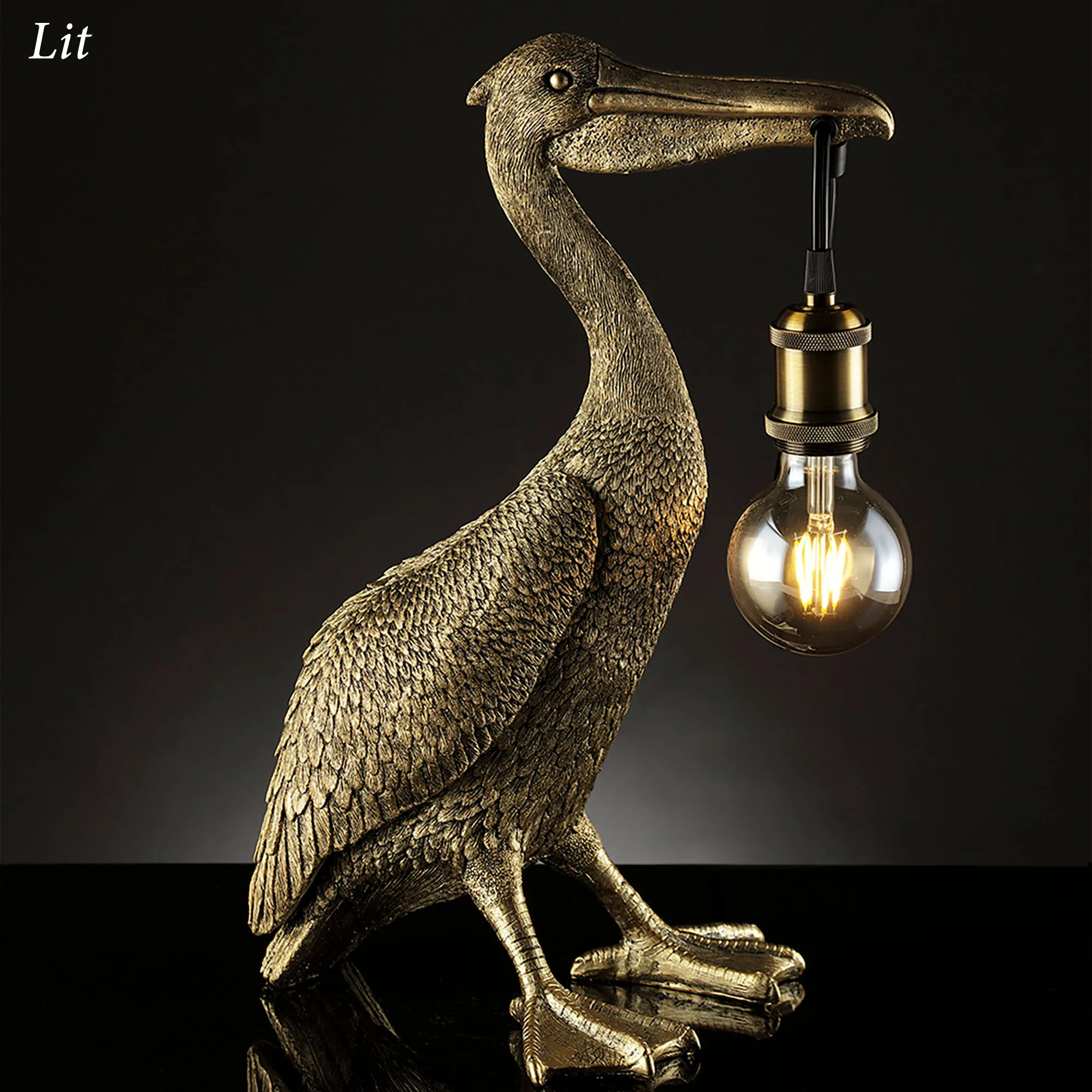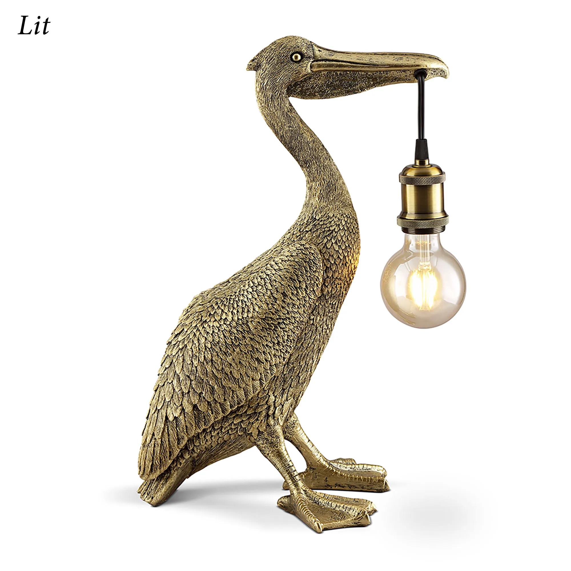 The Pelican Desk Lamp provides a whimsical seaside flair to your space. Finished in antique gold, the resin accent lamp resembles a detailed pelican sculpture clutching a wired light in its beak. Connected to a black cord with an on/off switch, the antique gold metal lighting element requires one 100W bulb that illuminates the pelican's textured feathers, feet, and face. UL listed. Perfect for those with a love of the sea, beach, fishing, or ocean wildlife, the pelican lamp measures 11.5"Wx8.5"Dx18"H.